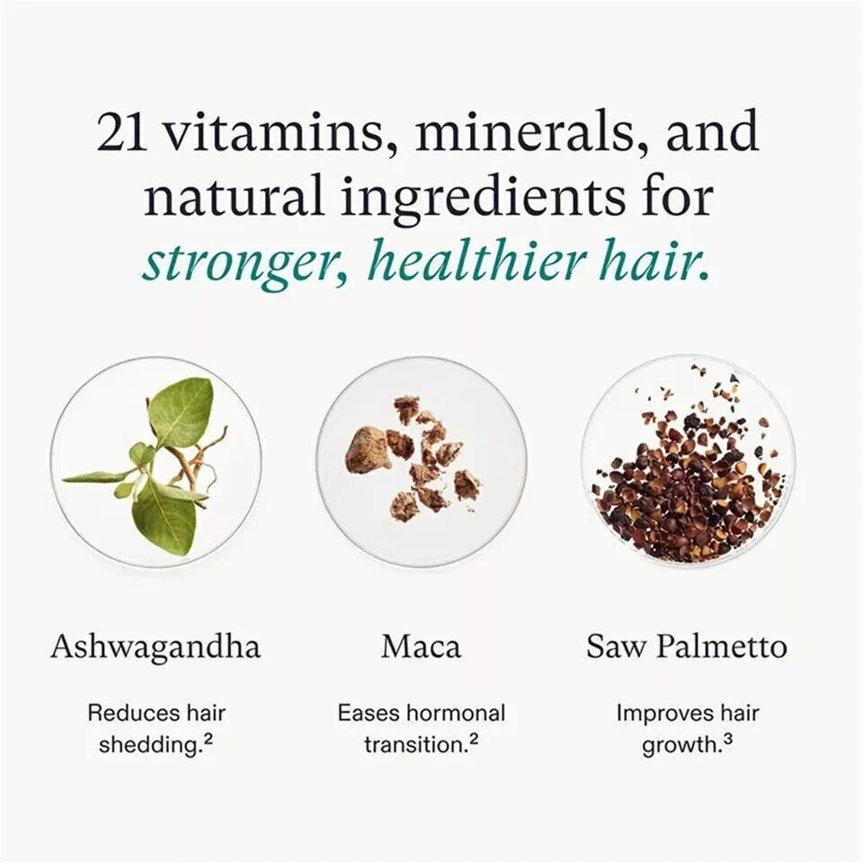 1-MONTH SUPPLY: One (1) bottle of Women's Balance Hair Growth Supplements for visibly thicker, fuller, stronger hair to support women through and beyond menopause (2) FOR WOMEN AGES 45 AND UP: Physician-formulated supplement that improves hair growth for women ages 45 and older by targeting 6 root causes of thinning hair including hormone shifts, aging and menopause changes RESULTS IN 3-6 MONTHS: Take 4 capsules once daily for visible results. In a clinical study, 93% of women felt their hair looked healthier after 6 months and 100% showed improved hair growth after 9 months (2) SCIENCE-BACKED INGREDIENTS: Featuring a proprietary blend of 21 vitamins, minerals, and natural ingredients, including Maca, Ashwagandha and Saw Palmetto