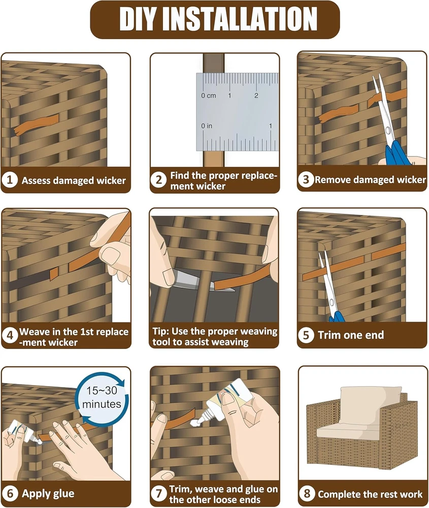 Store New Arrivals Add to Favorite View Feedback Contact 120 Ft Wicker Repair Kit, Plastic Wicker Repair Supplies, Gradient Dark Brown with Visible Mixed Color Stripes, Synthetic Rattan Replacement Material for Patio Wicker Furniture Repair Description Age Range Description Adult Is Customizable? No Pattern Striped Material Type Polyethylene Is Electric No Seat Cushion Quantity 1 Theme Wicker repair kit Type Sofa Chaise Frame Material Type Plastic Number of Pieces 1 Furniture Leg Color Gradient Dark Brown Room Type Patio Includes All Assembly Tools No Seating Capacity 1 Style Wicker furniture repair Brand Name Laphivieh Brand Laphivieh Seating Capacity 1 Required Assembly Yes Item Firmness Description Wicker repair kit Arm Style Straight Leg Style Solid Additional Features Wicker furniture repair Weight Capacity Maximum 250 Grams Back Style Wicker repair kit Furniture Leg Material Plastic Item Weight 0.55 Pounds Frame Material Plastic Material Polyethylene Special Feature Wicker furniture repair Weight Limit 250 Grams Has Removable Seat Cushion Cover false Assembly Required Yes Color Gradient Dark Brown Item Dimensions D x W x H 39.37"D x 39.76"W x 39.76"H Indoor Outdoor Usage Outdoor Material Features Synthetic, heavy-duty, waterproof, UV resistant, non-toxic, resistant to fading, cracking, and peeling Component Connector Assembly Not Required Style Name Wicker furniture repair Sofa Type Sofa Chaise Recommended Uses For Product repairing wicker patio furniture Seat Cushion Removability Attached Product Dimensions 39.37"D x 39.76"W x 39.76"H Product Care Instructions Wicker repair kit Size 0.55 Lbs ★[COLOR]: This wicker replacemenet material is not monochromatic but gradiant dark brown with mixed color stripes. ''Gradiant dark brown'' means this wicker's color is not consistant in only one brown color but mixed with cappuccino brown and espresso brown, and these two brown colors gradually transitions along with the wicker strand. ★[DIMENSIONS] Width = 8mm; Thickness = 1.2mm; Length = 120 ft; Weight = 0.55 lbs. This is a flat-shaped wicker, not round or half round either. ★[WICKER REPAIR KIT]: Save money and time with fun by fixing your patio furniture yourself and improve the value of your lawn furnitue while protecting your investment. You can also have fun to create some innovative DIY gadgets or art crafts like flower basket, food basket etc with this plastic wicker material. ★[HEAVY DUTY]: Synthetic plastic, 100% virgin polyethylene (PE), not natural rattan, high strength, waterproof, UV resistant, non-toxic, resistant to fading, cracking, and peeling, ensuring long-lasting use. ★[WARM TIPS]: This wicker's color may not exactly match your damaged wicker, but you can match the color either by spray painting the wicker or cut properly per your needs. In most cases a pretty close match wicker material can always blends in nicely with your originals. Product Description Wicker patio furniture adds a simple but elegant, woven touch to your outdoor living space if you are able to maintain it properly. It can be easy for you to do a basic repair, or a larger repair project with our wicker replacement material! Your wicker furniture will stay in top shape if you take good care of it. [Material] : Made of 100% virgin polyethylene [Color] : Gradiant Dark Brown with visible mixed color stripes [Overal length] : 120 feet [Width] : 8 mm ( 5/16 inch ) [Thickness] : 1.2 mm ( 3/64 inch ) [Weight] : 250gram ( 0.55 lbs ) Laphivieh Plastic Gradiant Dark Brown Wicker Supplies Revive your patio wicker furniture with a new modern stylish look! [Quality Material] Commercial-grade 100% virgin polyethylene with ultra violet inhibitors manufactured into the product, non-toxic, no harsh chemicals or hazardous impurities, safe around children and pets. [Heavy Duty] Resistant to fading, cracking, and peeling, ensuring long-lasting use. [Easy DIY] Save cost and time with fun by fixing and reviving your patio furniture with a modern, sleek and stylish look! [Tips #1] Please consider to use glue, nail gun or hot glue gun to join two pieces of wicker or attach wicker onto the frame. [Tips #2] Please kindly note that the color of this plastic wicker may not be exactly the same as that of the wicker furniture you are trying to repair. You may match the color by spray painting. [Tips #3] Remove one damaged wicker strand at a time and replace it before removing other damaged pieces. This makes it easier to keep the weaving pattern consistent with the original. [Tips #4] This wicker material is not monochromatic but gradient dark brown with visible mixed color stripes. [Tips #5] ''Gradiant dark brown'' means this wicker's color is not consistant in only one dark brown color but gradually varies along with the wicker extends. [Tips #6] Color chromatic aberration may exist due to different display monitors. [Tips #7] Slight deviation in dimensions may exist due to manual measurement. Steps to Repair Wicker Furniture Step 1. Identify the damaged wicker Assess the damages you need repair and determine how extensive the damaged wicker is and thus how much wicker replacement material you need. Step 2. Find proper replacement wicker Your wicker furniture can be made of either natural or synthetic plastic wicker. So identify what type of material of your damaged wicker is first, and then measure the size (width / thickness etc) of your damaged wicker and then get a match as close as possible. It might be difficult to find a perfect match especially for the color but in most cases a pretty close match wicker material can always blends in nicely with your originals. Step 3. Remove damaged wicker Observe and take note of the original weave pattern in case you might not recognize it when you weave the new wicker back in. Now start from the first damaged wicker strand, cut it and pull it out with your hand or other proper weaving tools. Our stainless steel weaving tool ( ASIN B0B3XSPZ18 ) can be a very handy option to assis