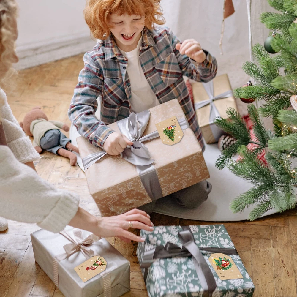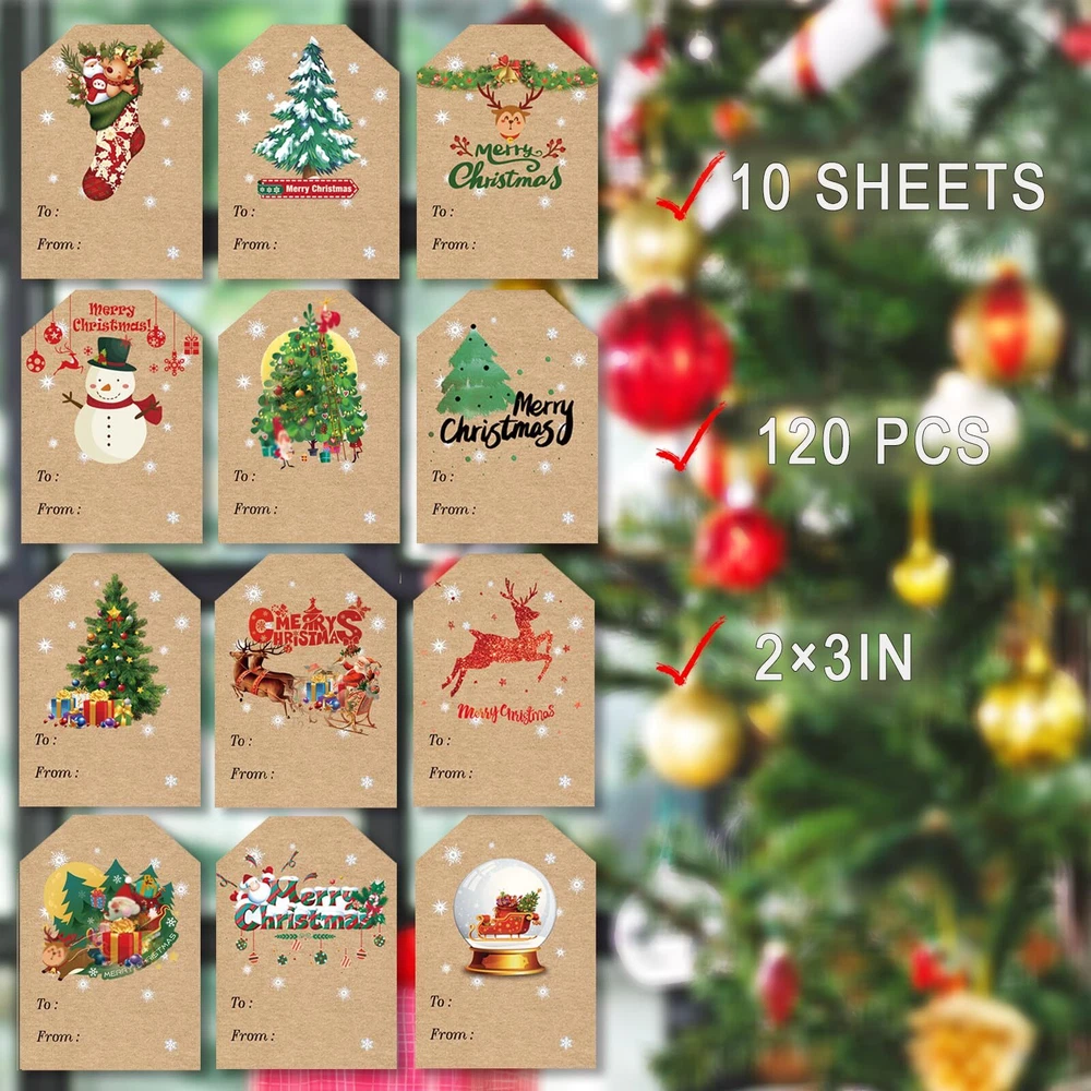 Package includes: Each sheet in this bundle of decorative holiday gift tag stickers Includes 10 sheets (10 sheets each of 12 themes) for a total of 120 sticker gift tags. Wide application: these Christmas labels contain various Christmas elements, such as snowflake, Santa, Christmas tree, Christmas stocking, blessing words and more; You can stick Christmas tags on gift boxes, gift bags, envelopes, snack bags and so on. Appropriate size: Each gift tag stickers measures 2" Wide x 3" Long, the sticker tag has plenty of room to write the names of the recipient and gift giver, putting a perfect final touch on each present this holiday season. Enliven Christmas atmosphere: Christmas is the time for family gatherings, merriment, gift exchanging and elaborate home decorations, and people will love these Christmas tags for gifts and it will be sure to create a warm and festive atmosphere around your house. Easy to use: Christmas gift self-adhesive labels with good quality printing, smooth to write and your writing is not easy to rub away. These removable adhesive tag leaves no trace, easy installation and remove without leaving residue, they will not affect your gift packaging while decorating your gift.