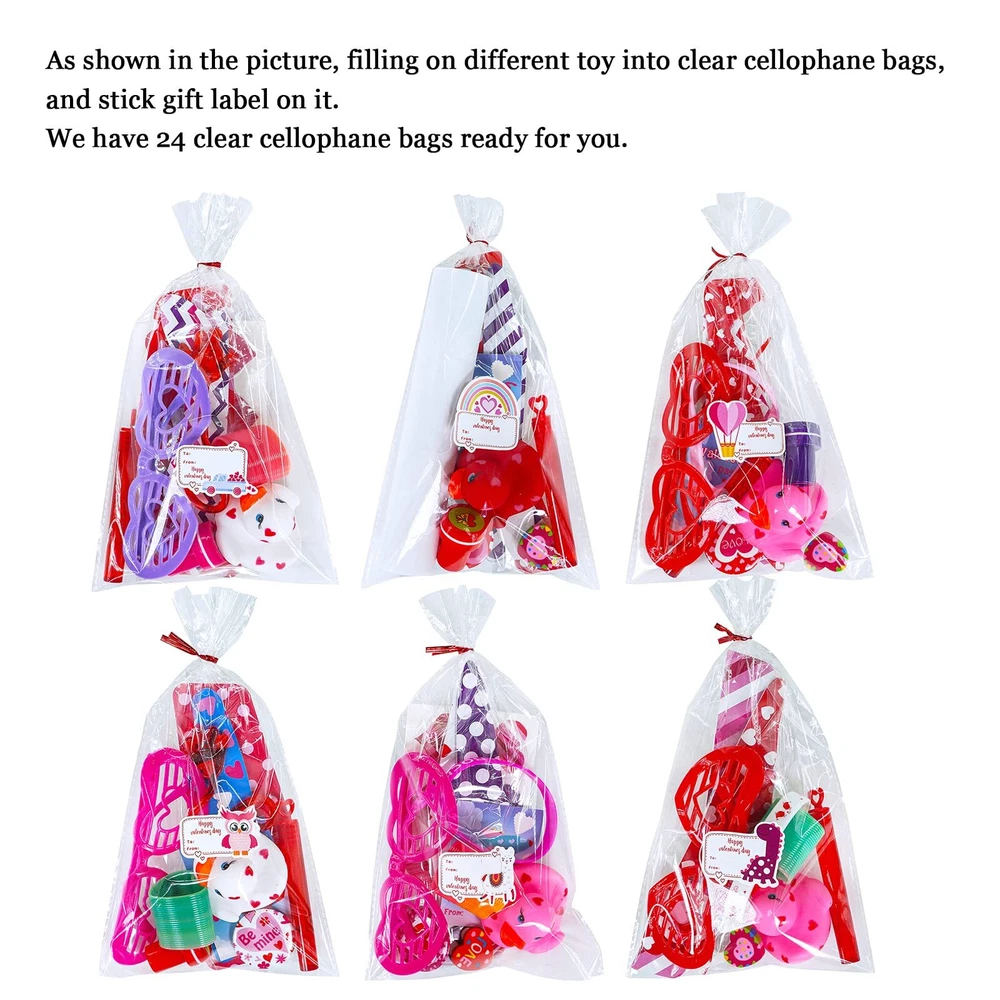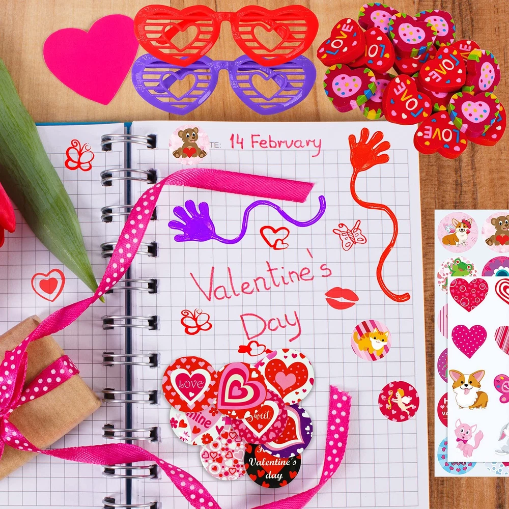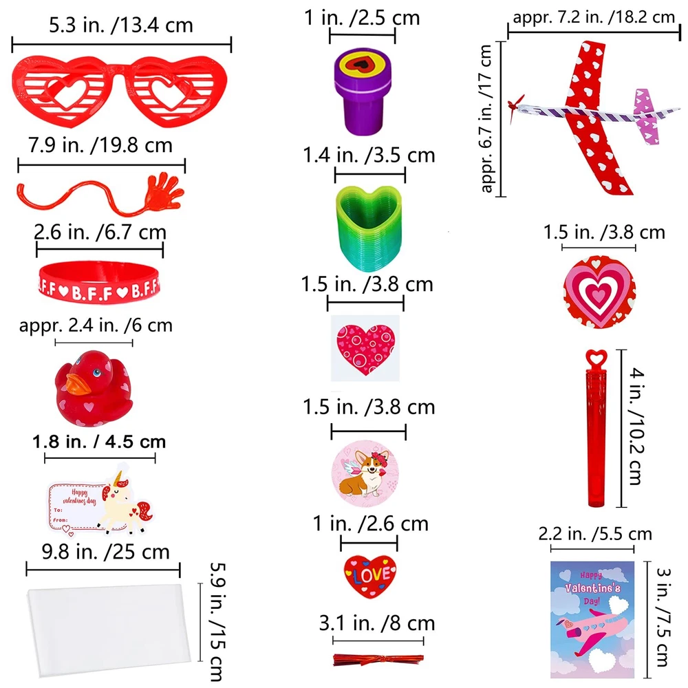 Valentine's Day Stationery Toy Assortment Set: 8 pcs Valentine gliders, 8 pcs gift exchange cards, 8 pcs Valentine stampers, 8 pcs Valentine rubber ducks, 8 pcs Valentine rubber bracelets, 8 pcs Valentine shutter glasses, 8 pcs heart-shaped coil springs, 8 bubble tubes, 8 Valentine buttons, 16 pcs heart erasers, 16 pcs Valentine sticky hands, 8 Valentine temporary tattoo sheets (128 pcs), 8 Valentine sticker sheets (192 pcs), 3 gift sticker sheets (24 pcs), 24 clear plastic bags, 24 twist ties. Size: Valentine gliders: 7.2" long. Valentine stampers: 1" in diameter. Valentine rubber ducks: 2.3" wide. Valentine bracelets: 2.6" circ. Valentine shutter glasses: 5.2" long. Valentine coil springs: 1.3" in diameter. Valentine bubble wands: 4" x 0.2". Valentine buttons: 1.5" in diameter. Valentine gift cards: 3" x 2.1". Valentine erasers: 1" in diameter. Sticky hands: 7.8" long. Valentine tattoos and stickers: 1.5" in diameter. Cellophane bags: 9.8" x 6". Twist Ties: 3.1" long. Color & Designs: In bright Valentine colors of red, pink, purple, blue, white, yellow, and green, these Valentine toys for kids feature vibrant print and cute Valentine's Day sayings, including assorted heart patterns, dog, cat, rabbit, bear, frog, ladybird, butterfly, ice cream, flower, cupid, rose, lip prints, cupcake, gift box, heat balloon, love letter, plane, "I LOVE YOU", "You're My Sweet", "YOU ROCK", "love", "HAPPY VALENTINE'S DAY", "CUTIE PIE", "B.F.F", "XOXOXO", "Be Mine", "Kiss Me". Material: These assorted Valentine party favors for kids are made from foam, plastic, rubber, paper, vinyl, metal, and cardstock. They are safe and non-toxic toys which have tons of fun, perfect to hand out as an alternative to candy Valentine's gifts for kids or give them out as Valentine's Day party favors. Fun and safe to use, this Valentine party favors set with great variety is perfect for many gifting occasions. Hand these cute toys out as an alternative to candy Valentines gifts for kids. Perfect for kids valentine crafts, kids Valentine's Day exchange, class Valentine's Day prizes, valentines goody bag stuffers, kids Valentine's Day party favors, valentines party pack, Valentine's Day school treats, valentines giveaway, birthday party favors and more.