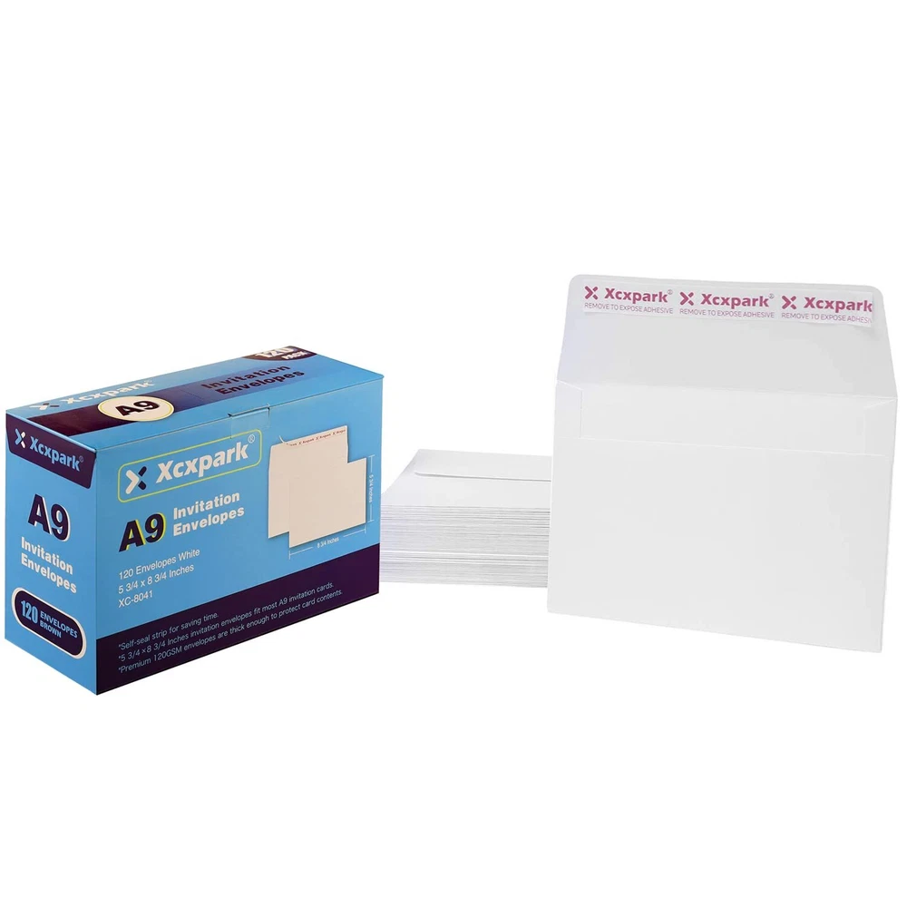 120 Qty Printable A9 Invitation Envelopes for 5.75x 8.75 cards to make your invitation more professional and impressive!You’ll get 100 packs A9 invitation envelopes in dimension of 5.75x 8.75 inches. These invitation envelopes are made of high quality 120GSM white paper with clean look to make your invitation more professional and official.●WIDE APPLICATION - The A9 envelopes are great for invitations, papers, CD, photos, documents, wedding invitation, birthday, baby shower.●EASY TO SEAL AND PEEL - The self seal design offers a strong and convenient sealing without water, glue or licking the envelopes.Why the white envelopes will be a great choice for you?✔Made of high quality 120GSM white paper to stay flat all the time without damage and curl.✔Printable, you can print the content you want to make your invitation more special and impressive.✔Thicken A9 invitation envelopes, totally invisible and never worrying about the contents being exposed.Specification:Material: 120GSM paperDimension: 5.75x 8.75 inchesSealing: Self sealPrintable: YesColor: whitePackage Content:100x Printable A9 Invitation EnvelopesNO RISK PURCHASE - Feel free to us for any issue. 120PACK A9 ENVELOPES BULK - Package includes 120 PCS A9 invitation envelopes in dimension of 5.75x 8.75 inches and it’s with 5.75x 8.75 cards, great A9 envelopes are great for invitations, papers, photos, documents, wedding invitation, birthday, baby shower. HIGH QUALITY MATERIAL - Reject the cheap paper material! All the A9 invitation envelopes are made of high quality 120GSM white paper to keep the cards, papers or documents stay flat all the time, no any damage and curl, the envelopes are made to last. EASY TO SEAL AND PEEL - No water and glue is required, more important, you don’t need to seal the envelopes by licking the envelopes. These A9 envelopes are with self seal design to offer a strong and convenient sealing, while a convenient paper strip for gently to peel. THICK AND INVISIBLE - The invitation envelopes are with thicken design for more wear-resistance to offer a max safety for the inner documents or cards, heavy duty, 120 GSM/32lb BOND/80lb TEXT. Totally invisible to protect your privacy, never worrying about the contents being exposed. WITH PRINTER - Printable A9 invitation paper envelopes, you can print the content you want with your Laser and Inkjet Printers to make the invitation envelopes more professional and delicate, making your invitation more special and impressive.