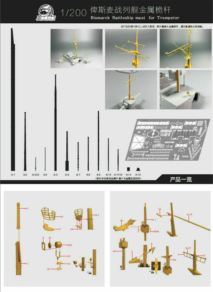 1/200 German Battleship Bismarck Metal Mate Detail-up Part for Trumpeter 03702 1/200 German Battleship Bismarck Metal Mate Detail-up Part for Trumpeter 03702 Package Included: A Set of Metal Main Mast A Set of Metal Ship's Bell A Set of Metal Fore&Aft Flagpole (The Model is not included,only for display.) Specifications: Material: Metal Scale:1:200 Feature: Compared with original plastic barrels, our aluminum main-cannon is extremely meticulous and durable. Every photo takes in practical circumstance, and it enriches original kits with abundant details and realistic effect. Payment Delivery details Terms of sales Feedback Contact us Payment Special financing available Select PayPal Credit at checkout to have the option to pay over time. Qualifying purchases could enjoy No Interest if paid in full in 6 months on purchases of $99 or more. Other offers may also be available. Interest will be charged to your account from the purchase date if the balance is not paid in full within 6 months. Minimum monthly payments are required. Subject to credit approval. The PayPal Credit account is issued by Synchrony Bank. Delivery details 1.We do everything we can to ship your orders out as soon as possible. 2.Shipping & Handling >>>For American orders, it normally takes 7-15 days for delivery. Handle time takes 2 bussiness days. >>>For International orders, it normally takes 8-20 days for delivery. Duties and taxes may apply. Pleasa check with your country’s Custom and eBay policy for more information. Terms of sales Out 30-day Satisfaction Guarantee assures our customers that they will receive all orders promptly and exactly as described. In addition , it allows customers to return new and unused products in their original factory condition for any reason within 30 days from the date of purchase. Notice: 1.All returns must be pre-approved by Autopartm and have a return merchandise authorization (RMA) number.Unauthorized returns will not be accepted. 2.Buyers are responsible for appropriate packing, returning shipping cost, insurance and returning the item in “new” condition. Used items will not be accepted for return. 3.We will replace the returning item with an identical item, issue a full store credit or a full refund. Feedback 1.We appreciate your business and strived to improve our customer service and our commitment to quality. 2.We will leave a positive feedback immediately after payment is received. We appreciate a positive feedback as much as you do. 3.If for some reason there is any issue with the purchase, please contact us prior to leaving feedback, and we will be glad to work with you to have it resolved. Contact us Our Working Time:(GMT+8)Monday to Friday,9:00-18:00. For inquires and customer support, please send your email via ebay email system. All emails will be responded to within 24 hours during business days.