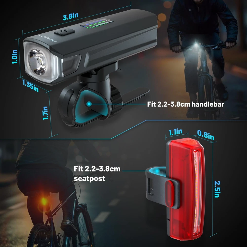 Introducing our powerful USB C Rechargeable Bike Light Set, designed to enhance your nighttime cycling experience. Whether you're a dedicated cyclist,a daily commuter,or an outdoor enthusiast,this waterproof light is perfect for all your nighttime adventures.With a remarkable 1200 lumen output,our bike light offers strong brightness,ensuring maximum visibility and safety on the road.Its easy installation allows you to effortlessly mount it on your bicycle,making it convenient for any rider.This bike light is not only suitable for adult bikes but also perfect for kids' bikes,electric bikes,BMX,mountain bikes,and scooters.It serves as an essential accessory for all types of riders,ensuring that you are visible to others,especially during low-light conditions.Equipped with both front and rear lights,our bike light provides a comprehensive lighting solution.The front headlight illuminates the path ahead, while the rear tail light ensures you are seen from behind. This is particularly useful for nighttime rides and off-road adventures.Our Bike Light is an ideal choice for parents who want to ensure their kids' safety while riding at night.It serves as a reliable night light for kids' bikes,offering peace of mind for both parents and children.Don't let darkness hinder your biking experience.Upgrade your bike accessories with our reliable and durable bike light.It's time to take control of your nighttime adventures with our powerful and versatile USB C Rechargeable Bike Light. Strong Brightness: 1200 lumens super brightness bike headlight and a brighter bike tail light provide a increased visibility and safety for night riding. IPX6 waterproof function allows you to ride with confidence even in rain or snow Rechargeable/Long Battery Life: Our bike lights feature USB-C rechargeable, enabling your bike light set is always ready for your next ride. Fully recharge in less than 3 h when connected to any USB port. Runtime of up to 13 h on flashing mode for the headlight and up to 7 h on flowing mode for the taillight, perfect for extended outdoor adventures or night rides 4+5 Light Modes: The bike front light has four different modes. The bike rear light has five modes for added safety. Taillight memory function allows for hassle-free operation by automatically remembering the last used light mode. Note: Click three times taillight button to switch normal brightness modes to the warning modes LCD Screen Display: The battery indicator and brightness indicator allow you to easily monitor the battery level and adjust the brightness according to your needs. Low battery indicator (Illuminate red when the battery is less than 20 percent) Easy to Install: Easy mounting for bike handlebars and rear seat post without any tools. Also easy to remove with the nut or strap to loosen for using elsewhere leaving the mount behind. Several mounting options make it easy to suit your needs