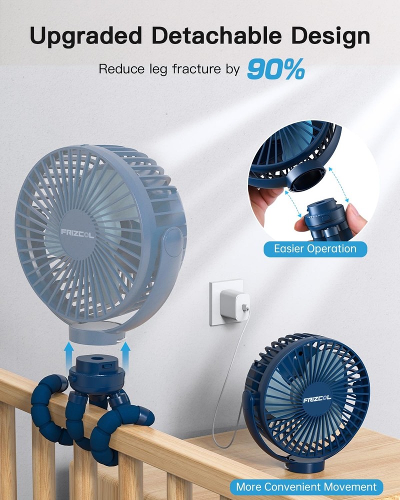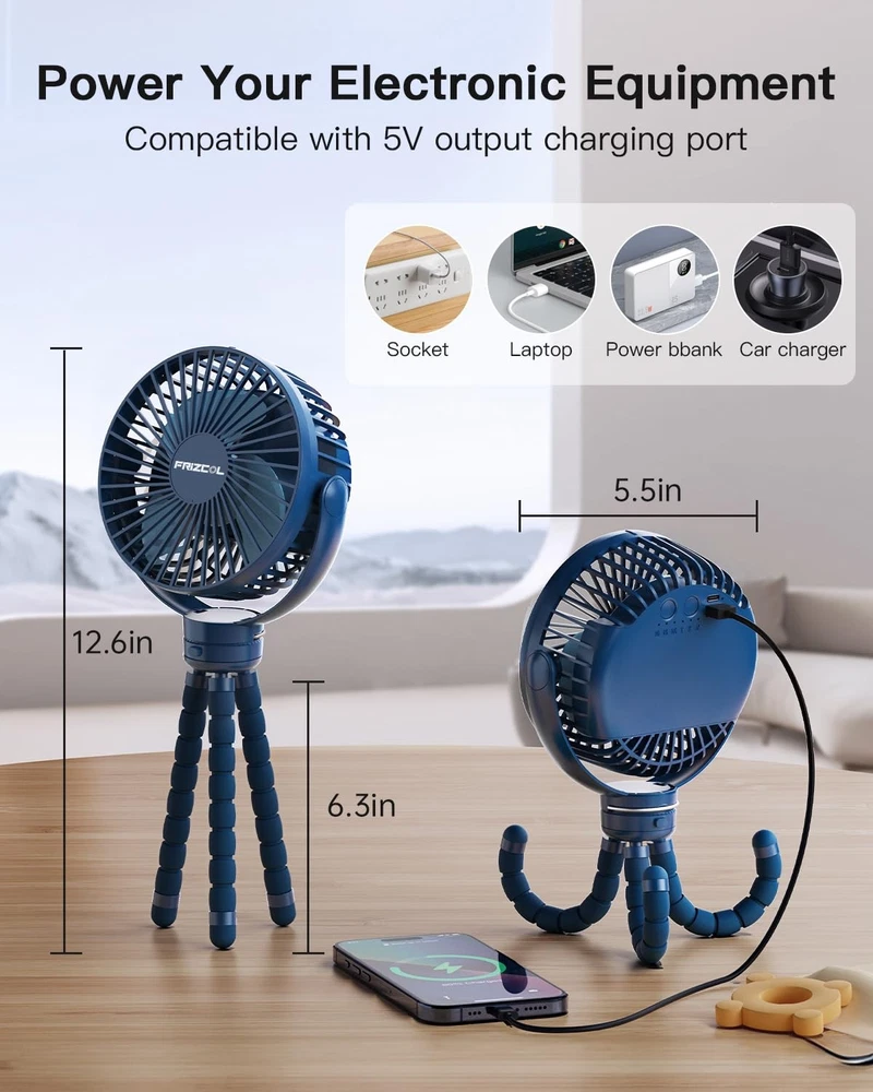 INCREDIBLE 65-HOUR BATTERY LIFE, USB RECHARGEABLE FAN: Our battery powered fan built-in 12000mAh rechargeable battery, its battery will last anywhere from 12 to 65 hours depending on the fan speed setting. Simply charge it through a USB port from a power bank, pc, hub, outlet, etc. This flexible tripod fan is compact, lightweight, and gives an impressive cooling effect. USE AS BACKUP POWER BANK, POWERFUL&PRACTICAL: Are you worry that your phone is going to run out of power while you are outside? Don't worry about it anymore! Our small fan could use as a backup power bank for your electronic devices, such as smartphones, laptops. This mini fan is compact&lightweight, take it on the go, perfect for the car seat, baby stroller, golf cart, beach, camping, gym, travel, and other outdoor activities. Our battery powered fan is your must-have summer gadget! IMPROVED COOL AIRFLOW, MIGHTY YET QUIET BRUSHLESS MOTOR: Small but sturdy, this small portable baby fan has three different speeds, designed to keep your baby cool without an irritating noise. Its powerful 5000RPM turbo motor, giving you an instant breeze of up to three meters. Mighty yet quiet fan for baby stroller, bed, office, home. Now is the time to invest in a decent portable fan that will keep you cool all summer long. THREE ADJUSTABLE SPEED, 360° ROTATION, COMPACT, AND LIGHTWEIGHT FAN, FRIENDLY TO MOMMIES AND BABIES: This flexible tripod fan offers complete 360 vertical and horizontal rotations so you can direct the wind at an appropriate speed to any direction you need. The grid openings on the back and front are smaller than others, no need for concerns of little fingers making their way through the back of the fan to touch the blades. HIGH-END QUALITY, 300 DAYS WARRANTY, BUY WITH HASSLE-FREE: This is a multi-purpose USB rechargeable fan that combines clip on fan, handheld fan, small desk fan, and stroller fan in one. Its bendable legs give the option to attach this small fan wherever is available - Hold it, fix it, hang it, and fold it. No doubt this is the best all-rounder battery-operated colling fan. We also provide you with the finest customer service.