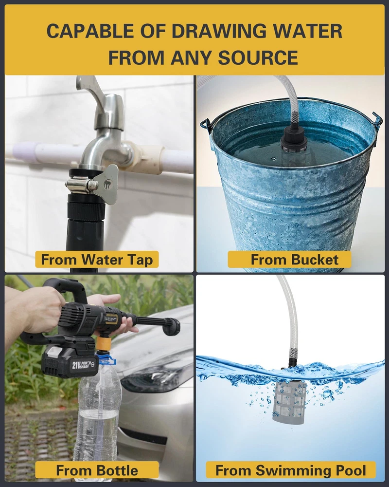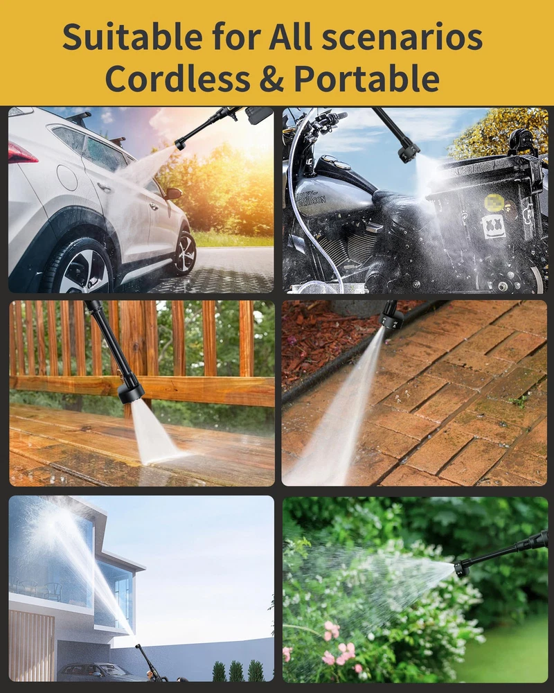 [Unmatched Strong Portable Power Washer Cordless] Cordless Pressure Washer delivers an impressive cleaning power. Our high pressure washer can tackle even the toughest dirt with ease, making the cordless power washer perfect for any cleaning task. [High-Capacity Battery] Equipped with advanced 21V 4.0Ah battery, our car pressure washer ensures faster charging times, longer runtime and consistent power output. Enjoy up to 40 minutes of uninterrupted cleaning with our battery powered pressure washer. [Versatile 6-in-1 Nozzle & Foam Pot] Our nozzle offers a range of spray patterns, including 0°, 15°, 25°, 40°, jet, showering, versatile for all scenarios. Other than a good car washer, it's also good for foam cleaning, bikes, window, wall, floor, etc. [Draw Water from Anywhere] Our car wash pressure washer machine includes all connectors for drawing water. The faucet connector draws from tap. The weighted filter absorbs water from buckets & pools easily. The bottle connector takes water from bottle. [Easy carry & Install] Weighed 3.2 lbs, our portable handheld pressure washer is designed for easy carry. With detailed instruction & quick-connect ports, our mini small battery operated power washer allows for fast and easy setup. hidrolavadora portatil [What is included] Pressure Washer, 4.0Ah Battery, Fast Charger, 6-in-1 Nozzle, Foam Pot, 23FT Extended Extra-strong Hose, Faucet Connector, Stop Valve, Weighted Filter, Bottle Connector, Bottle Straw, Storage Case, User Manual, 24-hour response service.