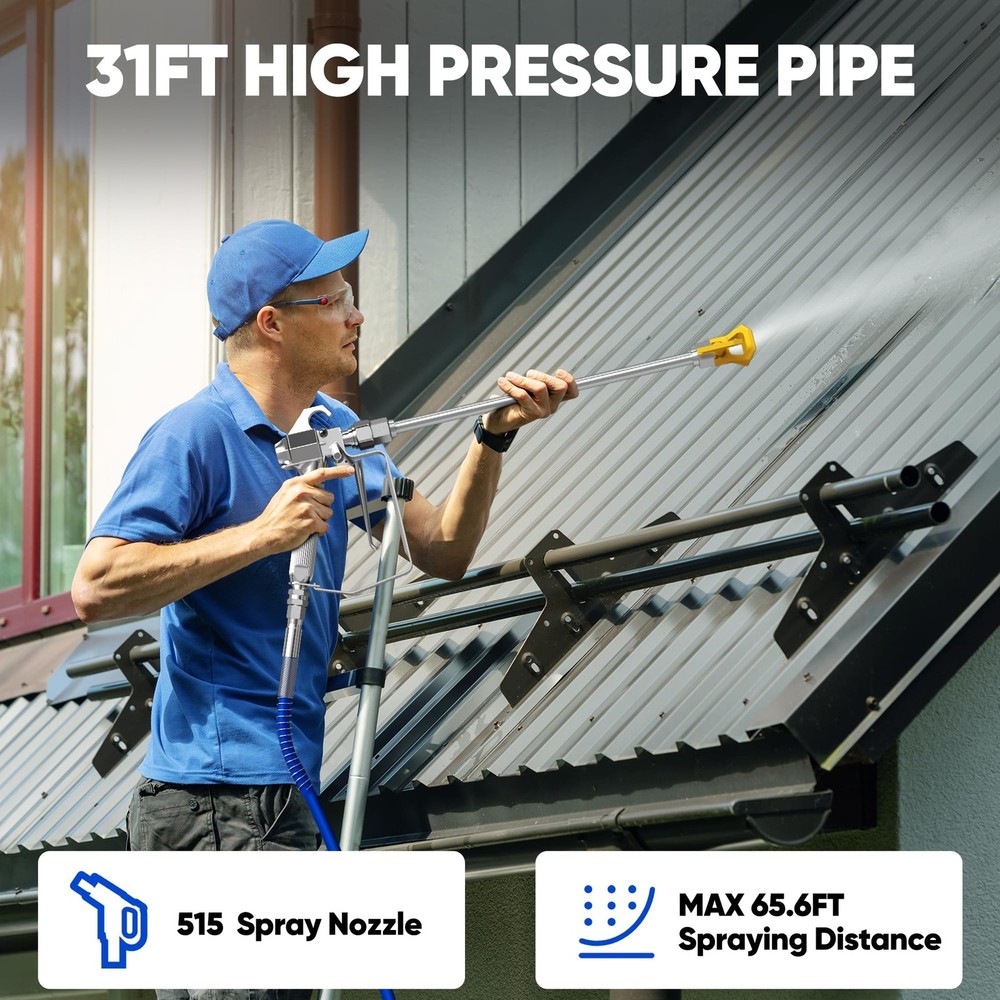 airless paint sprayer 【POWERFUL MOTOR】 airless paint sprayer has a 1200W motor that delivers a flow rate of 1.2L/min, which is 5X faster than roller painting, helping you to save your spraying time. 【TWO USE METHODS】This electric paint sprayer is very simple to use with the push of a switch, which has a direct nozzle and a 12-inch extension pole that can be used in two ways, making it easy for you to spray near and far. 【EVEN SPRAYING】With an adjustable spray pressure of up to 3300PSI, our electric paint sprayer is capable of efficient and even spraying, and is equipped with a 515 nozzle to make the paint more delicate, presenting a professional spray effect. 【COMPACT DESIGN】stand airless sprayer weights only 16.5 lbs, and is also designed with a multi-purpose portable handle and a 29.5 ft. long hose storage rack, making it not only convenient to store, but also easy to move and carry. 【WIDE APPLICATION】The paint sprayer machine is suitable for home interior and exterior, furniture, fences, decks, garage, etc., making it an excellent spraying companion. And please you can contact us if you have any problems in using.
