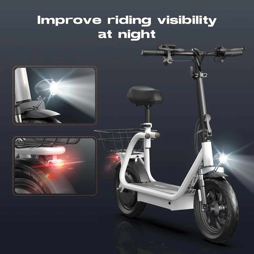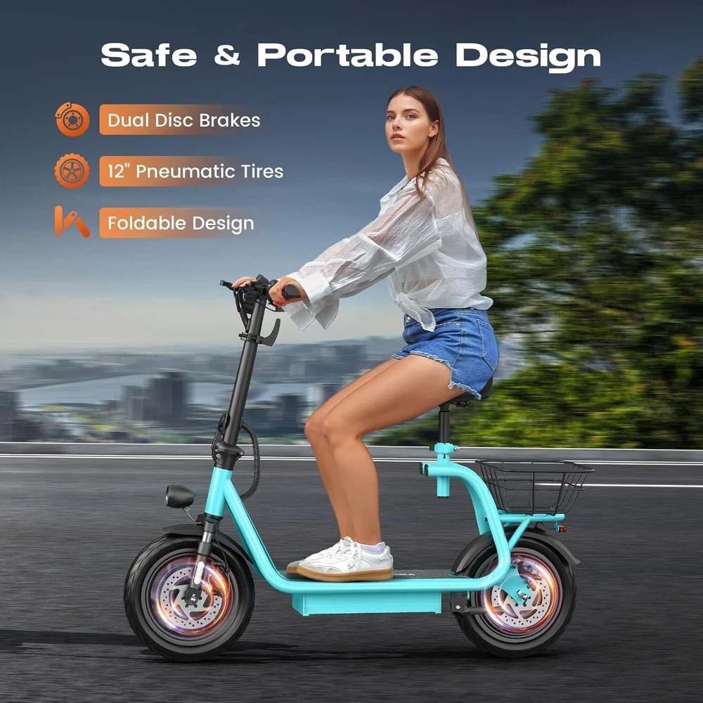 Product Description About this item 【48V Battery and Peak 1200W Powerful Motor】The electric scooter for adults is equipped with a 48V/10.4Ah battery, which can last for a long time without frequent charging, with a maximum range of up to 30 miles and a maximum speed of 20mph, and it only takes 7 hours to fully charge. The motor has a peak power of up to 1200W and can easily climb a 30-degree slope, making it very suitable for short-distance commuting 【LED Display and 3 Speed Modes】The electric scooter adults is equipped with an LED high-definition display, which can clearly display: speed mode, battery power, current speed, and mileage during the day and at night. The caroma scooter uses a half-turn handlebar design, getting rid of the traditional full-grip speed control mode to ensure riding safety; the scooter has 3 different speeds for you to choose, giving you a better riding experience 【Excellent shock-proof suspension and brake system】This electric scooter with seat for adults has an excellent shock absorption system composed of headlights and taillights, electronic horns, front forks and sensitive double disc brakes, which can brake quickly, safely and stably; durable one-piece wheels and thick steel frame can withstand high-intensity pressure, with a maximum load-bearing weight of 265 pounds, suitable for heights of 3'11"-5'11" 【 Foldable Electric Scooter with Seat】Caroma electric scooter is equipped with an 8.27-inch wide deck, a soft seat that can be adjusted according to different heights, and a storage basket on the back seat; the front of the vehicle is compact and foldable, making it easy to store in a car trunk or other small space 【Caroma Electric Scooter After-Sales Support】Caroma electric scooter with Seat is UL 2272 certified. This detachable electric scooter is 90% assembled and comes with instructions and installation tools, making installation very easy. If you encounter any problems, such as motor failure, charging problems, or missing accessories, please contact us in time