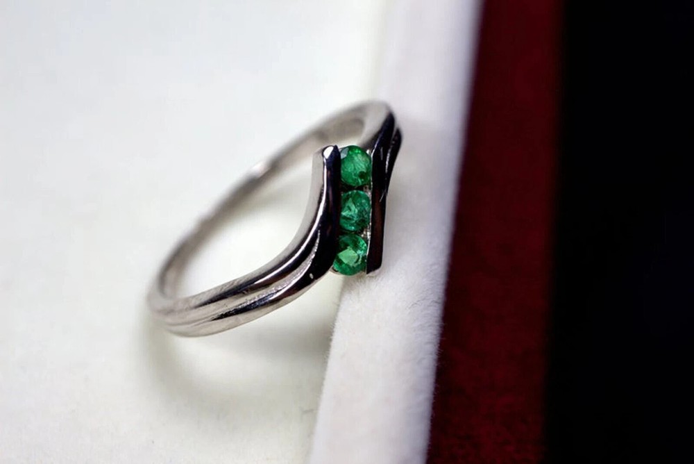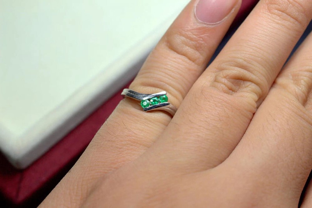 Elevate your jewelry collection with the 1.20CT Lab Created Round Cut Emerald 3 Diamond Dainty Ring, beautifully plated in 14K white gold. The ring features a stunning round-cut emerald, boasting a lush green hue and exceptional clarity, set in a channel of sparkling diamonds. This piece is a testament to timeless elegance and craftsmanship, perfect for commemorating anniversaries or expressing love. Sanavi Jewels brings you this exquisite ring, available in all sizes for a comfortable fit. Personalization is encouraged to ensure a one-of-a-kind creation. With its floral pattern and delicate design, this ring is a symphony of sophistication, ideal for any woman who appreciates the allure of fine jewelry.