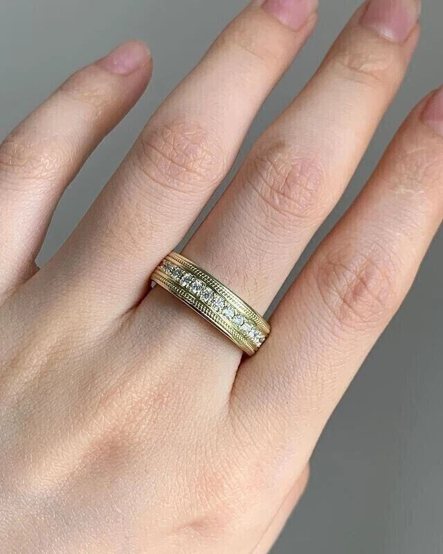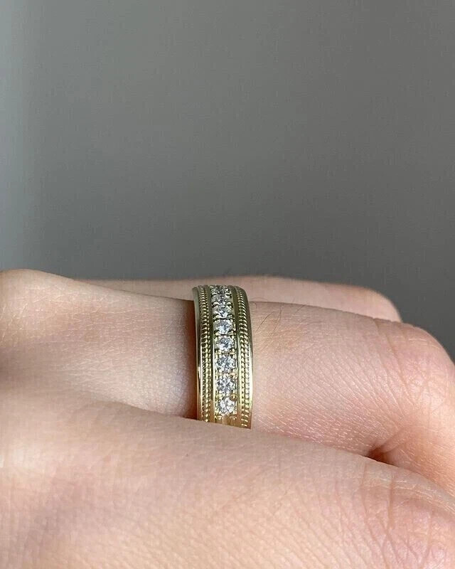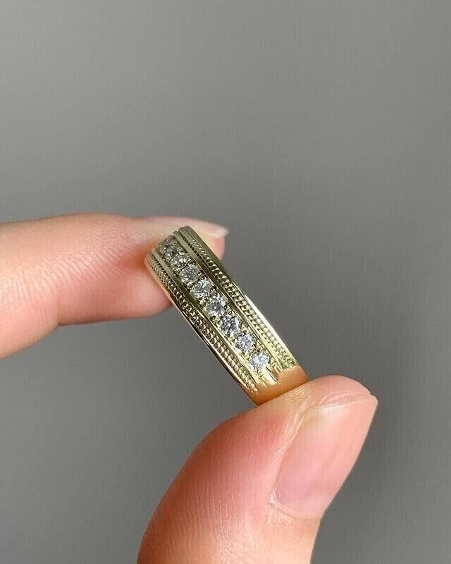 This 1.20CT Round Lab Created Diamond Men's/Women's Band Ring is a stunning piece of jewelry crafted with 14K Yellow Gold Plated Sterling Silver. The ring features a round, white lab-created diamond as the main stone, with a secondary diamond on the side, making it a versatile and elegant accessory suitable for various occasions such as anniversaries, birthdays, and Christmas. The band style and engraved floral pattern add a touch of sophistication to the design, making it a perfect gift for both men and women. Personalization is available, and the ring is handmade in the United States, ensuring quality craftsmanship and attention to detail.