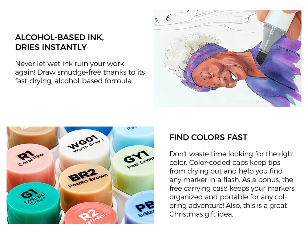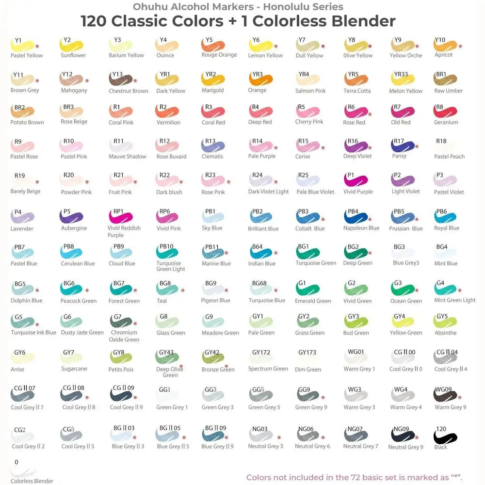 Main Featrues 【Honolulu Series】BRUSH & CHISEL , DOUBLE-TIP, DOUBLE THE FUN Widen your artistic horizons with the dual-tip marker design! Choose the brush tip for sweeping, calligraphic strokes or quickly color in large areas with the wide chisel tip. What's more, now Ohuhu replacement brush tips is available, so you can easily replace the worn-out tips to ensure consistent and precise lines whenever you create. The only limit is your imagination 【Honolulu B Series】BRUSH & FINE , DOUBLE-TIP, DOUBLE THE FUN Widen your artistic horizons with the dual-tip marker design! Choose the brush tip for sweeping, calligraphic strokes or the fine tip for details. What's more, now Ohuhu replacement brush tips is available, so you can easily replace the worn-out tips to ensure consistent and precise lines whenever you create. The only limit is your imagination REFILLABLE INK FOR A LIFETIME OF CREATIVITY With 51 Ohuhu popular colors available for refills now and more on the way, your creativity knows no bounds. Enjoy a wide range of hues and keep your markers going for years to come. Whether you're exploring the rich colors of Honolulu, Oahu, the Kaala, or the bold hues of Molokai Series, they are refillable now. Switch between sets seamlessly and unlock endless artistic possibilities SEAMLESSLY BLENDING Say goodbye to unsightly splotches and uneven coloring. Our high-quality ink seamlessly blends to create beautiful, professional-grade artwork, perfect for both beginners and experienced artists; Also, no more frustrating smudges or wet ink ruining your work. Our alcohol-based ink dries quickly, ensuring that your art is always clean, crisp, smudge-free, and ready to display 120 VIBRANT COLORS + 1 COLORLESS BLENDER The rainbow is at your fingertips - choose from 120 brilliant colors and bring your ideas to life. The color spectrum is yours to explore with 120 brilliant shades to choose from, plus a colorless blender for better blending effects. From coloring books to professional masterpieces, our brush markers will breathe life into your artwork EASY IDENTIFICATION, ORGANIZATION & PORTABILITY Don't waste time searching for the perfect color. Our markers come with color-coded caps to keep you organized and efficient. Plus, the free carrying case makes these markers perfect for any coloring adventure or as a thoughtful gift for any artist Product Description