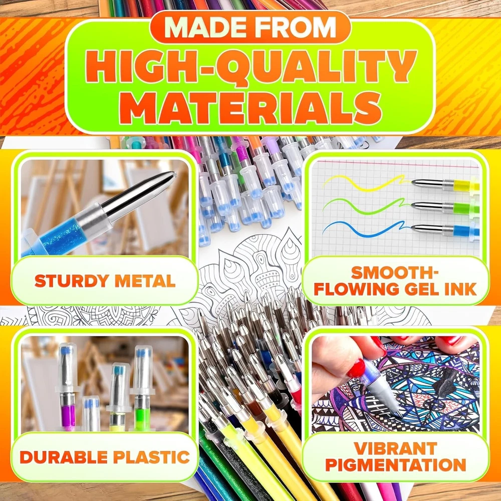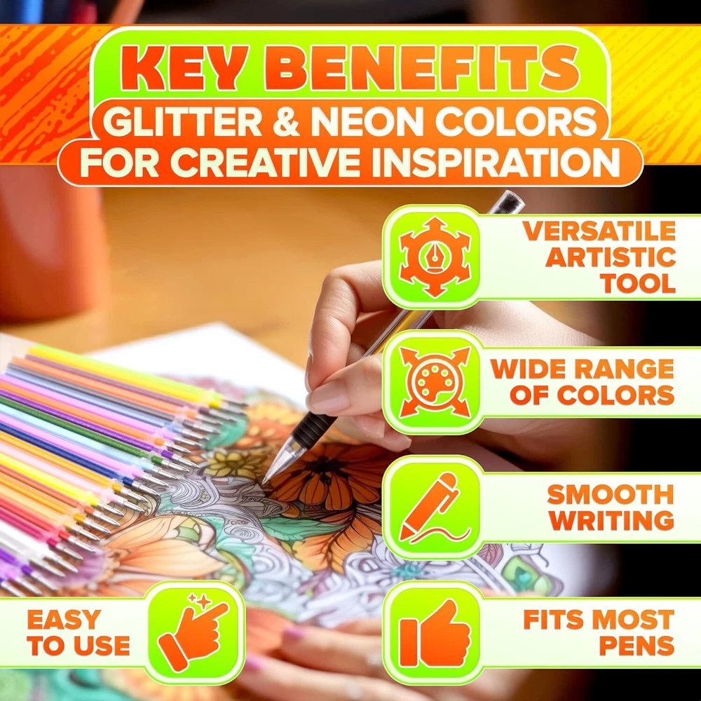 120Pcs Gel Pen Refills Glitter Gel Pens for Coloring Metallic Gel Pens Colored Ink Color: Pastel Style: Sketch,Gel,Rollerball Item dimensions L x W x H: 3.94 x 1.97 x 1.97 inches Item Weight: 0.1 Kilograms Package Include: This 120-piece gel pen refill is ideal for various artistic applications, including drawings, sketching, scrapbooking and invitations. Please note that color pens set contains 120 refills, but the colors may repeat and it does not include 120 colors. Unique Gel Glitter Pens: The 0.8-1.0mm tip of our gel pens for adult coloring is designed to provide a smooth, free-flowing ink experience that enables you to achieve vibrant, glowing and sparkling effects in your artwork. This drawing pen ensuring a seamless writing experience. Ideal Gift: With wide range of applications, these coloring gel pens for adults are a versatile gift option that can be enjoyed by artists and crafters. This metallic pen is must-have for any artist or crafter. Wide Uses: Our adult coloring pens offer versatile applications, making them a great addition to art supplies and suitable for art books, scrapbooking, crafts, cards, photo albums, and journals. Great Gift Idea: This glitter gel pens for adult coloring are fun gift choice for any occasion. Whether it's a birthday, holiday, or just Return Policy: We offer a 30 day return policy from the receiving date. Please contact us for a Free Return Label. Please use our return label so it will go back to our supplier and we can do a refund or replacement afterwards. Feedback: Your satisfaction is very important to us! If you have any problem with your order, please contact us and we will do our very best to make you satisfied. As long as you are happy with your purchase, please leave a positive feedback for us. We will always leave you a positive feedback in return. If you have any problem with your purchase, please do not leave a negative feedback. Please Contact us ... and your issue will be solved quickly and positively We are a small family-owned business trying to make a living, not a huge company that does not care ... We will ALWAYS do our best for you!