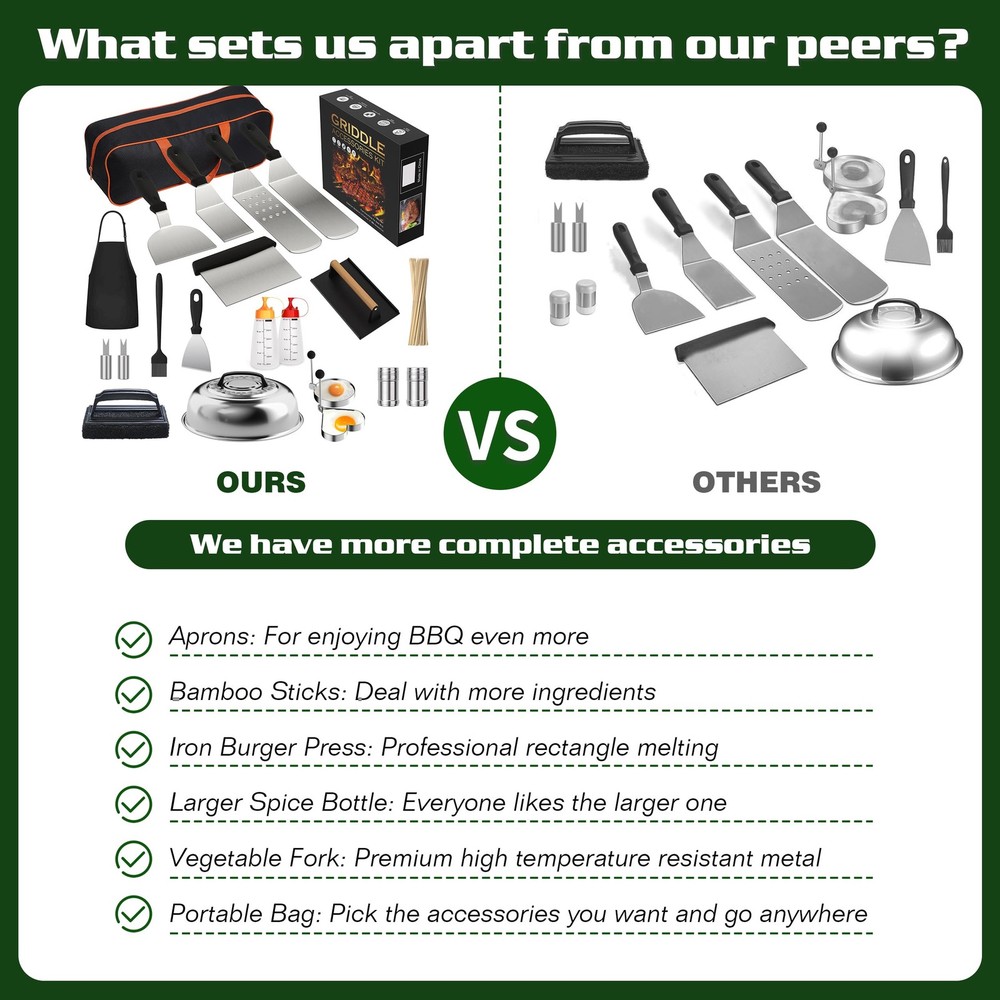 Whether you're grilling at home, camping, or enjoying an RV travel adventure, our griddle accessories ensure you have all the tools you need for a successful outdoor cooking experience! 120 pcs practical griddle accessories kit includes Long griddle spatula, Short griddle spatula, Slotted spatula, Slant Edge Scraper,basting cover,Grill Turner,Burger Press, exclusive apron, Griddle Chopper,Basting Brush, 2 Squeeze Bottle, 2 Egg Rings, 2 Spice Shakers,2 corn fork,100pcs bamboo skewers,Cleaning Brush,high-quality storage bag and a beautiful package box Premium Quality: Our 120pcs Griddle Accessories Kit is crafted with heavy gauge stainless steel, ensuring durability and long-lasting performance. You can trust that our BPA-free, rust-resistant, and durable tools won't crack or melt with long-term use. Say goodbye to flimsy tools that bend or break easily during outdoor grilling sessions. Hassle-Free Cleaning& Storage & Carry: With its easy-to-clean feature and dishwasher-safe materials, this kit takes the hassle out of post-grilling cleanup. Each tool can be placed in an orderly manner and better protected in the compact storage bag. PROFESSIONAL GRIDDLE TOOLS:This set of grill tools with grill scraper, spatula and grease bottle will help you grill as easily as a restaurant chef even if you are a beginner griller. It will make everyone happy at your BBQ, weeknight party or everyday meal! Perfect Choice: This practical barbecue tools set with beautifully designed package box is ideal accord choice for Fathers Day, Thanksgiving or Christmas。Whether for a passionate grilling enthusiast or a camping aficionado, this comprehensive accessories kit makes for an ideal accord. All your patio, outdoor and camping BBQ's, weekend parties or everyday dining needs can be met.Please clean the tool promptly after use, and do not leave any water stains on the tool to avoid damage.