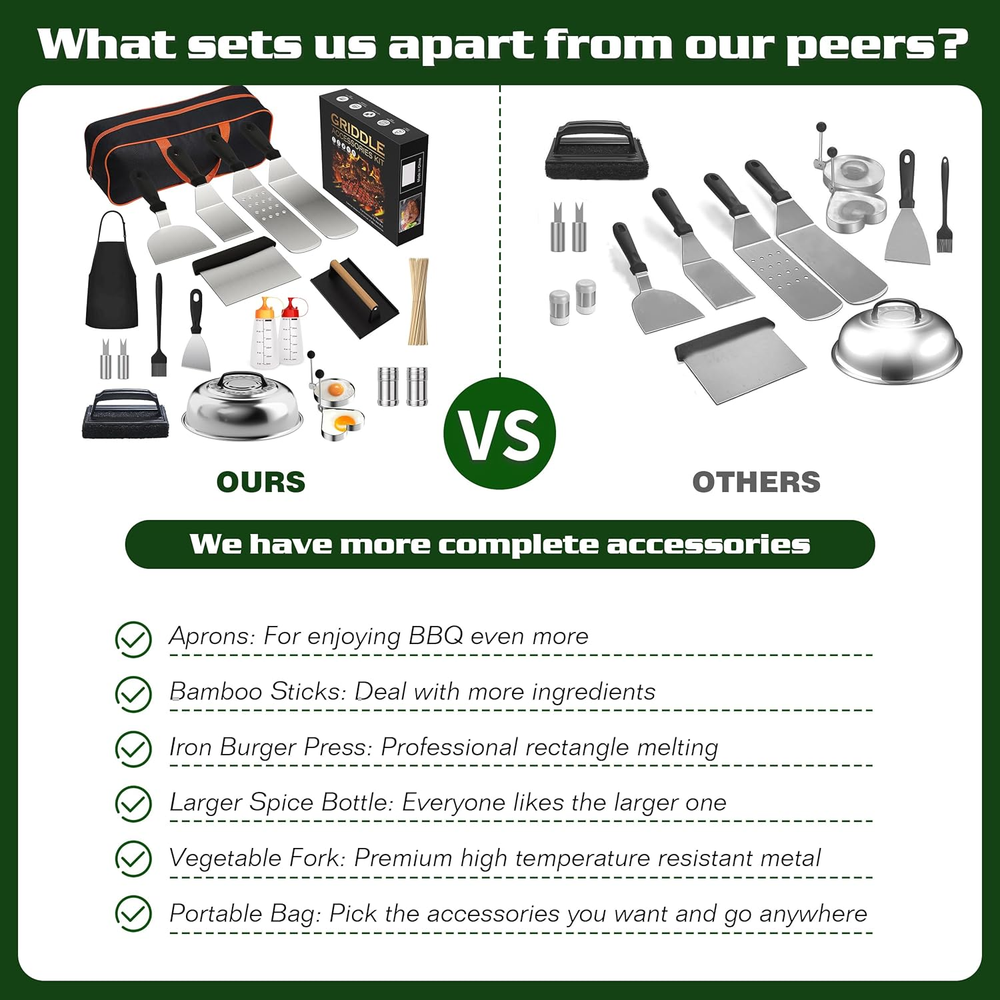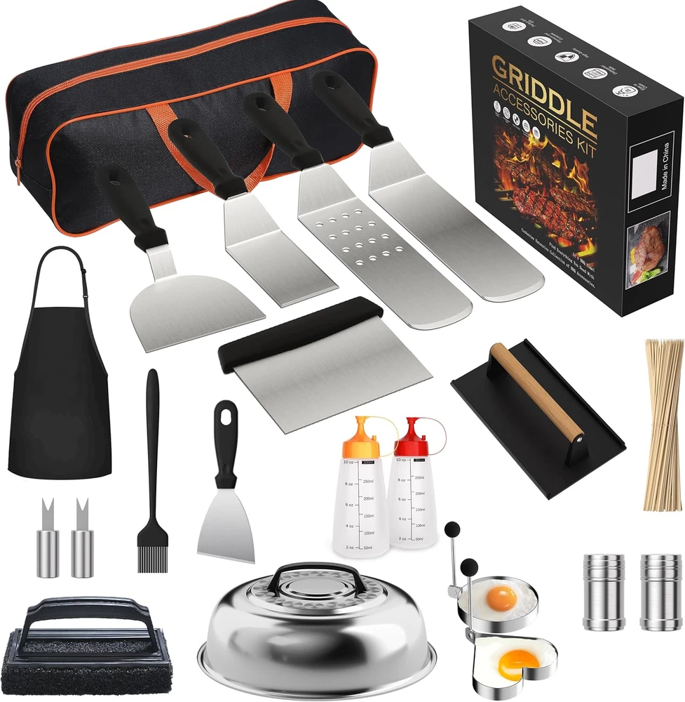 This griddle kit is a game-changer for outdoor cooking! The sturdy stainless steel tools and cast iron press make flipping burgers and melting cheese effortless. Love the variety—everything stays organized, and cleanup is a breeze. Perfect for backyard BBQs, and the domes keep food hot. Highly recommend for serious grill masters!