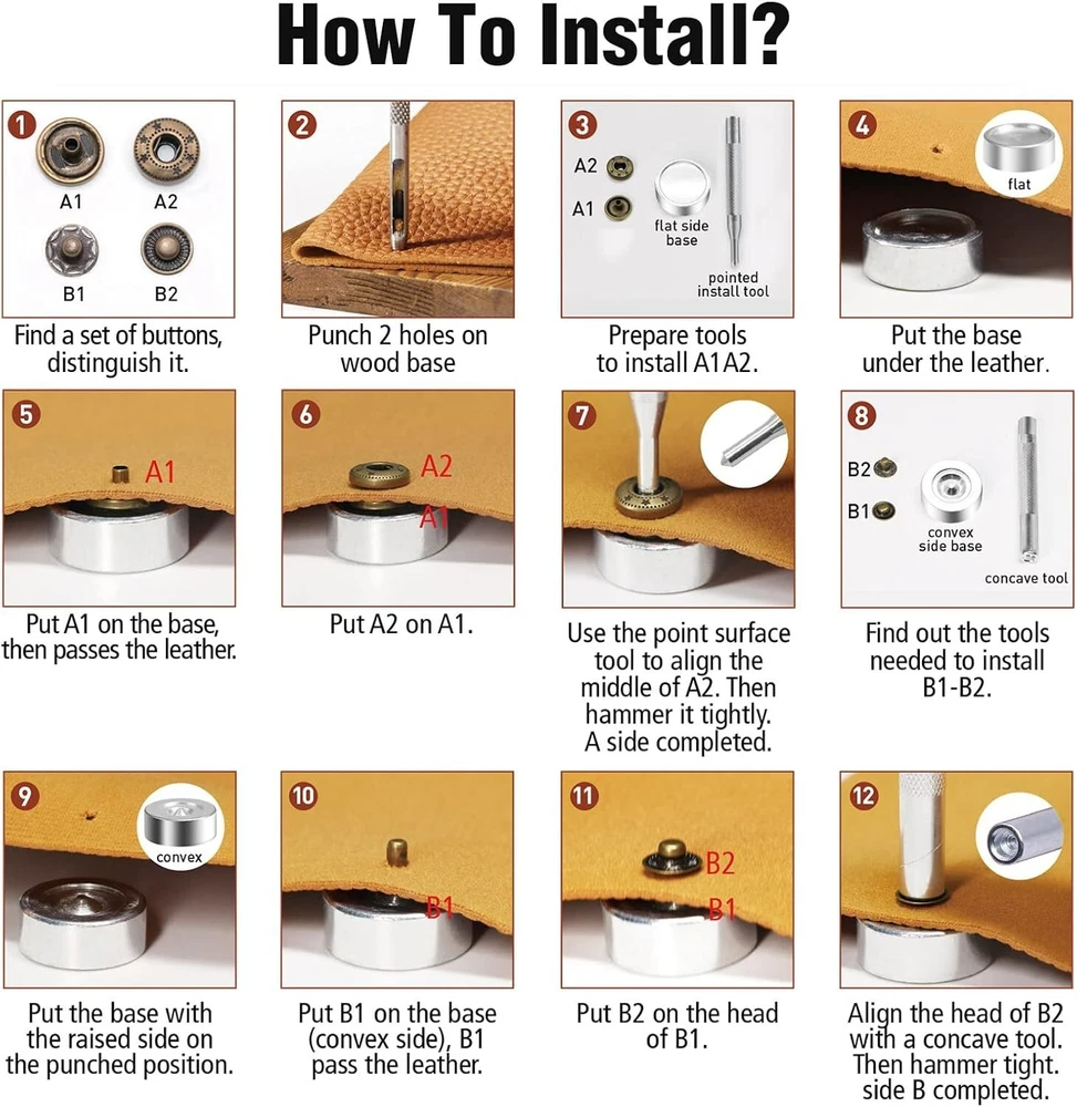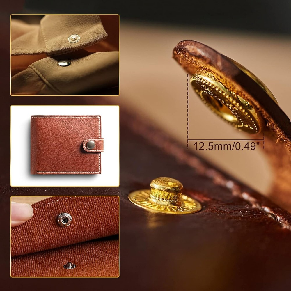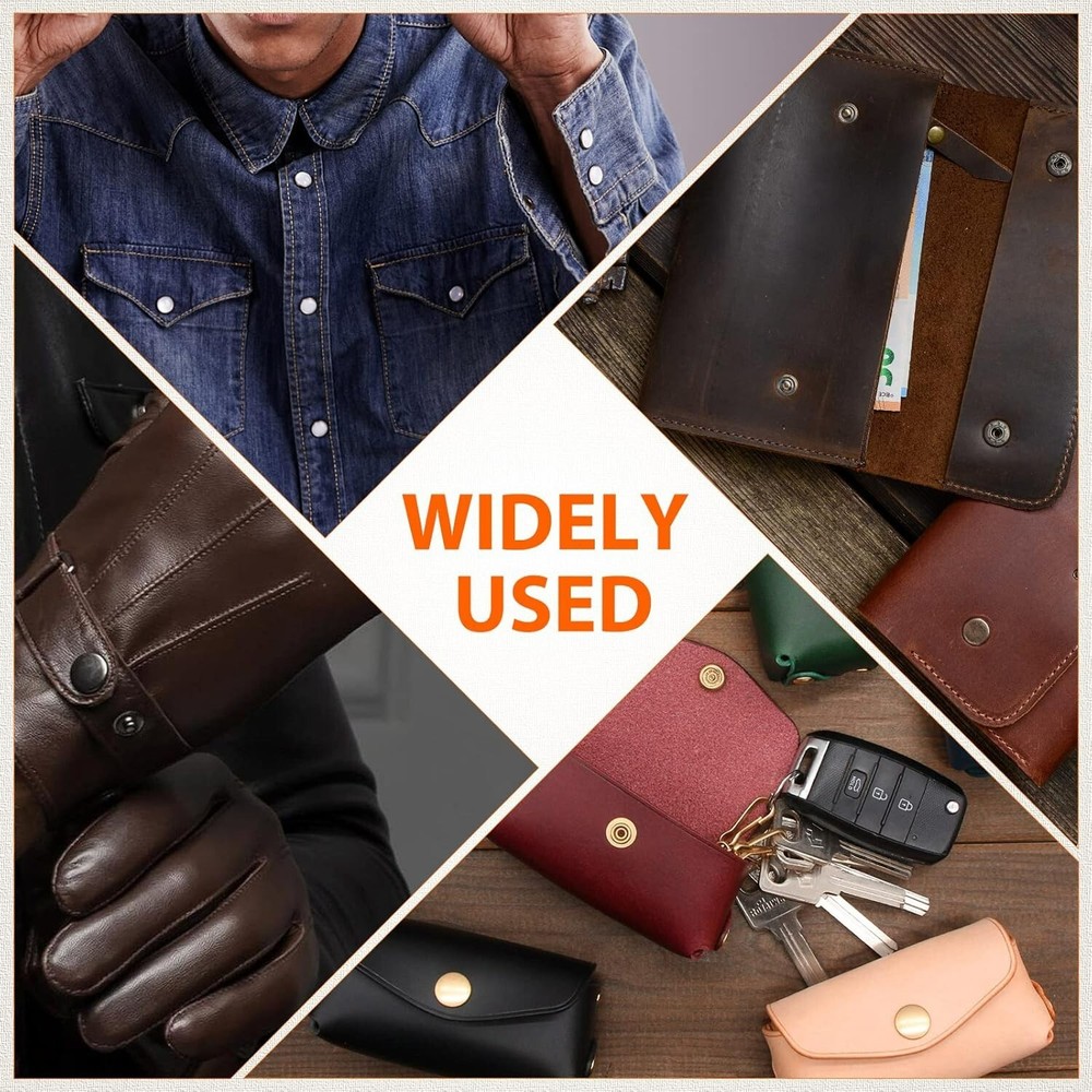 120 Set Leather Snap Fasteners Kit, Metal Button Snaps Press Studs with 4 Setter Tools, 6 Colors Leather Snaps for Clothes, Jackets, Jeans Wears, Bracelets, Bags DOUBLE CAP RIVETS: 4 commonly used colors (gold, silver, bronze, gunmetal) will add a retro and exquisite style to your leather crafts, totaling 240 sets 2 ASSORTED SIZES: For the large size, the cap, post, and base are all 8mm (5/16 inch). For the small size, the cap, post, and base are all 6mm (1/4 inch). Please ensure that your fabric is not thicker than the rivet size PRACTICAL SETTING TOOLS: The included punching tools and anvil ensure quick and easy installation, even if you're a novice. You will quickly figure out how to use them by watching our instructional video WIDE APPLICATION: These leather rivets are useful accessories that can be applied to DIY leather crafts, as well as for repairing and decorating wristbands, hats, jeans, windbreakers, belts, shoes, sandals, down jackets, bags, and more COMPACT STORAGE BOX: All rivets and tools are neatly placed in a clear storage box, so you can easily find the size and color you need What makes our unique? It is our goal to make handmade works useful in daily life, and it is this that keeps us growing.