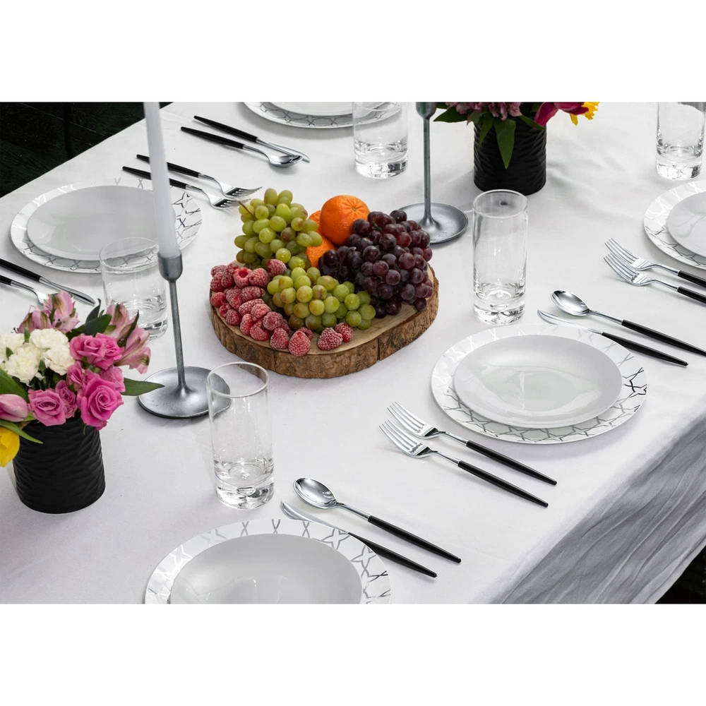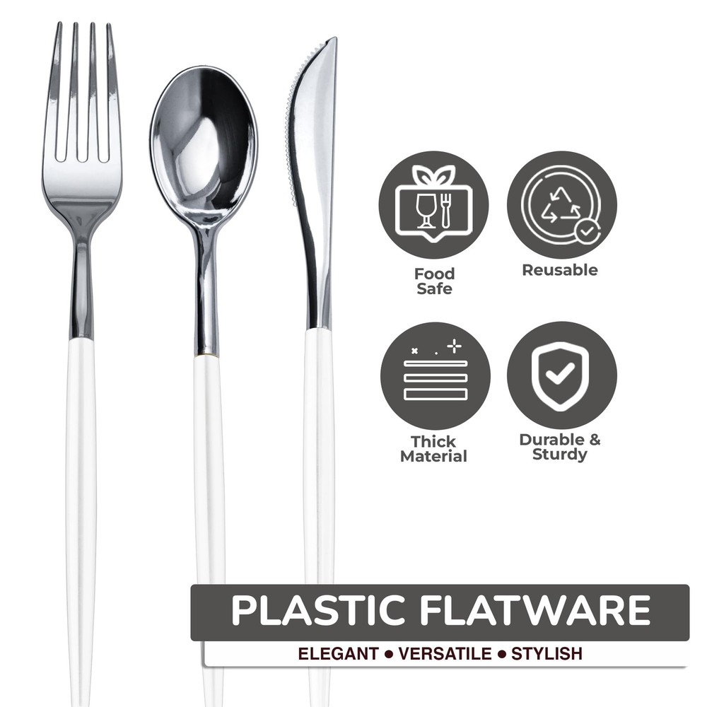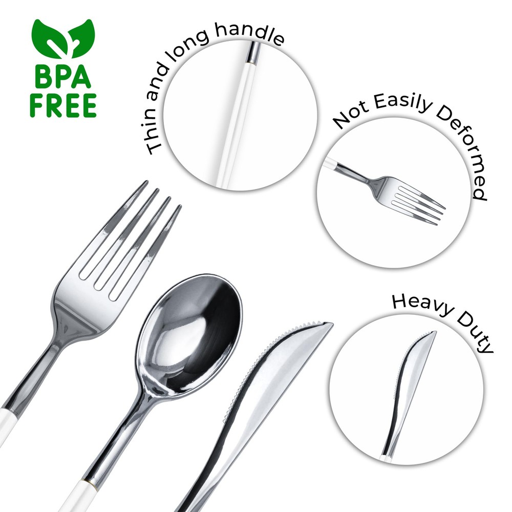INCLUDES: White Silver Silverware Cutlery Set Each Box of heavy duty plastic silverware Contains 40 heavy duty Plastic Forks and Knives And 40 Soup Spoons Disposable Plastic Silverware Forks Sturdy And Unique Plastic Forks Pair With Our Matching Plastic Spoons And Knives For The Complete utensils set PERFECT FOR ANY OCCASION: Introducing Our Designer Sleek, Modern, And Stylish Disposable Cutlery gold flatware - This Trendy Cutlery Is Perfect For weddings , Receptions , Formal Dinners , Banquets , Parties Picnics, Catering Supplies , Halloween , Christmas Etc PREMIUM QUALITY: These disposable silverware heavy duty tableware utensils not only look stunning but are very sturdy. We Are Proud To Say That Our durable fancy plastic silverware set Is Made with Bpa Free Plastic That Is Recyclable Too! It Is The Perfect Holiday and Thanksgiving cutlery - upscale disposable dinnerware COLLECTION: Impress your guest this holiday season with magnificent high quality disposable forks spoons and knives set disposable dinnerware set Each design is uniquely vibrant and can find a place at any trendy event - plastic silverware sets for parties or wedding disposable dinnerware FINE DINNING MADE EASY: Need to spruce up a party but don't want to use your real dishes ? quality Disposable plastic Cutlery is definitely the way to go. There is always a new look or design to change things up from last party and our disposable utensils heavy duty gold spoons silverware and gold forks silverware gold knife set are just the thing you need to make partying and clean up a breeze