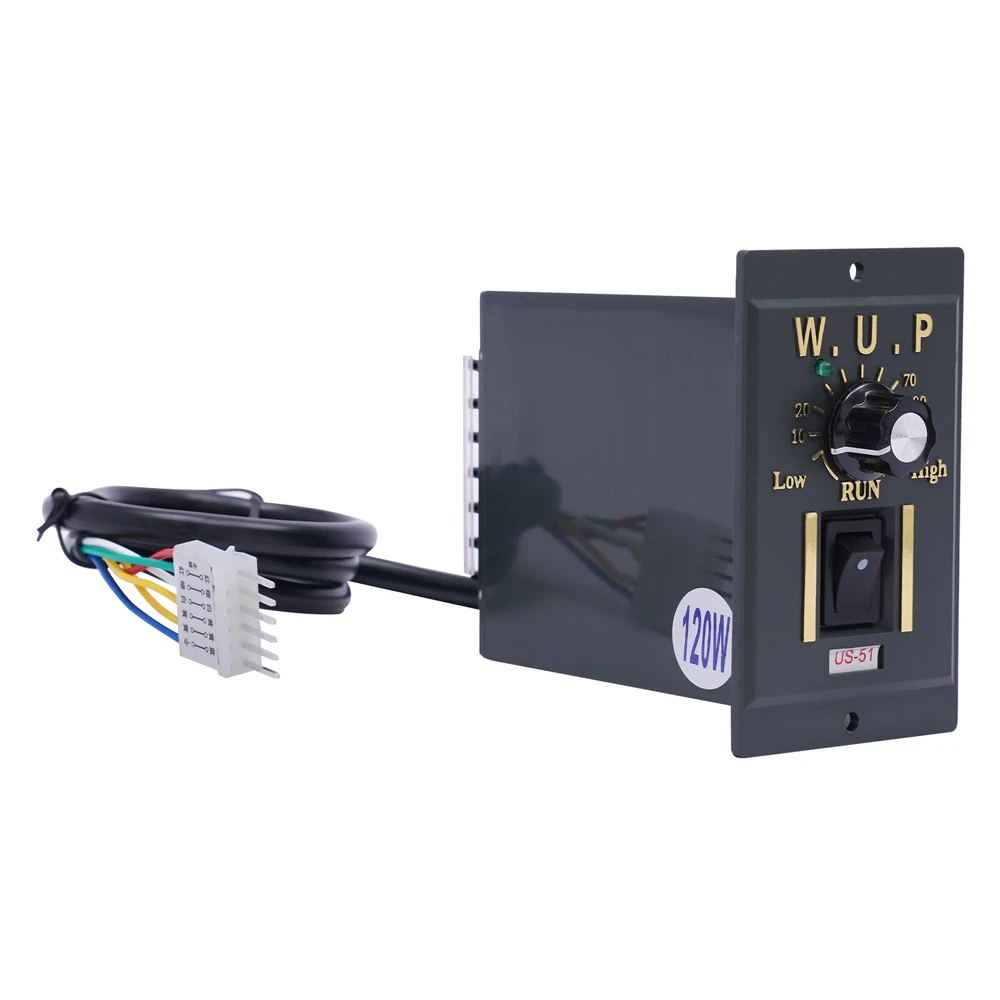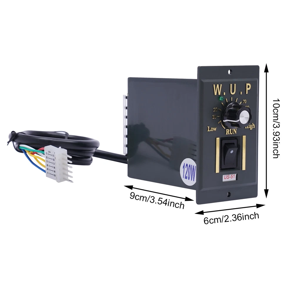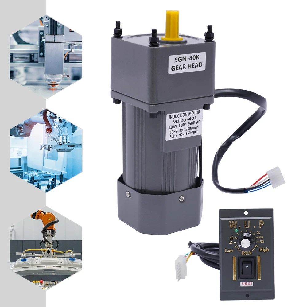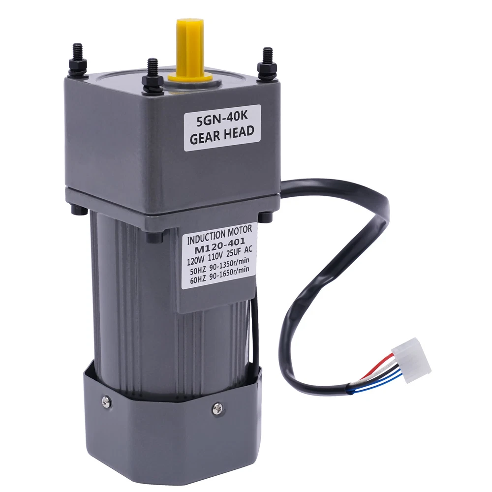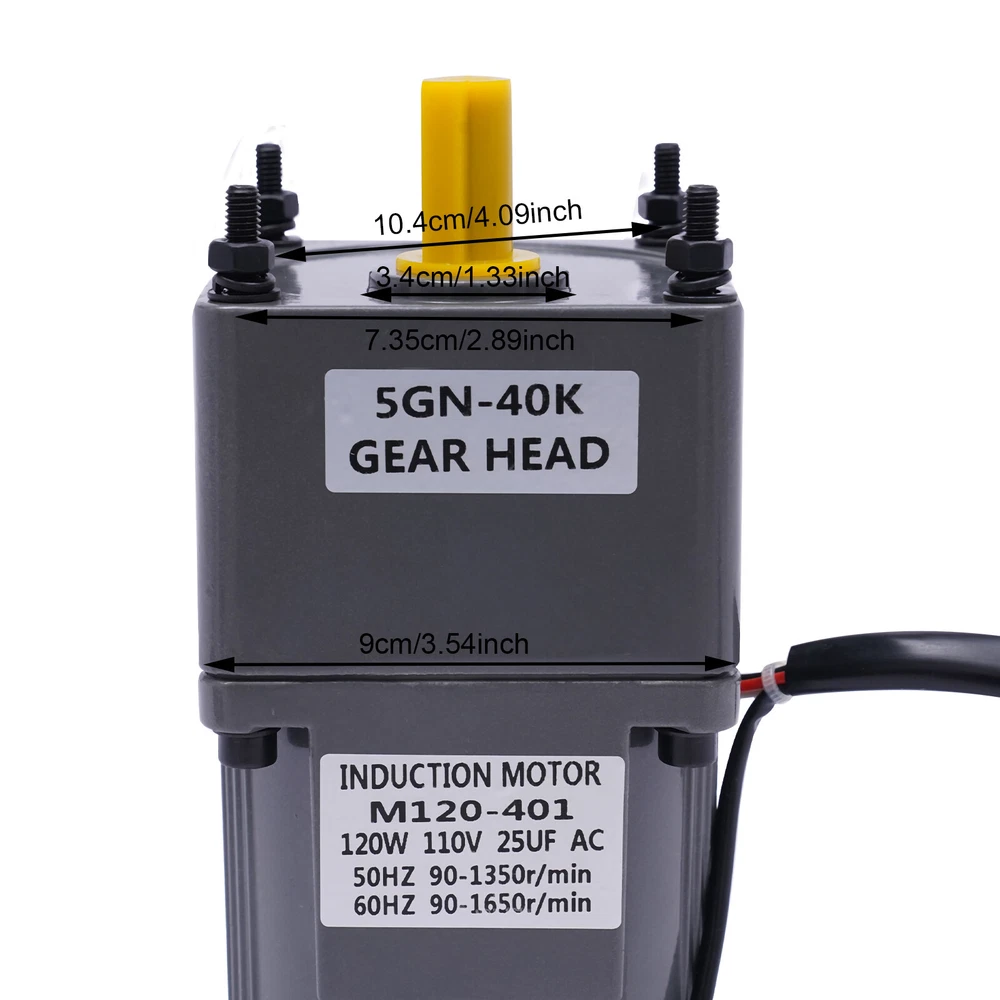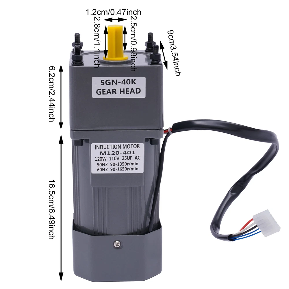 120W 40K 110V AC Motor Low Speed Mini Gearbox Electric Motor Barbecue High Torque 110V Geared Motor Synchronous Reduction Motor Reversible Description This is an AC 110V gear motor with 120W power, which can achieve the 1350r/min speed. It uses pure copper coils and allows for low-noise&powerful working, making it suitable for homes, handcrafts, school projects, model-churning soda machines, low-speed machines, and any other product you want. You can turn the speed control knob to adjust the motor speed, realizing the desired effect. Key Features Build to Last: Our product is made of high-quality cast aluminum shell and carburized carbon steel gear and is characterized by heat resistance, high quality, and long service life through plastic spraying, integration, and heat treatm 120W 40K High Torque 1:40 Electric AC Motor Low Speed Gearbox Reduction Motor 120W 40K 110V AC Motor Low Speed Mini Gearbox Electric Motor Barbecue High Torque 110V Geared Motor Synchronous Reduction Motor Reversible Description This is an AC 110V gear motor with 120W power, which can achieve the 1350r/min speed. It uses pure copper coils and allows for low-noise&powerful working, making it suitable for homes, handcrafts, school projects, model-churning soda machines, low-speed machines, and any other product you want. You can turn the speed control knob to adjust the motor speed, realizing the desired effect. Key Features Build to Last: Our product is made of high-quality cast aluminum shell and carburized carbon steel gear and is characterized by heat resistance, high quality, and long service life through plastic spraying, integration, and heat treatment. Speed Adjustable : With the speed controller that has various optional speeds and large torque, you can adjust different speeds according to different products to achieve the desired effect. Good Heat Dissipation: The built-in cooling fan(>60W), cooling window design on the bottom, and pure copper coils with stable performance can effectively dissipate heat to ensure long-term stable operation. Integrated Reducer: The integrated reducer with a heat treatment process improves the gear wear resistance and work efficiency. Stable Operation: Both ends of the rotor are equipped with ball bearings, which can reduce friction and temperature during use to ensure stable operation. High Safety: The slow start function can effectively avoid current overshoot and protect the motor. And it is adjustable to meet different personalized use needs. Reversing Function: It has a reversing function that is flexible with normally open and closed control systems. Easy to Operate&Assemble: With the simple structure, you can assemble this product quickly. The simple switch button and speed control knob make it easy for you to operate. Protective Package: To prevent the product from being damaged and bumped during transportation, we packed it with foam boxes and bubble pads to protect your products to the maximum extent possible. Buy with Confidence: We have been working hard to provide better service and quality for our customers, which is our goal. If there is any problem with our products, please contact us in time. Details Clear Marks: These clear number&letter marks on the machine allow for easy and convenient operation. Power Cable: The power cable has distinct colors for different wires, so you can connect them easily without confusion. Holster: The yellow holster can effectively protect the shaft when not in use. Application It is widely used in packaging, printing, textile, dyeing, chemical, food, and pharmaceutical construction machinery as well as advertising, office, petrochemical, instrumentation, stage lighting, transmission, automatic warehouse, parking, and other equipment. How to Install Please remove the holster before installation. Fix the reducer on the gear motor with four screws. Install the keyway at the keyway opening. Plug the speed controller and gear motor together (main wire to main wire). Unscrew the two AC screws on the back of the speed controller. Connect single-phase power to both AC ports (without distinguishing between zero and fire wires) and tighten the screws. Turn the speed control knob to adjust the motor speed. Install the bracket(not included) on the motor. Specifications Model: M120-401 Color: Gray Material: Cast Aluminum Gear Material: Carburizing Steel Processes: Plastic Spraying, Integration, Heat Treatment Process Type: AC Gear Motor, Induction Motor Shape: Square, Round Feature: Portable Power Phrase: Single-phrase Motor: Pure Copper Motor Noise: About 50-60db Built-in Fan: >60W Torque: 21N.m Voltage: AC 110V Power: 120W Capacitance: 25UF Speed: 50Hz 90-1350r/min, 60Hz 90-1650r/min Reduction Ratio: 1:40 (40K) Shaft Diameter: 12mm/0.47inch Shaft Length: 28mm/1.1inch Keyway: 4mm/0.16inch Key Depth: 25mm/0.98inch Dialogue Mounting Holes: 104mm/4.09inch Axis Eccentricity: 18mm/0.7inch Disc Diameter: 34mm/1.34inch Through-hole: ∅8 Gear Motor Height: 16.5cm/6.5inch Reducer Size: 9*9*6.2cm/3.5*3.5*2.4inch Speed Controller Size: 9*6*10cm/3.5*2.4*3.9inch Package Size: 28.5*24.1*12.5cm/11.22*9.48*4.9inch Net Weight: 4.96kg/10.9lbs Gross Weight: 5.3kg/11.68lbs Package Included 1* Speed Controller 1* Gear Motor 1* Reducer Notes Based on the industrial standard, to meet the different needs of customers, our motor does not include a power cord. You need to purchase a power cord to connect. The bracket is not included in this package, so you should purchase it yourself. Please do not plug&unplug the power cable when the power is on. Please do not knock or beat the machine. The speed reduction motor is composed of a motor and reducer, different speed ratios can achieve different speed regulation ranges, and they have different strengths. Under different deceleration ratios, the output shaft speed is different. The output shaft speed is equal to the motor speed of 1350 rpm divided by the deceleration ratio. When the gearbox decelerates, the greater the