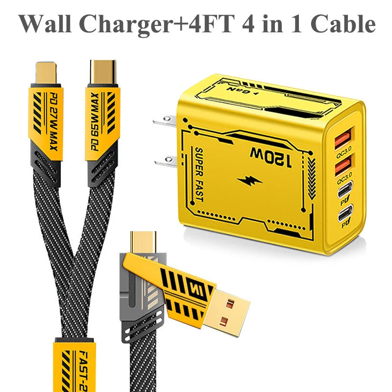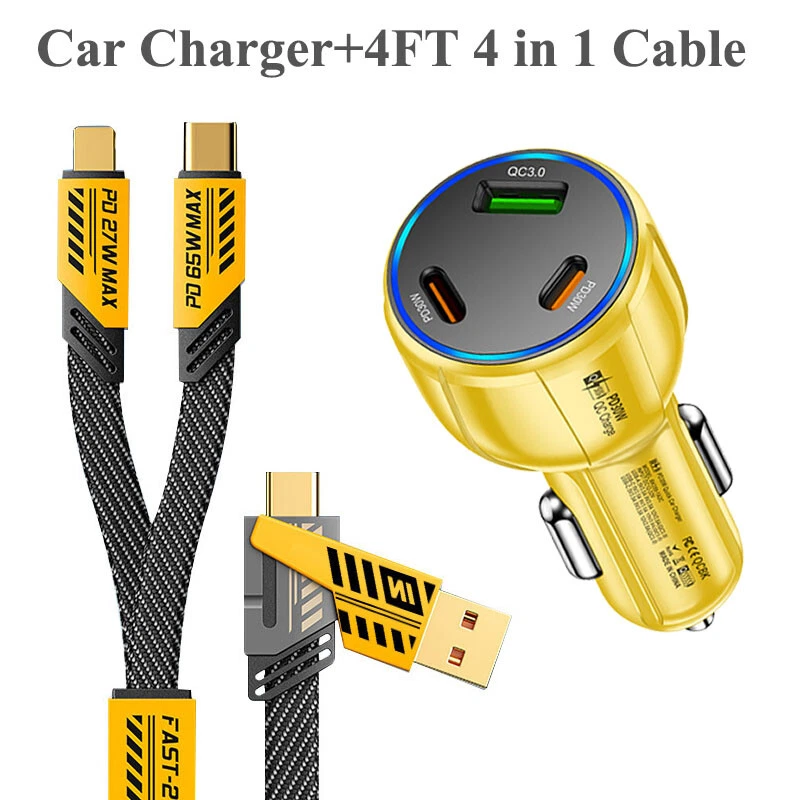 arameters: Product material: ABS + Aluminum alloy Length: 1.2m(1%-1.5% discrepancy ) Input interface: TYPE-C / USB Output interface: USB TO / For IOS Working voltage: 5V-20V Power: Downward with 65W, IOS27W Features: 1. [Multi Protocol Adaptation]: Used on multiple device models, supporting iPhone/MacBook/iWatch/Airpod, Charging Adapter, Smart Watch, Headphone, Smartphone 2. [Fast Charging]: When used with the fast charging protocol charging head, it can be charged to 80% in 40 minutes. It supports IOS27W fast charging and For Android 65W fast charging. It also suport Your own original fast chargine head too. 3. [Multi Charging Cable]: The USB C cable can be used to charge multiple devices at the same time. It has three different interfaces: USB A to C, USB C to C, USB C to L, and USB A to L. You can use it to charge your iPhone, iPad, MacBook, Android phones, and other devices. 4. [Bold Wire Core]: The 4 in 1 USB type C cable is made of flat braided nylon fiber, which is more flexible, and tangle-free than traditional cables. It is also anti-winding, which can effectively prevent the cable from tangling and knotting, and save you a lot of time and effort. 5. [High Speed Transmission] 480Mbps/S transmission speed, charging/data transmission synchronized. 6. [with Various Devices] :The USB C cable is with various devices, including the latest iPhone, iPad, MacBook, Android phones, and other devices. Note: 1. Please allow a bit error due to manual measurement. please make sure you do not mind before you bid. 2. The color may have different as the difference display, please understand.
