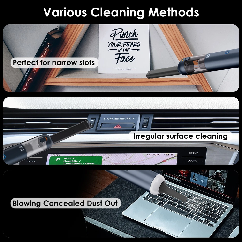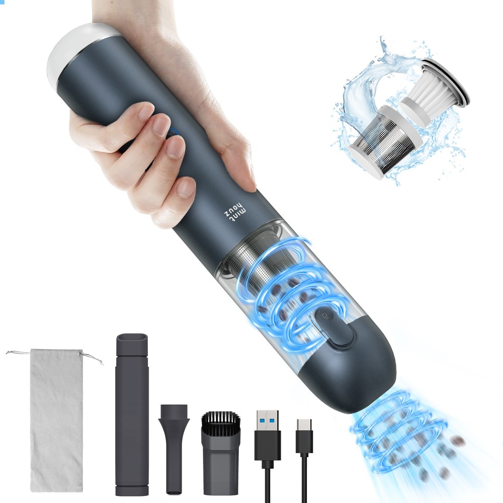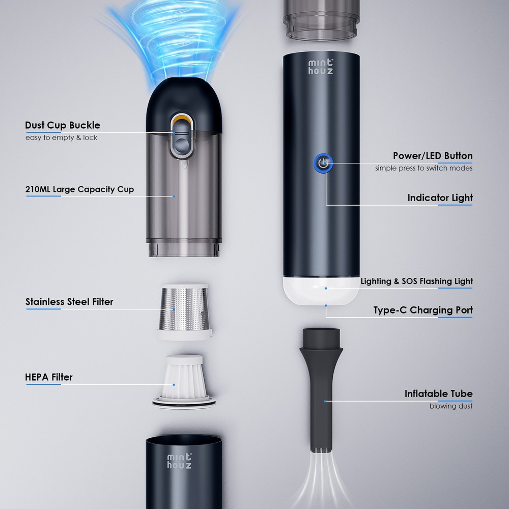 This Car vacuum cleaner original price: $39.99 Only 8 units left, Clearance sale! Limited quantity. Minthouz Mini Handheld Cordless Vacuum Cleaner for Car & Home with 15000Pa Powerful Suction The Minthouz multifunctional handheld cordless vacuum cleaner has 15000Pa strong suction power and is a versatile and powerful cleaning tool that can help you keep your car or home clean and tidy. Its cordless design, powerful motor, multiple attachments, and long-lasting battery make it suitable for multiple cleaning tasks, like removing pet hair, dust, or food crumbs. With a simple and stylish design, the Minthouz portable vacuum cleaner is an ideal choice for home and car cleaning and can be charged at any time. Powerful Motor: The car vacuum cleaner has a high-quality 120W motor, which delivers continuous powerful suction at full speed of up to 74000r/min to meet all of your cleaning needs. Fast Charging: This portable handheld vacuum uses the latest fast charge technology, which can be fully charged in about 3.5 hours. Recommended to use a charger with an output voltage of 5V/2A or larger. Easy to Empty: A one-click buckle allows for simple trash removal and dust cup cleaning. Just one click, and the cap of the dust cup pops open automatically, so it won't dirty your hands when you empty the trash. How to Clean the Filters? ①Rotate counterclockwise to remove the dust cup; ②Pull out the filter system; ③Detach and wash the stainless steel & HEPA filters; ④Air dry the filters completely before use. Button Description 1 (Vacuum Function): 1. Short press it once --- turn on the vacuum function (low-gear) 2. Short press it again --- turn on the vacuum function (high-gear) 3. Short press it again --- turn off the vacuum function Button Description 2 (LED Function): 1. Long press for 3S --- use the lighting function 2. Short press it again --- switch to the red flashing light (Recommended to remove the dust cup and display it upside down) 3. Short press it again --- close the lighting function Note: Vacuuming and lighting functions cannot be used simultaneously. Specification: Model: MT-L011 Color: Pearl Blue Material: Aluminum & ABS Weight: 1.1 pounds Size: 11.9x 2.2x 2.2 inches Suction: 15000Pa (Max) Noise: <85db Battery: 11.1V*2200mAh (3 batteries) Charging Port: USB-C Power/Voltage: 5V/2A Charging Time: 3.5Hours Operating Time: > 20min(Low -gear); > 12min(High-gear) Features: - Helpful to pick up small pieces. - Dual purpose suction and blow. - Low noise operation and better battery life. - Efficient for cleaning dust from sofa or car crevices. - Portable and suitable for both home and car cleaning. - Eddy current booster brushless motor with high speed suction. - LED lights help you deal with emergencies while driving at night. - Stainless steel and filter, double filtration without cleaning dead angle. Tips: 1. Please fully charge it before using for the first time. 2. The vacuum function cannot be used during charging, and it can be used normally after charging. 3. The vacuum is not waterproof; please do not inhale a large amount of water or liquid to avoid damage. 4. Do not inhale high-temperature substances, such as burning cigarettes or hot ashes, so as not to burn the filter or plastic parts. 5. It is normal for the aluminum shell to heat up during use, and it can be used after a period of time. 6. Do not reinstall or vacuum until the filters are completely dry. 7. Please store it in a cool place when not in use and avoid exposure to the sun. In the Box: 1 x Vacuum Cleaner 1 x Brush Nozzle 1 x Long Flat Nozzle 1 x Inflatable Tube 1 x Type-C Cable 1 x Storage Bag 1 x Quick Start Guide