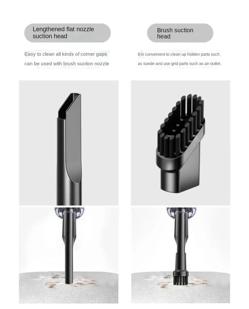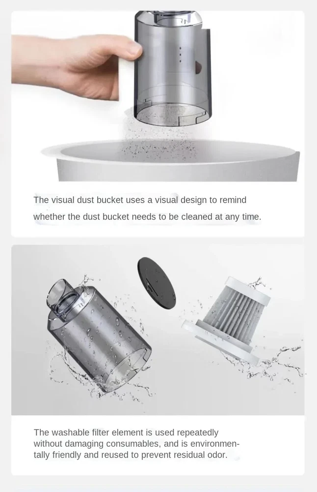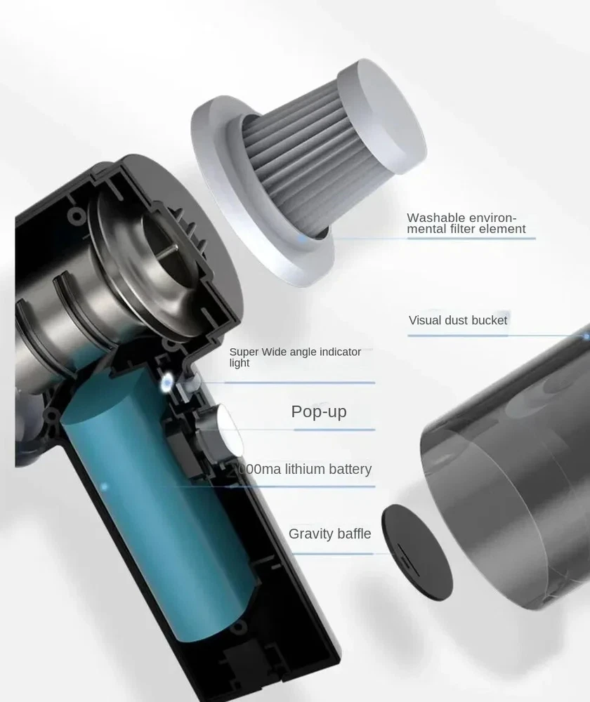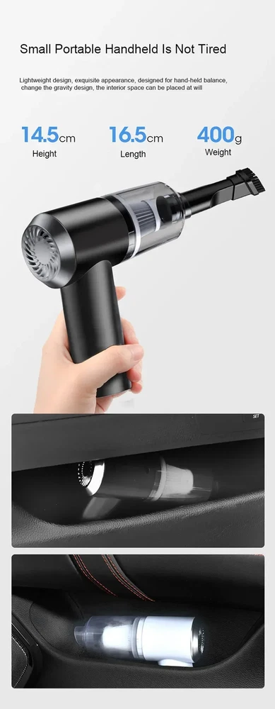 Features: 1.Multifunctional Vacuum Cleaner: The vacuum Cleaner can be used to clean hard-to-reach areas. Handheld Vacuum Cleaner can be a laptop cleaner, desk vacuum cleaner, hand vacuum for car, piano, pet house, office desk cleaning, etc. 2.Cordless & Rechargeable: USB Rechargeable, Comes with a charging cable, which can be connected to a laptop computer, car USB port charging, mobile power supply, etc. 3. Washable HEPA Filter: The HEPA filter is washable and reusable, which keeps dust and dirt out to avoid blockage. Take the filter out of the dust cup of the vacuum cleaner, wash it with water and dry it for second use. (Using tip: If the vacuum filter is full of dirt or suction weakness, please clean the filter in time to make sure the dust buster can work normally). 4. 12KPa Strong Suction : The handheld car vacuum has 12Kpa Strong Suction, Suitable for daily housework to clean up the dust. Output power 120W superpower motor provides strong suction up to 120000pa, which can quickly and easily remove food residues, particles, and pet hair around the house or in the car. Wet/Dry vacuum wireless mobile operation is more convenient. 5. Multifunctional Vacuum Cleaner: Handheld wireless professional car vacuum cleaner, makes your car and home clean every day. The handheld vacuum cleaner has a lightweight body and weighs only 0.40 KG. It is not tired to hold for a long time and is especially suitable for the elderly and women. pecifications: Product Name: Wireless Vacuum Cleaner Color: Black/White Material: ABS Filter: HEPA Washable & Reusable Suction Degree:120000Pa RPM: 5000 Motor: 120W Copper Core Weight: 230kg Runtime: 20-30 Minutes Battery: Built-in Rechargeable Lithium Battery Charging: Fast Charging USB Type C Packing:Boxed Package included: 1 x Brush Nozzle.1 x Slit Nozzle.1 x HandheldVacuum,1 X USB Type C Charging Cable Notice: Due to the different monitor and light effect, the actual color of the item might be slightly different from the color showed on the pictures. Thank you! Please allow 1-2cm measuring deviation due to manual measurement.