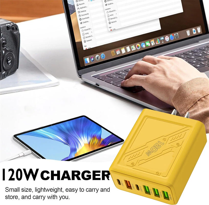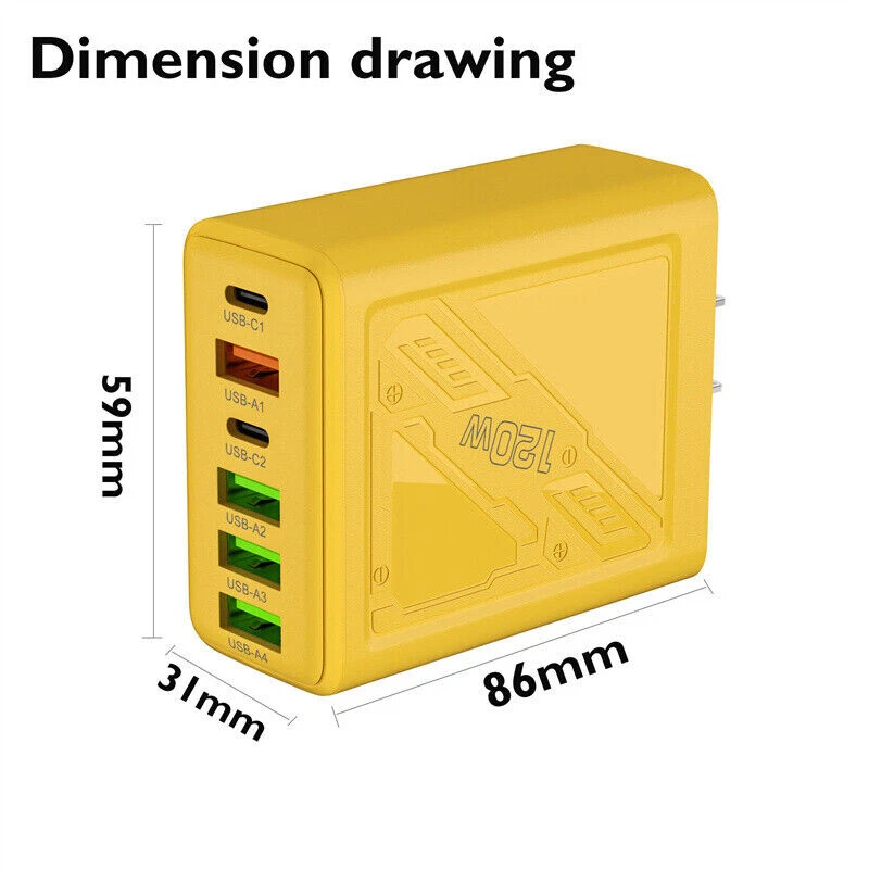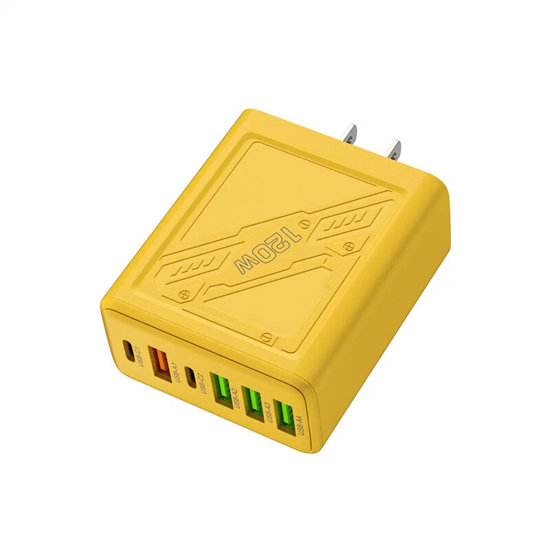 Description: 1. Fully charged, safe to use, with overcharge, overcurrent and overheating protection. 2. Flame retardant material, providing excellent service for you and your devices. 3. Safety: This USB charger adopts shell design, which is not easy to be damaged. 4. Convenient for travel: With global voltage compatibility, compact and portable design, you can charge anywhere. Specifications: Type: Charger Power: 120W Color: Yellow Charger plug: US plug, Warning: This product has 6 plugs with a total power of 120W. When multiple plugs are charged at the same time, the charging speed will be the same as that of a normal charger. If you encounter any problems during purchase or use, please feel free to contact us.
