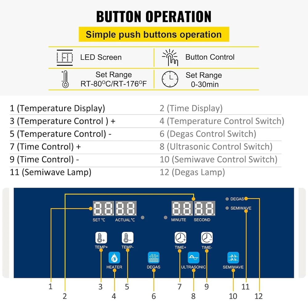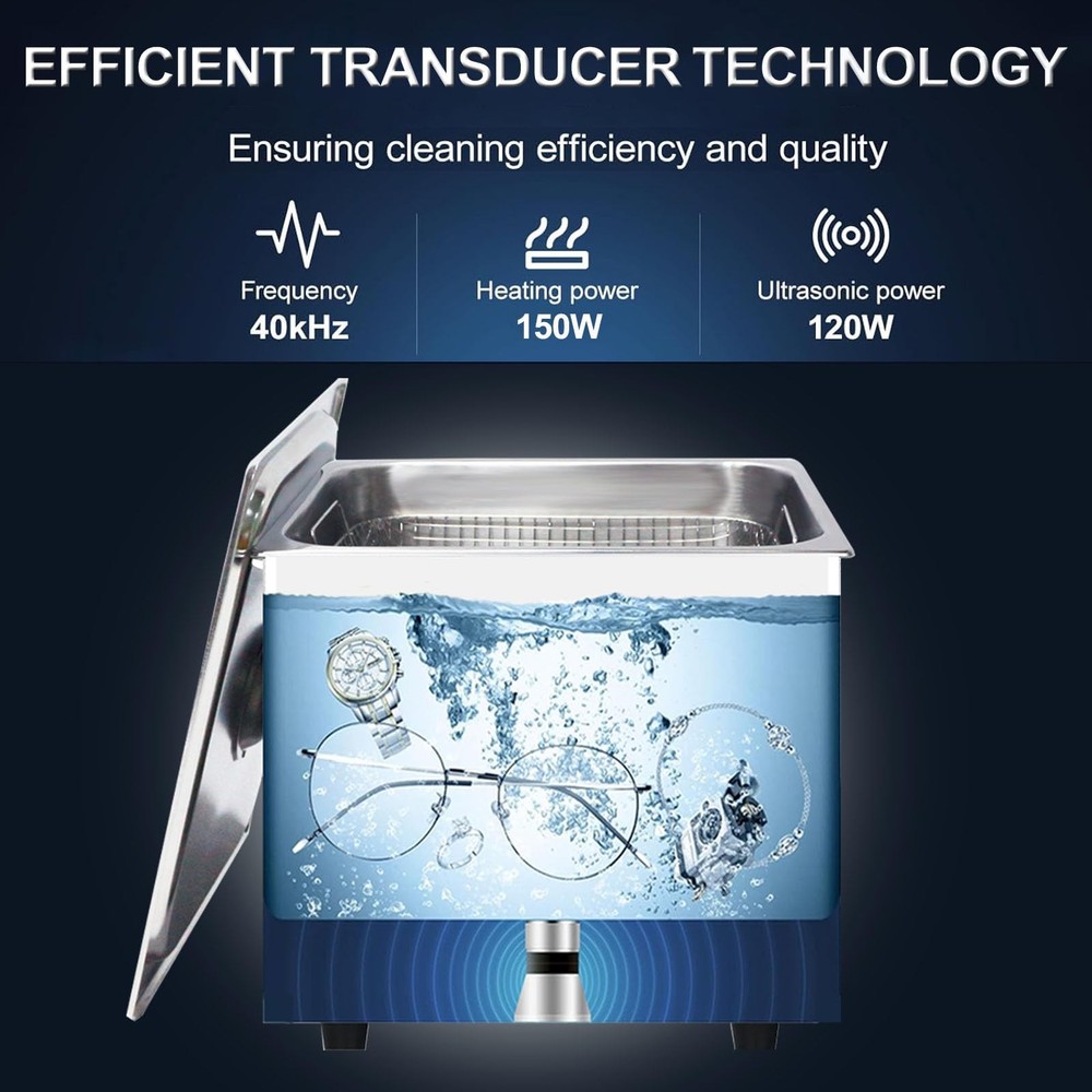Overheat protection Product capacity: jewelry cleaning machine 3.2L 3.2L ultrasonic machine Product power: 120W best jewelry cleaner ultrasonic Operating frequency: 40khz professional eyeglass cleaner machine Inner groove size: 9.4×5.3× 4 in Overall dimension:10.4 × 6.5 × 9.1 in Timer:Digital 1~30min adjustable More Features: Digital Control + Timer + Heater + Degas 【Powerful Cleaning Effect】120W sonic cleaner possesses ultrasonic cleaning frequency 40kHz, ultrasonic power 120W.sonic jewelry cleaner machine have powerful and efficient cleaning performance to remove dirt, grime and contaminants from delicate items 【Heater Timer】The ultrasonic parts cleaner adopts digital control panel to control the working time and accurately determine the temperature. 150W heating power can heat the cleaning solution to effectively remove impurities, stains, anti-rust treatment and so on 【Degas Mode】Ultrasonic cleaning Machine with degassing mode can effectively remove the gas in the liquid, improve the cleaning efficiency, reduce the gas content in the liquid, protect the experimental samples, improve productivity, and extend the service life of the equipment 【Special capacity design 】jewelry cleaner ultrasonic capacity 3.2L, Tank Size: 9.4 × 5.3 × 4 in, made of high-quality 304 stainless steel, with corrosion resistance and oxidation resistance, more durable and sturdy, can be used for many years.is widely used for cleaning jewelry, eyeglasses, watches, circuit boards, dental equipment, and other small parts 【LED Digital Display】Sonic cleaner machine -Time setting: 0-30 minutes. The LED digital timer precisely controls the time 【Firm and not loose 】The ultrasonic eyeglass cleaner machine uses a high-strength flexible fixing adhesive to bond the ultrasonic transducer to the stainless steel tank,preventing the vibrating head from falling off when the ultrasonic cleaning machine is running