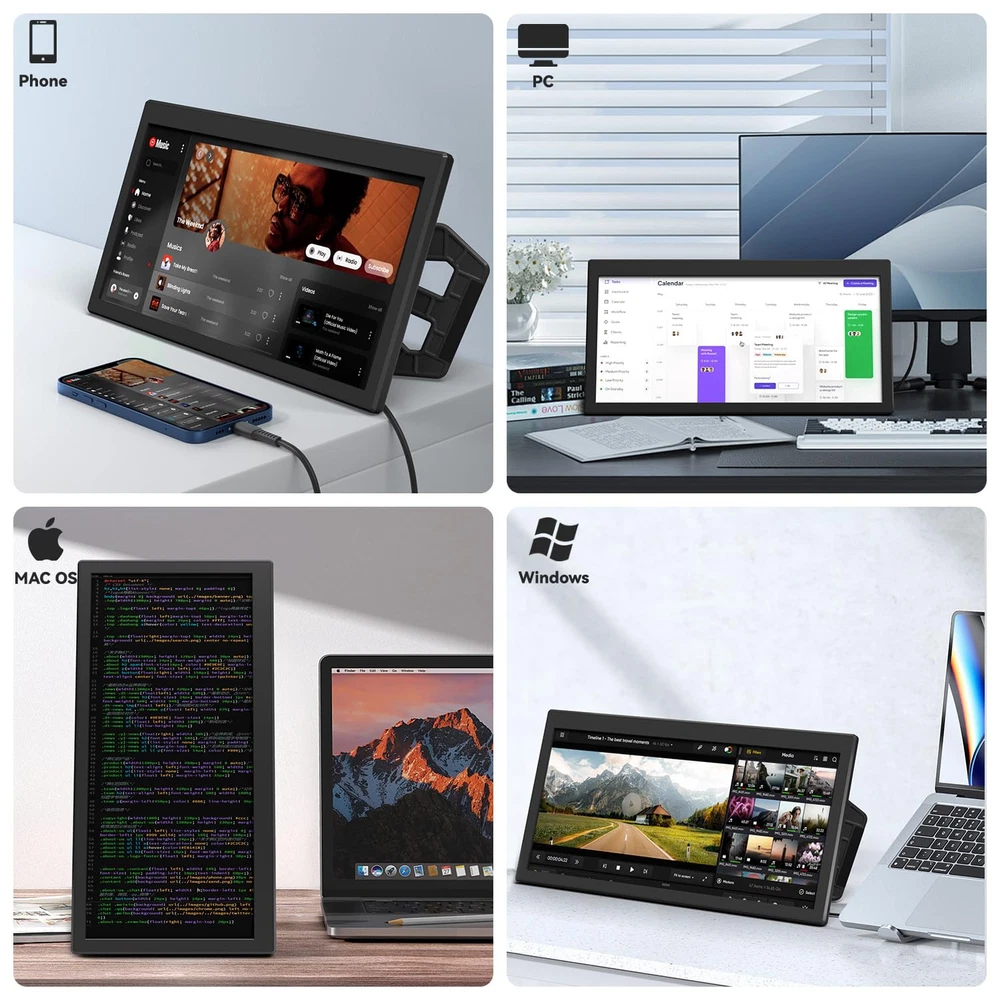 【12.1 Inch FHD IPS Screen】Portable Monitor Expand your workspace with our 12.1" FHD IPS secondary screen. Its 1080x720 resolution offers crisp, vibrant visuals, a 178°wide viewing angle, 60Hz refresh rate perfect for multitasking and increasing your efficiency 【Plug and Play Monitor】Easily connect to your laptop or computer with USB C with DP / Type-C interfaces.As long as it is a Type-C laptop with a signal + power two-in-one, it can be directly connected to the display. 【Improve work efficiency】Efficiently improve your work efficiency by up to 50%, achieve efficient multi-tasking, and also support screen sharing with some mobile phones such as Samsung and Huawei, and support audio and video transmission. 【Stylish and portable design】 The L3 bracket adopts an easy-to-use design, supports horizontal and vertical screen viewing, and is equipped with international standard 100/75mm screen mounting holes to meet various scenarios and multiple application needs. You can choose the best viewing angle for the best visual experience. 【Excellent Customer Service】Our products have a one-year warranty, if you have any problems during use or you are not sure whether your laptop is compatible, you can contact us to provide you with a solution, we will respond within 12 hours.