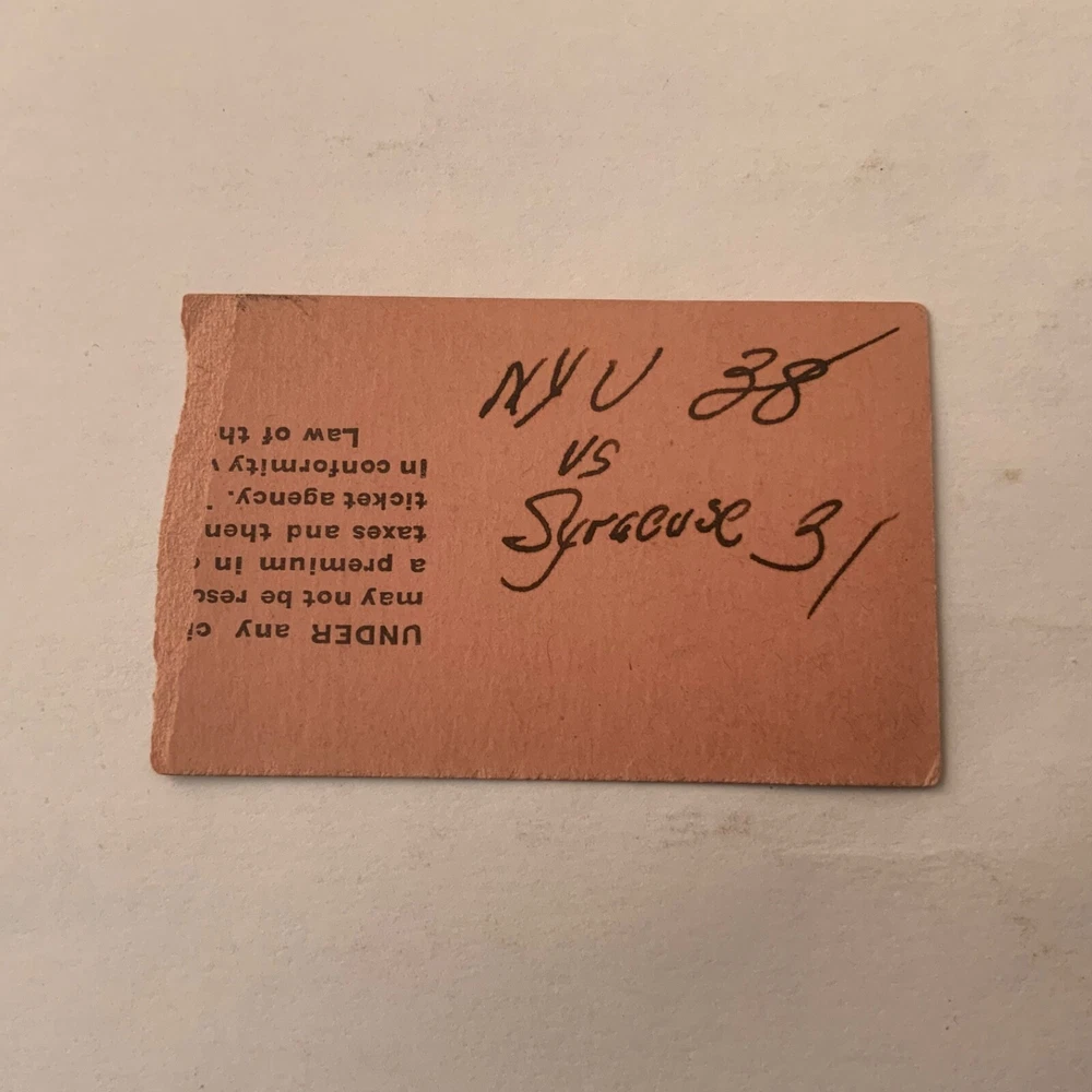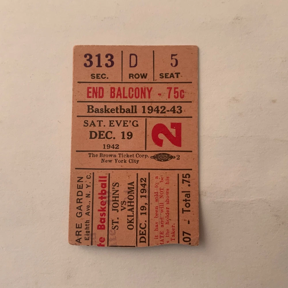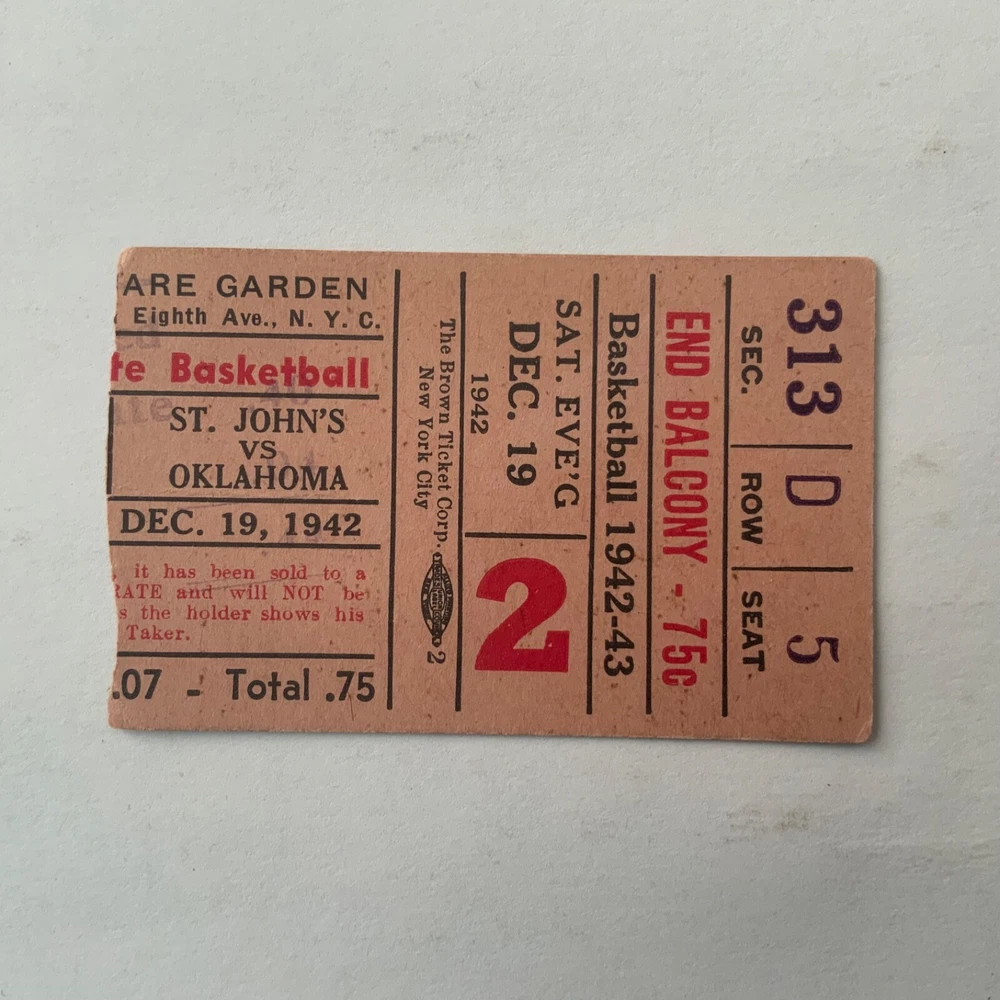 VG. December 19, 1942 - Madison Square Garden. College Basketball Doubleheader ticket stub. NYU defeated Syracuse 38 -31 in the opening game; St. John’s defeated Oklahoma 51 - 34 in the nightcap. St. John’s went on to win its first NIT Championship that season - defeating Rice, Fordham and Toledo in the Tournament quarters, semi’s and finals respectively.