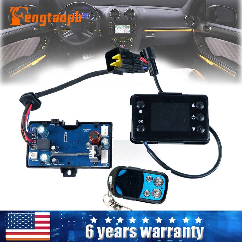 12/24V 2-8KW Car Air Diesel Heater LCD Monitor Remote Control Switch Motherboard Package Included: 1x LCD Switch & Remote & 1x Mother Board Or 1x LCD Switch & Remote Or 1x Mother Board Specification: Color: like the pictrue show Remote distance: Within 10m Voltage: 12V /24V LCD Connector pin: 3 Pins Triangle Plug Remote Control: 4 Button Fitment: For 3KW 5KW 8KW Air Diesel Parking Heater Important Note: 1. There is a transparent plastic protective film on the screen that can be removed before using. 2.If your original motherboard and controller look the same as ours, all black plugs. then you can buy a motherboard or a controller to replace your broken one. If your original motherboard and controller are different from ours, you need to buy motherboard and controller together to replace your broken ones. Or it will not fit for your heater. Remote Control To Code instruction: 1. Pressing the up button to hold more than 3 seconds while in the off setting state. 2. Entering the remote control to the code interface until displaying 【HFR-】. 3. Pressing the up button of the remote to launch the remote code. 4. The heater is on after the remote code disappear, or it won't turn on if the code failed. 5. The code will automatically exit when it is over time. The parameter setting process (press the setting key to enter the setting state) 1 Time setting: Press the up or down key to adjust the parameters, set the hour (24-hour clock), minutes and other parameters in turn, press the enter key to confirm the parameters, and enter the next item. 2 Timing power-on setting: default off, display 1oF press the up key to turn on display 1oN, press the enter key to enter, set the hour and minute in turn. Timing is a countdown mode, up to 99 hours and 59 minutes. 3 Timed shutdown setting: default off, display 2oF press the up key to turn on display 2oN, press the enter key to enter, set the hour and minute in turn. Timing is a countdown mode, up to 99 hours and 59 minutes. Management password input: Press the up and down keys to adjust. When the correct value appears, press the confirm key to enter the next digit. After the 4-digit password is entered correctly, press the confirm key to enter the next item. If the input is wrong, it will return to waiting for the first digit to be entered. . There is no need to modify subsequent data, press the SET button until exiting, or wait for 10 seconds to exit automatically. 4 Pump oil volume setting: Press the up or down key to modify the minimum pump oil volume. After reaching the required value, press the confirm key to enter the maximum oil volume setting; press the up or down key to modify the maximum pump oil volume. After reaching the required value , press the enter key to enter the next item. 5 Fan speed setting: press the up or down button to modify the minimum fan speed, after reaching the required value, press the enter button to enter the maximum speed setting; press the up or down button to modify the maximum fan speed, after reaching the required value, press the enter button Go to the next item. 6 Working voltage setting: The working voltage of the motherboard can only be selected in the shutdown state. Press the up or down key to switch and set the working voltage, adjust the 12V system to display U-12, The 24V system is adjusted to show that U-24 has completed the release. Pay attention to check whether the oil pump, motor and ignition plug of the machine are matched before starting the machine to avoid damage. 7 Speed signal selection: display 5N-1 Press the up or down key to set the speed signal, select 5N-2 if the two magnets of the impeller have the same polarity, and select 5N-1 when the polarity of the magnets is different or there is only one magnet (default value) If this parameter is selected incorrectly, the speed will be doubled. 8 Ignition plug power selection: display PF-5 Press the up or down button to modify the value (1=35W , 2=40W , 3=45W , 4=80W , 5=85W , 6=90W) The default value is 5. It is recommended to use the default value, or modify it after verification. 9 Management password modification: Initially display the oF state, press the confirm key to skip password modification if no change is required, and save the above modified parameters. When modifying, press the up key, after oN is displayed, press confirm to enter the password modification state, press up to down key to adjust, after the 4-digit password is entered correctly, press the confirm key to enter the next digit, save the new password and the adjusted setting parameters and then exit automatically . Note: clock time, time of scheduled power-on and power-off, it will take effect immediately after setting, after setting all the parameters after the management and construction password, you must press OK until you exit after item 9, and then save the set parameters, if you exit midway, the prev