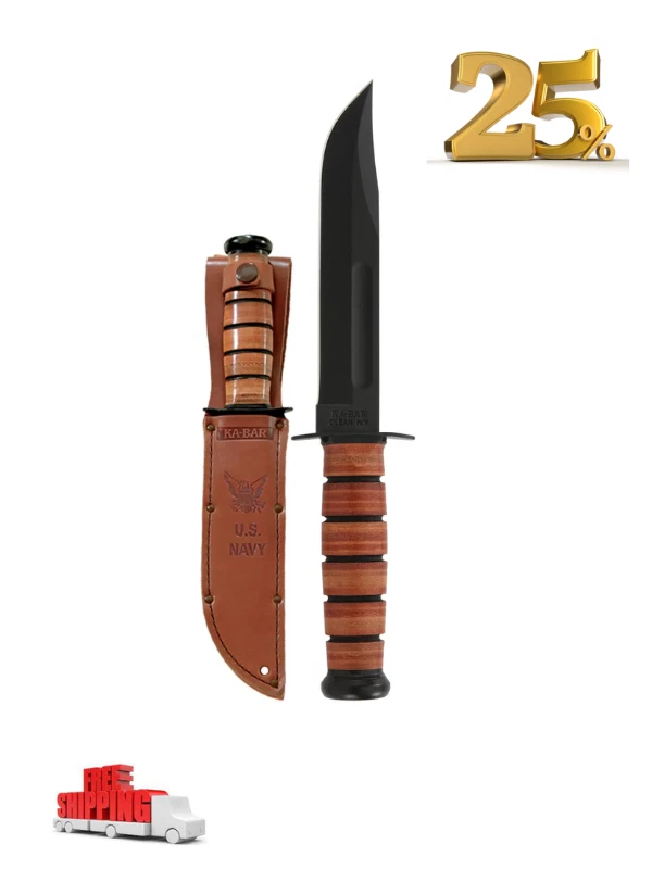 1225 - Full-size US NAVY Straight Edge Weight: 0.70 lb. Blade Type: Fixed Blade Measurements: Blade length 7"; Overall length 11-7/8" Edge Angles: 20 Degrees Shape: Clip Stamp: USN Pocket Clip: N NSN: N/A Steel: 1095 Cro-Van Lock Style: N/A Grind: Flat Handle Material: Leather HRC: 56-58 Butt Cap/Guard: Powdered Metal Blade Thickness: 0.165