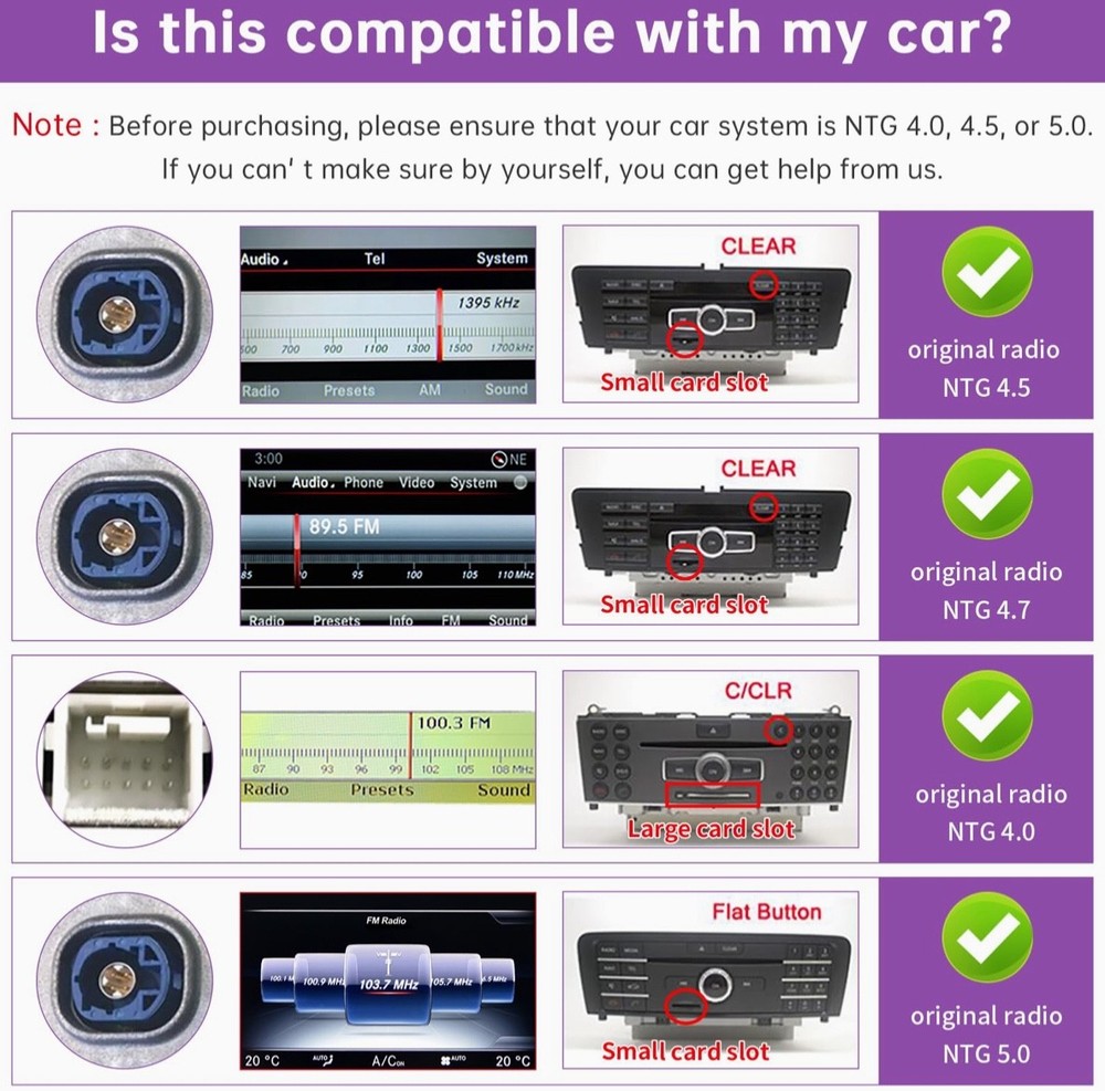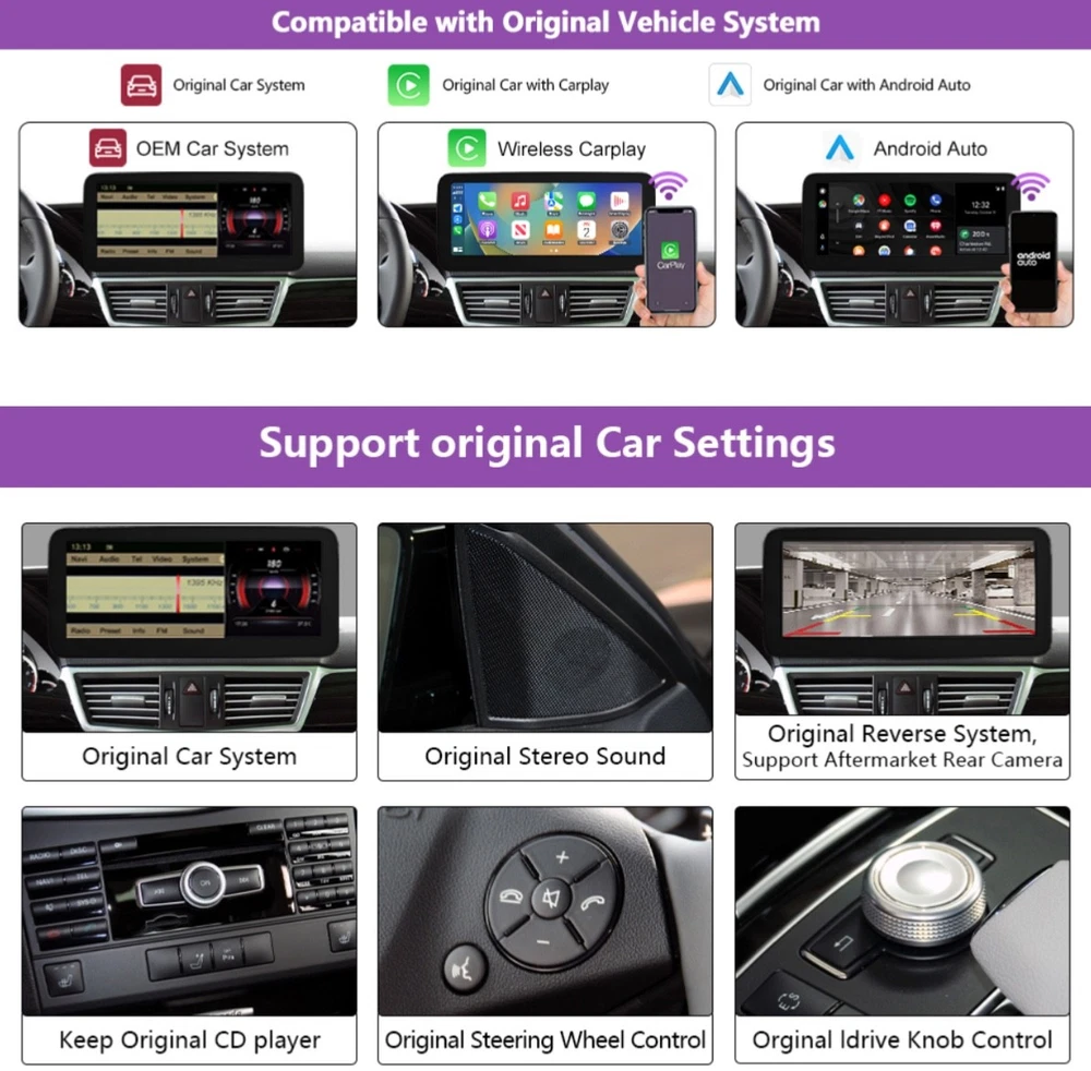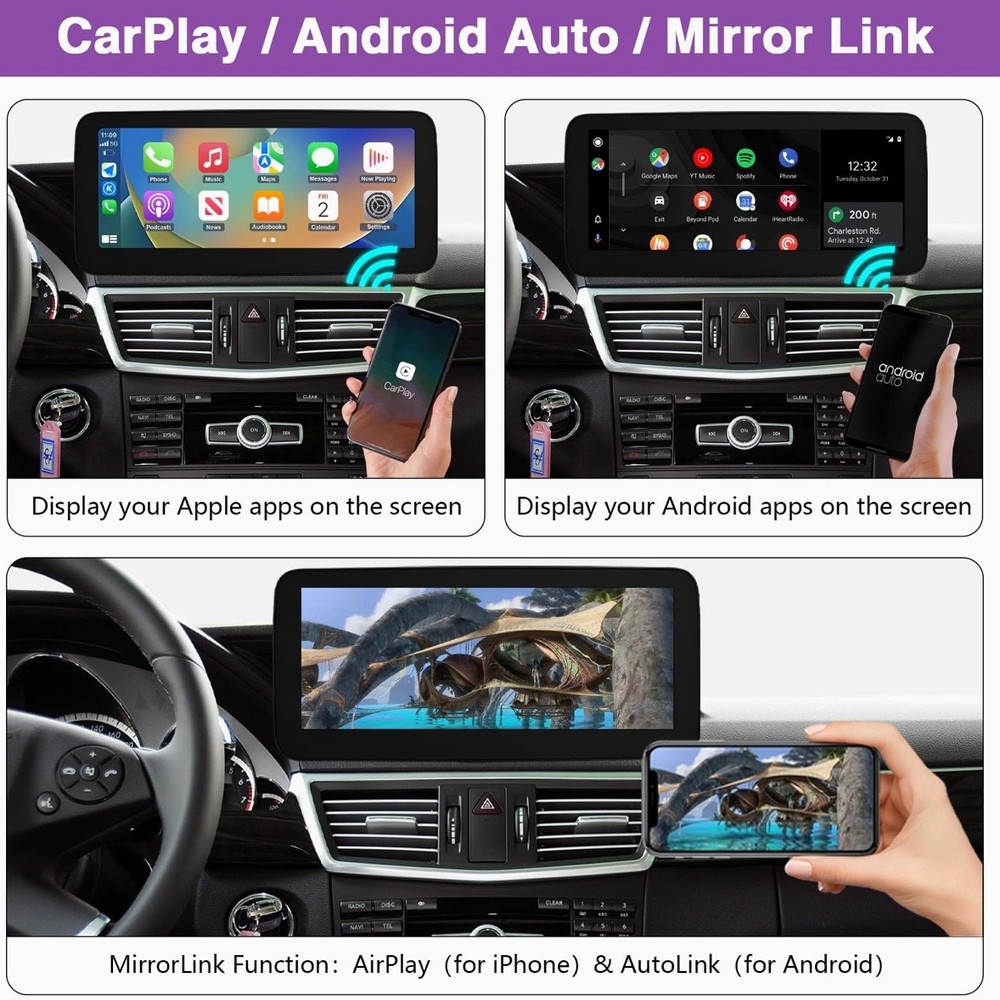 #2732 12.3 inch Touchscreen Wireless CarPlay Android Auto Multimedia Car Radio Receiver Compatible with Mercedes Benz E Class W212 with NTG4.0 System (2009-2012) Brand ninetom Connectivity Technology Bluetooth, USB Compatible Devices Smartphone Total HDMI Ports 1 Connector Type HDMI, RCA Audio Output Mode Stereo, Surround 【Pre-shopping Notes】This touchscreen is compatible with the Mercedes Benz NTG4.0 system. It is not compatible with other systems. It's designed for use with Mercedes Benz E Class W212 (2009-2012). Not Fit for E coupe car.This touchscreen operates on a Linux system, ensuring stable performance without freezing issues over prolonged use. 【Built-in Carplay & Android Auto】Built-in wired and wireless Carplay & Android Auto support Siri or touch display interaction. You can access GPS, make calls, send and receive messages, and enjoy music, among other functions. It's a smarter, safer, and more enjoyable way to use your phone in the car. 【Supports Original Functions】The upgraded touch screen retains all original functions, including the original car radio, amplifier function, factory joystick control, original reversing camera, and more. No software changes are made to the vehicle's control units. It supports the use of original or aftermarket rearview cameras and is compatible with DVR systems. 【Upgrqaded Screen Resolution】You can connect via USB to play your favorite music or videos. The 1920 * 720 HD resolution touchscreen enables more convenient movie viewing and supports mirror link functionality. Automatic light sensitivity adjusts the display between day and night modes based on your car's original headlights, ensuring a more comfortable driving experience. 【Easy installation】 The original car cable allows for plug-and-play installation, eliminating the need for cutting or breaking cables, ensuring a non-destructive process. The package includes an 12.3" touchscreen and all necessary cables. If you encounter any installation issues, please reach out to us for assistance.