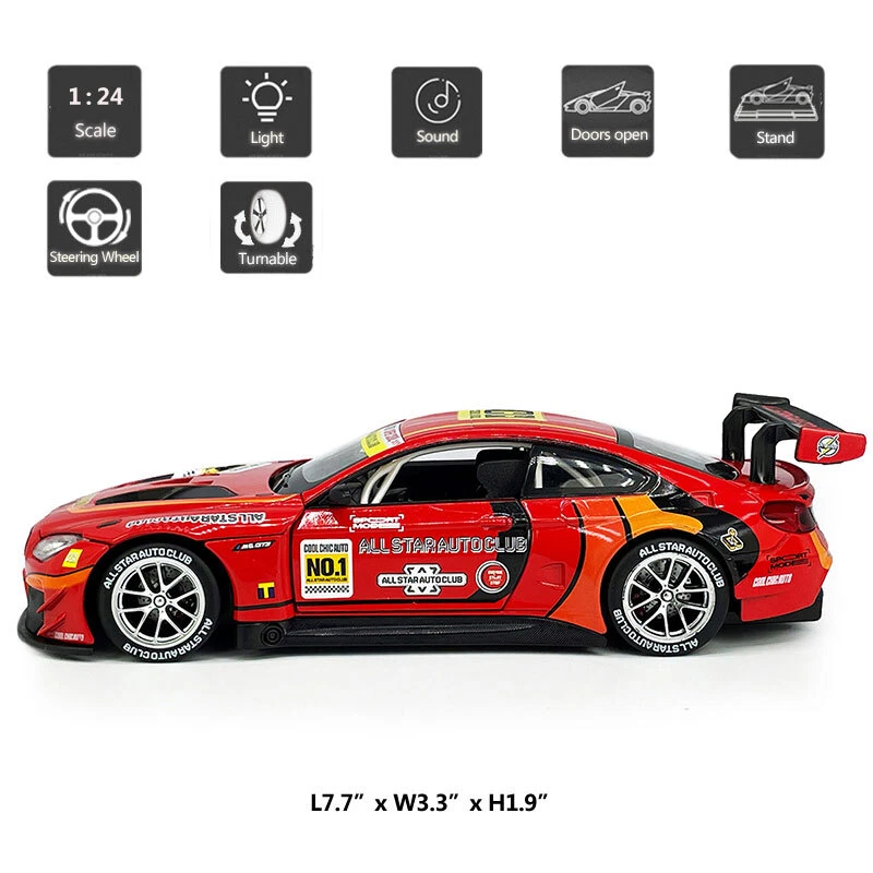 1/24 BMW M6 GT3 Model Toy Car Diecast Toy Vehicle Metal Zinc Alloy Toys for Kids Item Type Diecast & Toy Vehicles Scale 1:24 Material Diecast and ABS Colour Red and white, as picture shows Dimension About L7.7" x W3.3" x H1.9" (L19.5 x W8.5 x H4.8 cm) Vehicle Type Racing Car Function *Two doors and engine cover can be open *The front wheels can turn left and right by turning the steering wheel *Open the door, it will make sound and light Packing Packed in original colour box, in excellent condition Power 3 x AG13/LR44 button cell, power is just for sound and light Tips *Great choice of gift for kids, especially for Birthday, Christmas and New Year Gift *Great item for collector, business gift, home decoration, office decoration, display Warning Don't put in mouth/Keep Away from Fire/Not for Children under 3 Years Notice Due to manual measurement, please allow a little error Package include 1 x 1:24 Scale BMW M6 GT3 Model Car ( Batteries Not Included ) Payment Delivery details Terms of sales Payment We accept paypal only. Delivery details We ship orders within 24 hours upon receipt of payment. Terms of sales We provide great products and service. If you have any problems with the order,please do contact us before leaving negative feedback and opening case on eBay.
