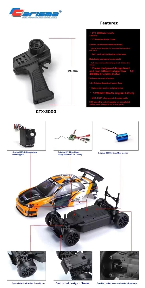 GT24D1/244WDRTR Subaru ST12006 brushless drift car, you can turn any suitable indoor space into a drift field, and practice controlling the drift track fixed point, with locking hard composite drift tires as the standard, this officially authorized product has been Jointly developed with Subaru to provide the classic 2006 ST drift experience in an amazing new Carisma and give end users different drift fun. A complete RTR complete set of finished products with Micro7.2V Ni-MH battery and safe SVUSB charger, including 2.4Ghz radio anti-jamming system, providing precise control and real fever level performance, continue your drift RTR factory assembly and debugging is completed, to play, the new mini remote control, with 3 speed switching functionl Standard original 8000KV brushless motor, brushless electric adjustment, 2.4G remote control system, four-wheel drive off-road, front and rear differentials with limited slip device, metal drive shaft, metal wheel seat drive cup The battery plug is JST, and the maximum size of the battery compartment is 56mm long, 21mm wide and 16mm high. It supports 257.4V lithium batteries and needs to switch battery modes. A 7.2V 130 mA Ni-MH battery is standard.
