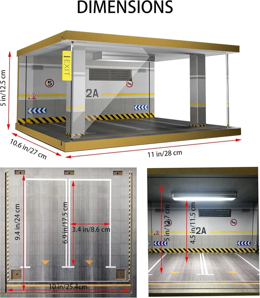 Perfect way to display 1/24 scale die-cast cars. Made with high quality clear acrylic it’s an impeccable way to display and protect your collection. LED lighting with USB connector, safe and great night display effect, especially the detail. Dimensions: 11" X 10.6" X 5" (Exterior). Cars are NOT included.