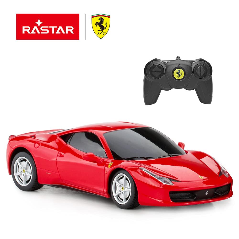RC Ferrari 458 Italia Model Car | Remote Control Red Ferrari Toy Car 1/24 by Officially licensed by Ferrari S.p.A. 1:24 scaled back basing on the real Ferrari 458 Italia car Striking interior and exterior: Made of ABS plastic Sharp streamline design Adjustable front wheel alignment Front shock absorbers Rims and rubber tires Features: Size: Ferrari 458 model car measures 7.8" x 3.8" x 2.1" / Controller measures 4.4" x 3.2" Color available in red Full Functions - Forward, Reverse, Stop, Turn Left & Right Remote range up to 82 feet Speed 4 mph Single frequency available in optional 27 MHz or 40 MHz Car's frequency cannot be converted Batteries NOT included - Requires 3 x AA for the Ferrari Italia and 2 x AA for the remote controller Package includes: 1 x 1:24 grand sport racing remote control car 1 x dual-grip remote-controller 1 x user guide OFFICIALLY LICENSED BY FERRARI – 1:24 scaled back on real Ferrari 458 Italia car; Ferrari rc car measures 7.3 x 3.8 x 2.1 inch. FULL FUNCTIONAL RC CAR - Forward, Reverse, Stop, Turn Left & Right; the Ferrari toy car works best on the flat surface and can be used indoors or outdoors. HIGHLY DETAILED FEATURES - Sharp streamline design, adjustable front wheel alignment, front shock absorbers, rims and tires, metallic paint finish. EXCELLENT PERFORMANCE - Radio remote controlled, Speed 4 mph, Remote range up to 82 feet, Single frequency available in 2.4GHz, which allows multi-users to race several cars together at the same time without interference. BATTERIES NOT INCLUDED - Requires 3 x AA for the Ferrari remote control car and 2 x AA for the remote; Package includes 1 x remote control toy car 1:24, 1 x dual-grip remote-controller and 1 x manual; Choose Official for free replacements, accessories, and better after-sale service.