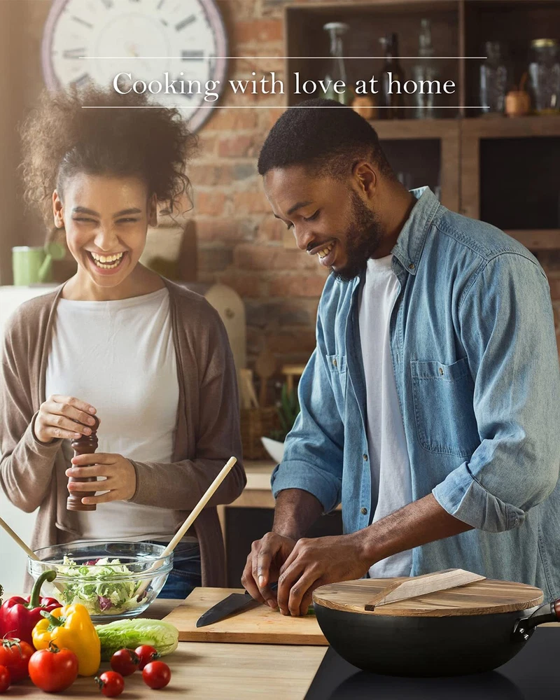 SUPERIOR VALUE: Our wok possesses a thicker body, 1.5cm as opposed to the standard 1.2-1.4cm, guaranteeing optimal and even heating, therefore enhancing your cooking experience. With the addition of unique aluminum components, a beechwood handle, it delivers something more - elevating both its practicality and aesthetic appeal. MUlTI-PURPOSE WOK SET: The wok, crafted from carbon steel, boasts exceptional heat conduction and durability, perfect for creating authentic Chinese cuisine. It is also versatile, suitable for cooking a wide variety of ingredients and adaptable to numerous cooking methods. This helps maintain the flavor and nutritional value of your food. So go ahead and give it a try! EMBRACE A HEALTHIER & LASTING:The surface is nitrided, our woks are proudly Teflon-free. Although not a typical non-stick woks & stir-fry pans, rest assured, with the right seasoning, its performance only gets better! And what's more, its life is significantly extended, and the risk of rust is lessened. SUITABlE FOR ALL STOVE:SUITABlE FOR ALLSTOVE: The flat-bottom design makes it suitable for all types of stoves, including , gas, ceramic, induction, and open flame.The removable wooden handle allows you to easily put it in the oven, oven-safe to 450F. SOME DETAILED DESIGNS: The step design made the wooden lid to match the pot, the soup mouth design is easy to pour soup, the detachable handle is easy to save, also easy use in the oven and the hammer pattern looks very special. CARE & GUIDELINES - We value your suggestions for our product. Remember, refer to the manual before first use. Clean promptly and keep dry after each use to prevent rusting. Regularising cooking oil application after cleaning will keep it in the best condition.