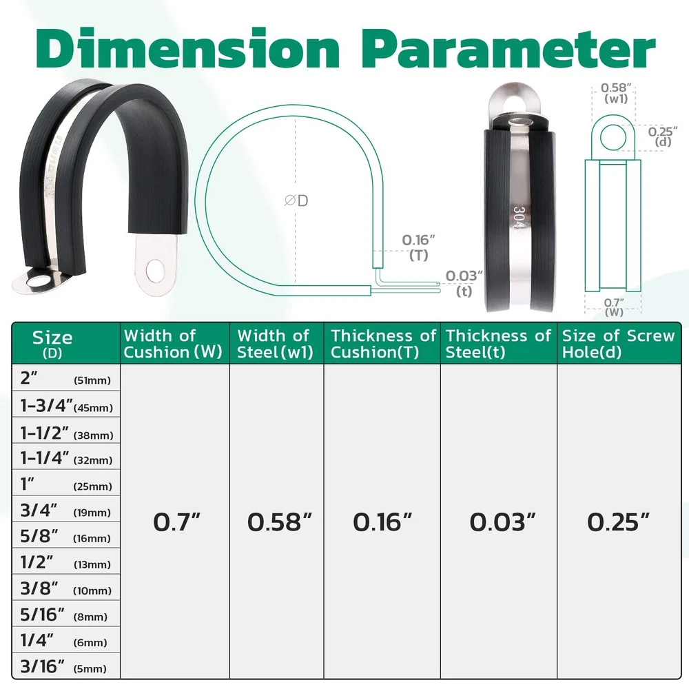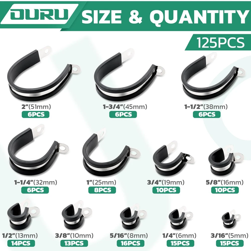 125PCS Cable Clamp,12 Sizes Stainless Steel Rubber Coated Cushioned Insulated Ca 125PCS Cable Clamps Assortment Kit —The stainless steel cable clamps assorted box including 12 different sizes,15pcs 3/16’’(5mm),15pcs 1/4’’(6mm),16pcs 5/16’’(8mm),13pcs 3/8’’(10mm),14pcs 1/2’’(13mm),10pcs 5/8’’(16mm),10pcs 3/4’’(19mm),8pcs 1’’(25mm),6pcs 1-1/4’’(32mm),6pcs 1-1/2’’(38mm),6pcs 1-3/4’(45mm),6pcs 2’’(51mm),various sizes are available to meet your needs Thick Metal Strap-Each stainless cable clamp is made of 304 high quality stainless steel with rubber coated cushioned,less susceptible to deformation and bending.Excellent performance in abrasion,moisture,rust and heat resistance even in harsh environments.It is strong and will not rust or break.It is the best choice for indoor and outdoor Durable Rubber Cable Clips-Reinforced EPDM tape,anti-cracking.The nylon rubber cushioned on the tube clamp prevents damage caused by shock due to vibration,effectively protects the line and tubing.Silicone insulation provides a safer installation.It can be firmly fixed in the right position,clamped tightly without wiggling Easy Installation-The 125pcs cable clamp set(5-51mm) in a storage box for easy to carry and store. With unique R-shaped design,flexible twisting and easy to control during installation,simple disassembly.You only need to use a screwdriver and screws to fix the clamps in the proper place,save time and effort.It can be recycled and reused,can be used for a long time Ideal for Application-The marine grade rubber p clamp.Used to fix and support pipes or wires and cables in automotive,industry,boat,outdoor,home decoration,DIY,RVs and any place where vibration may occur.Such as wires,cables,pipes,line management and repair Shipping We offer FREE shipping on all orders! We ship within Three business days of payment, usually sooner. We use a selection of shipping services such as UPS, FedEx, USPS etc. We only ship to the lower 48 states, no APO/FPO addresses or PO Boxes allowed. Local pickups and combined shipping options are not provided at this time. Return You can return a product for up to 30 days from the date you purchased it. Any product you return must be in the same condition you received it and in the original packaging. Please keep the receipt. Payment We accept payment by any of the following methods: PayPal Please pay as soon as possible after winning an auction, as that will allow us to post your item to you sooner! Feedback Customer satisfaction is very important to us. If you have any problem with your order, please contact us and we will do our best to make you satisfied. Contact Us If you have any queries, please contact us via ebay. We usually respond within 24 hours on weekdays. Please visit our eBay store to check out other items for sale! Thank you for shopping at our store.