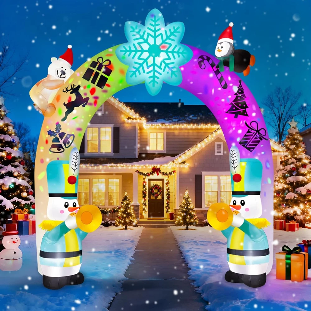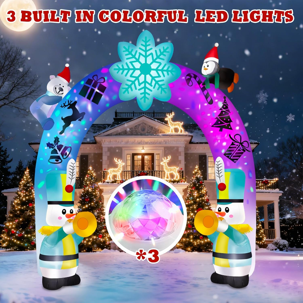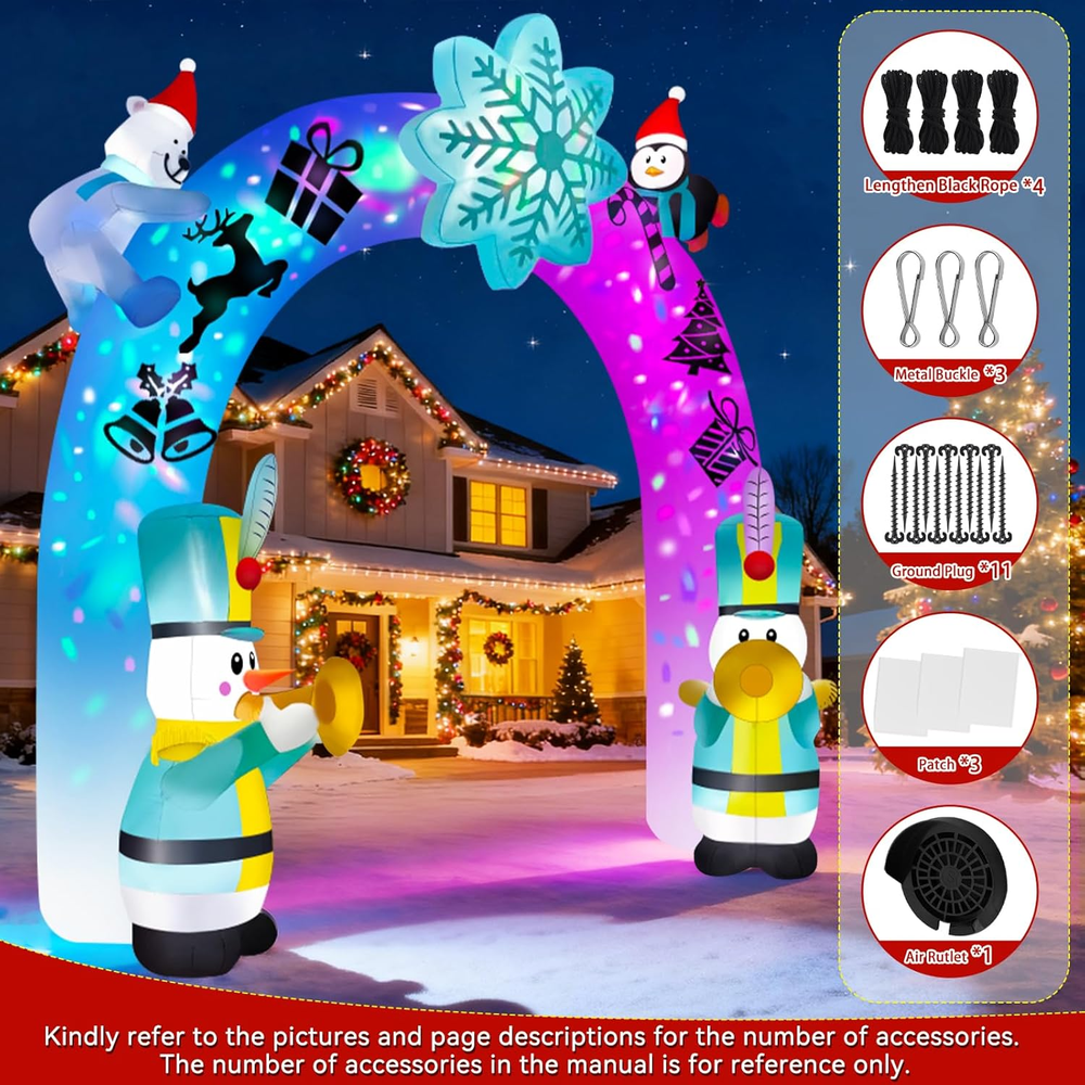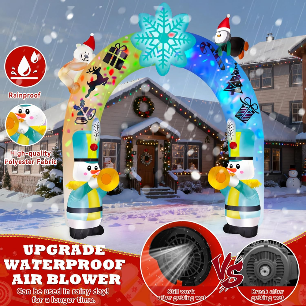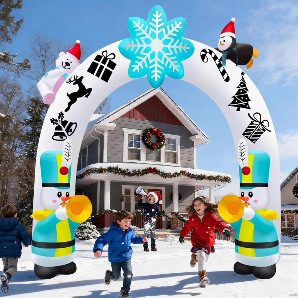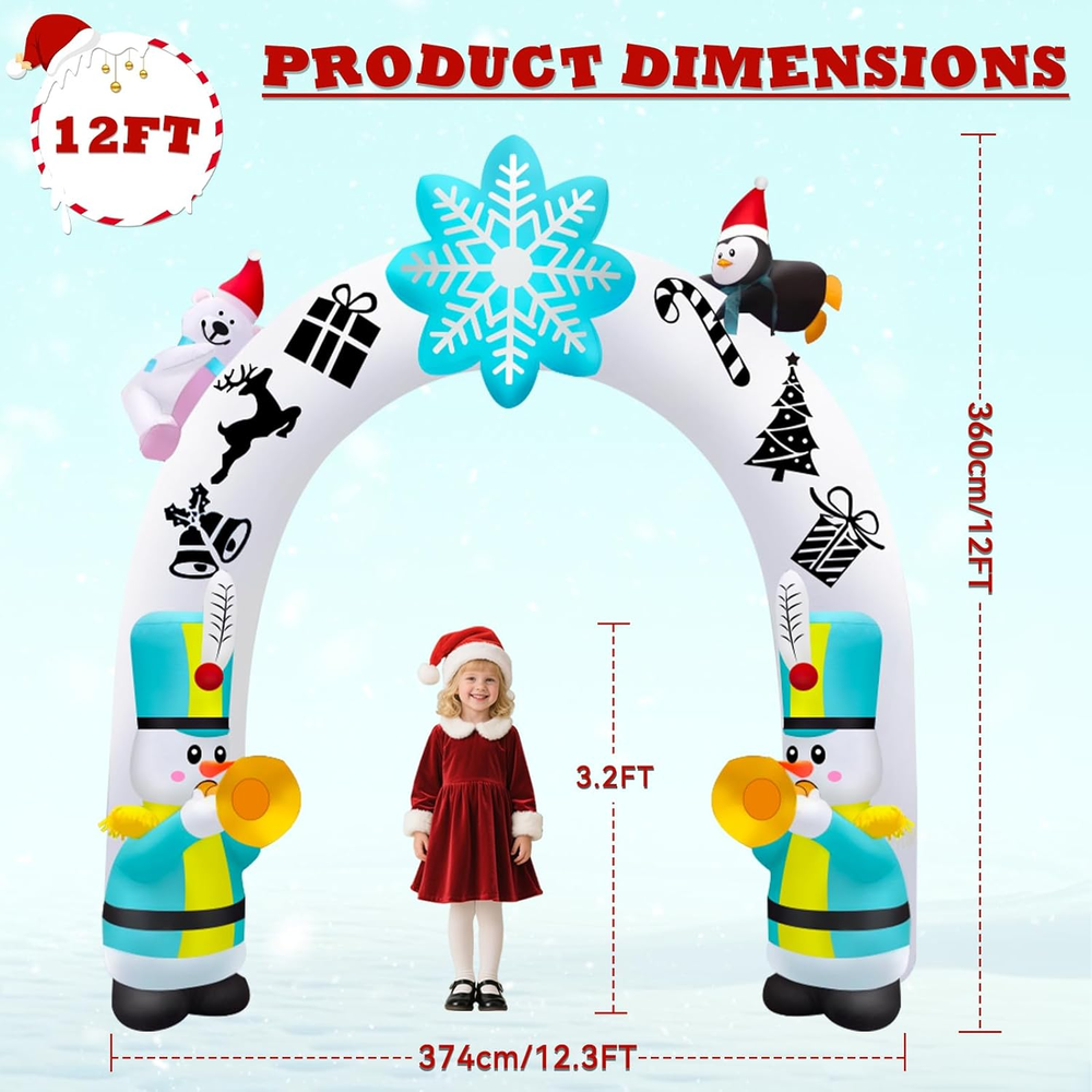 【12FT Lovely Snowman Inflatable Arch】Transform your home into a fairy-tale Christmas kingdom with Kalolary eye-catching Christmas inflatable arch! Standing on either side, jubilant snowman soldiers play musical instruments to welcome guests, while an adorable penguin and a bear climb the arch adorned with classic Christmas elements like snowflakes, Christmas trees, and reindeer—creating a joyous and enchanting holiday atmosphere for your Christmas celebrations! 【Built-in Bright and Colorful Lights】 This 12ft giant Christmas inflatable outdoor decoration features 7 white LED lights and 3 colorful LED lights, making it perfect for Christmas party decorations. As night falls, the bright and vibrant lights instantly transform your yard into a splendid winter wonderland. The brilliant lights create a mesmerizing spectacle, offering an amazing and unforgettable visual experience for every guest and passerby. 【Upgraded Waterproof Air Blower】Our Christmas inflatable archway comes equipped with an improved waterproof and powerful built-in air blower, ensuring durability and resistance to damage even in damp conditions. Simply zip up the bottom, plug in the power supply, and it will inflate in a few minutes. Additionally, the included 11 ground stakes, 3 black ropes, and 3 metal buckles secure the arch inflatable perfectly in your yard, so you won't have to worry about it blowing away. 【Superior Craftsmanship】Our Christmas blow up yard decoration is made of high-quality waterproof polyester fabric, featuring excellent waterproof, fade-resistant, and tear-resistant properties to withstand harsh winter weather. Superb stitching ensures this charming snowman soldier arch inflatable retains its perfect shape and vibrant colors, bringing lasting festive cheer to your Christmas celebrations. 【Perfect Christmas Decoration】Whether for the home yard, lawns, gardens, or to decorate Christmas parties and commercial events, our inflatable Christmas decoration is an ideal choice for your holiday decorations. With its vibrant colors and dazzling lights, this adorable snowman soldier archway inflatable will shine brilliantly on your Christmas night, drawing passersby to pause and take photos with it. Product description