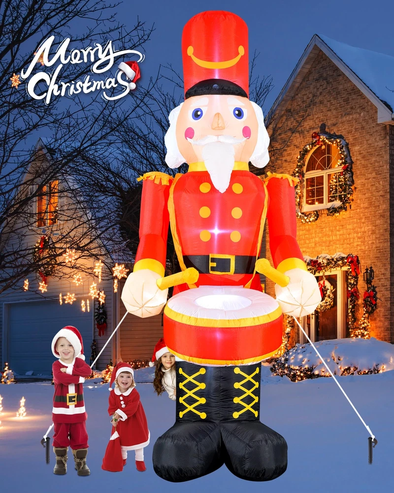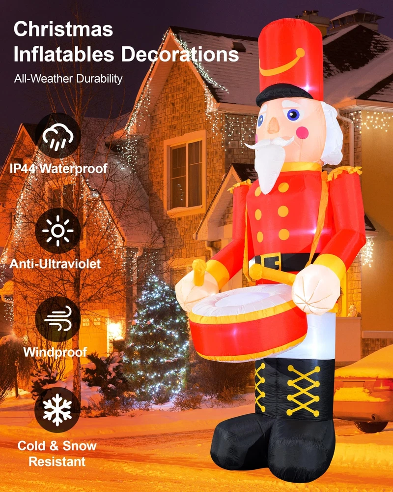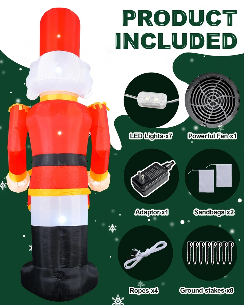The Christmas Inflatables are a delightful addition to the holiday season. These charming decorations feature festive designs such as Santa Claus, reindeer, snowflakes, and Christmas trees, bringing the joy and magic of Christmas to life. They are made of high-quality materials that ensure durability and long-lasting beauty. When illuminated, the christmas inflatables emit a warm and inviting glow, filling the space with a cozy and festive atmosphere. These christmas inflatables can be hung from ceilings, placed on tables, or used to decorate trees and other areas, adding a touch of sparkle and cheer to any setting. They are a wonderful way to spread the holiday spirit and create a memorable and magical Christmas experience for everyone. Whether you're decorating your home or hosting a Christmas party, the christmas inflatables are sure to be a hit. 12-inch Inflatable Nutcracker: Christmas inflatables with built-in LED lights, emitting a soft and charming light at night to illuminate your entire yard High-Quality Materials: Made of high-polyester PVC waterproof material, durable, injecting charm and joy into the festival Easy to Inflate and Deflate: The built-in fan light fully inflates within minutes of plugging in, and when unplugged, the inflatable nutcracker automatically deflates for easy storage High-Quality Materials: Inflatable Christmas made of high polyester PVC waterproof material, durable and can continue to enjoy every holiday What You Get: Comes with 2 inner sandbags, 2 ropes and 4 wooden stakes, making it easy to stabilize in strong winds, and our friendly customerservice