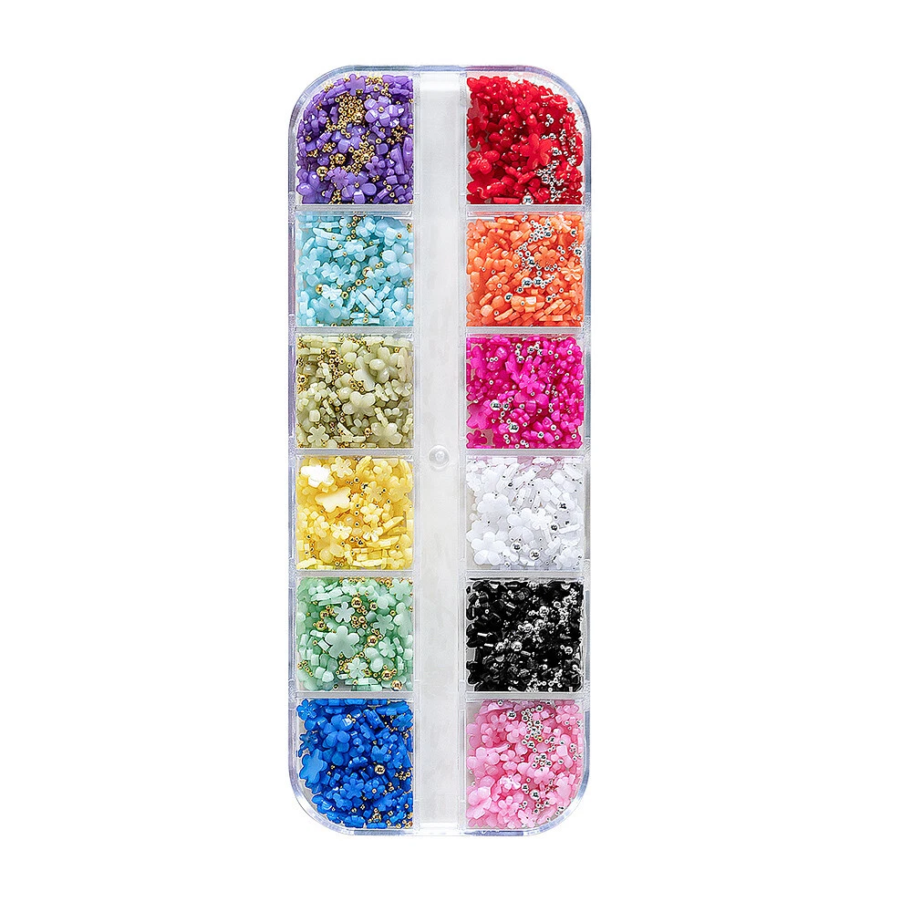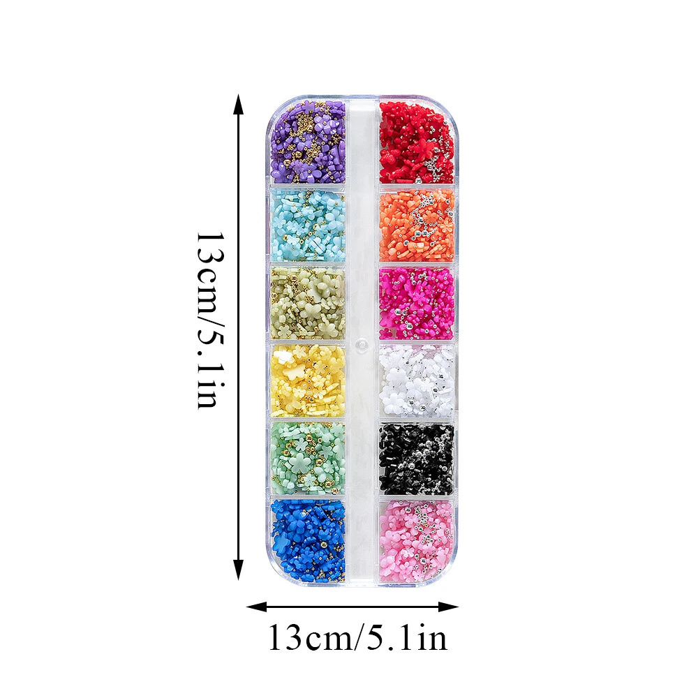 100% New And High Quality 3D Nail Art Charms Assorted Colors in Each Pack Color:Mix Color Material: Resin Package Included: 12Grids/box 3D Mixed Nail Rhinestone How to Apply: -Use A hand file or electronic file to gently file the back of the gem so there is a rough surface. -Wipe the nail off with an alcohol wipe to clean off any oils or products. -Use a small bead of acrylic and place it on the back of the charm and then gently apply pressure to the nail while holding the charm in place. -If you do not desire to use acrylic, use a thick rhinestone gel and place a small bead of it onto the back of the charm and hold in place while curing under a LED / UV lamp for a full 60 seconds. Note: Keep away from children to avoid eating!!! Please allow 1-3cm differences due to manual measurement, thanks. Please understand because of the light irradiation or computer display difference, so I can't guarantee photos and real color is 100% the same.