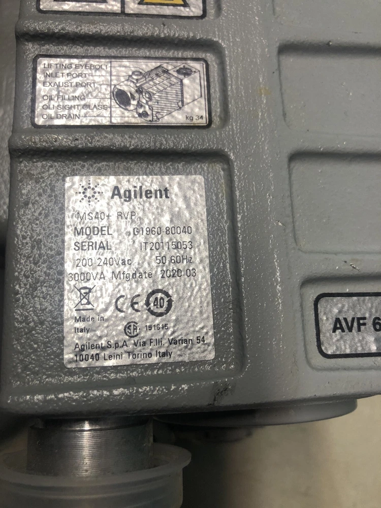 The MS40+ is the roughing (foreline) pump of choice for LC/MS and ICP-MS instruments. The MS40+ single-stage, oil-sealed rotary vane pump that provides a high pumping speed in a pump with reduced dimensions is equipped with an integral exhaust /oil filtration system featuring replaceable exhaust filter elements. This makes this pump suitable for high gas-throughput conditions, and providing a base pressure of < 5 -2 mbar. KF25 Flange inlet and outlet- High pumping capacity, small footprint Inverter-driven motor allows speed and pressure adjustment, and reduced power consumption High pressure stability in the 10 -2 mbar pressure range Dimensions (WxHxL) 298 mm x 266 mm x 419 mm Exhaust Connection NW25 Height 266 mm Input Voltage 200-240V, 50/60Hz Length 419 mm Noise Level ≤62 dBA Oil Capacity Min/Max 1 L ALIGENT MS40+ Jobsite left over- comes just as shown-no other hardware is available with sale- This pump was to be installed but refused by facility director decause of light dings,dents,or scrapes on pump. These should have no effect on operation of pump.We offer no returns ,refunds,credits,exhanges or warranty with this pump we are not retail store. use it whole or piece it out as your needs dictate- Original $4600.00 purchase price -please find out more information through manufacturer or representive websites Comes exactly as shown-will ship to contiguious states only by ground. Some frieght allowance included in price- if frieght excedes our allowance -order will be cancellled- WE HAVE OTHERS WE ARE NOT ACCEPTING RETURNS ON THIS ITEM- SCRATCH AND DENT CLEARANCE ITEM-