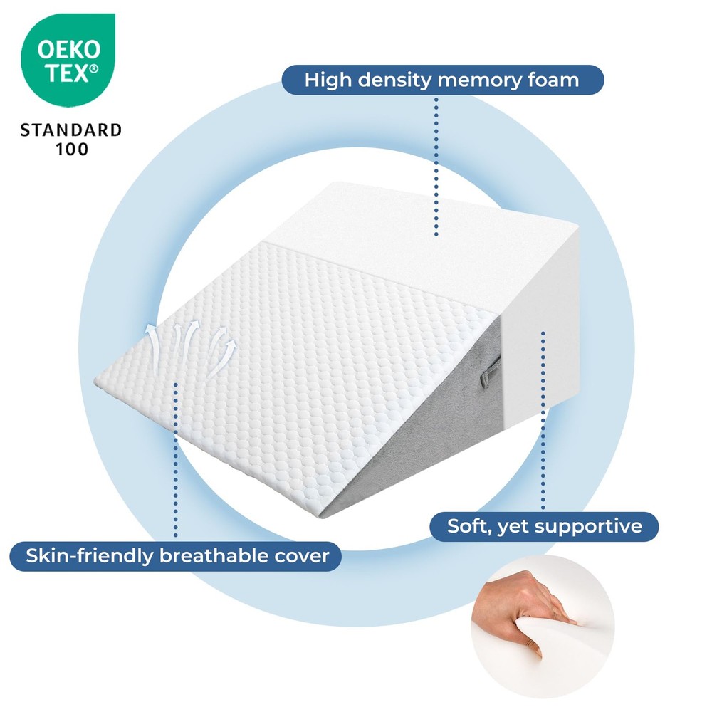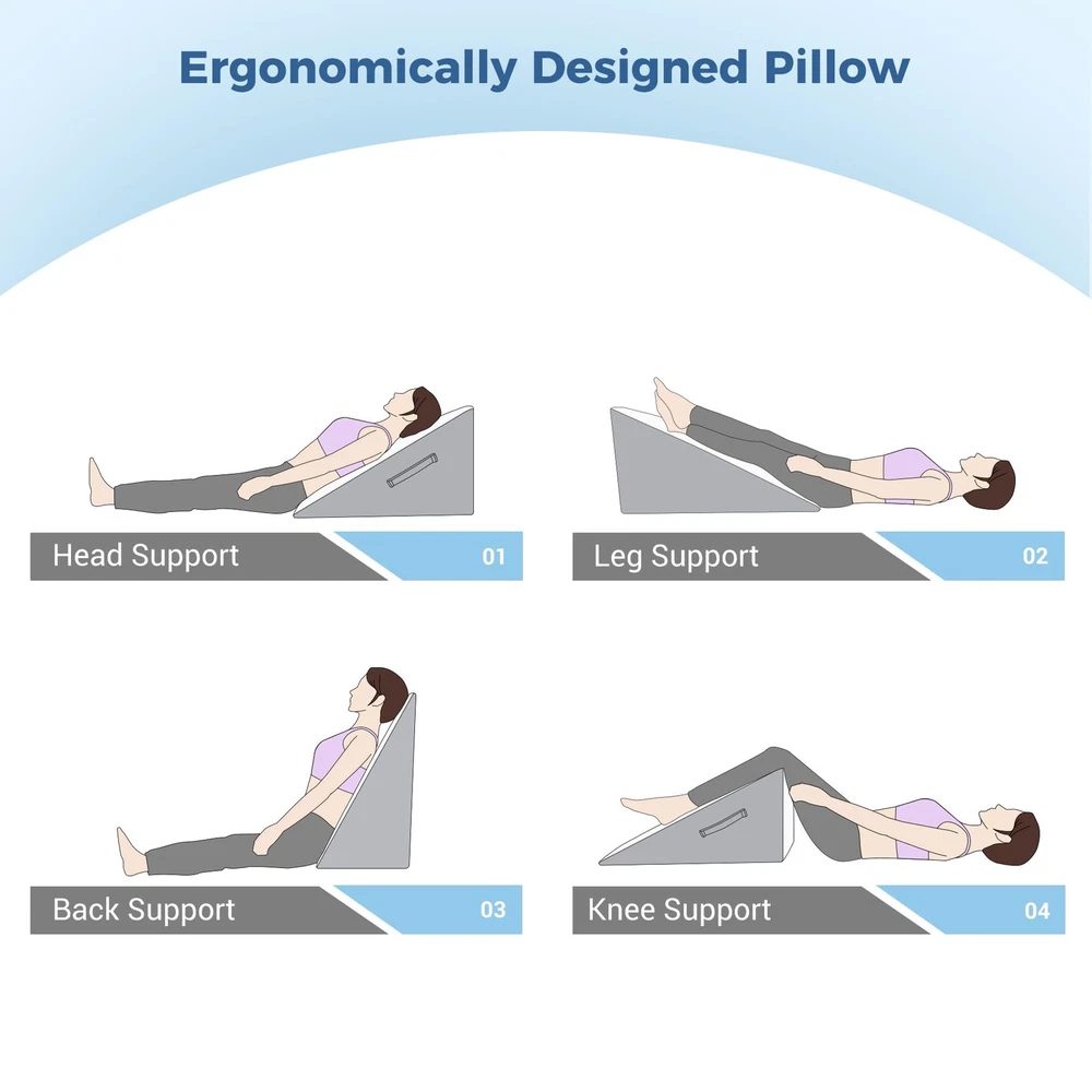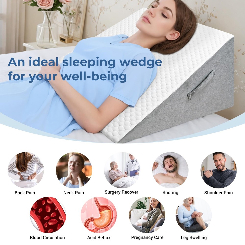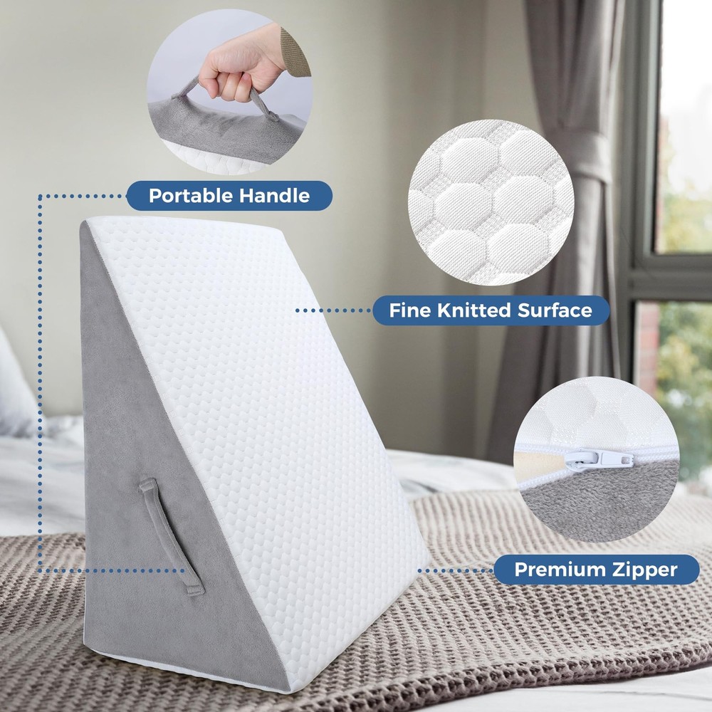 Ergonomic Bed Wedge Pillow: The bed wedge is soft, yet supportive, It remains uniform in density and conforms to your shape to reduce pressure points, help increase blood flow and provide the support, comfort and alignment you need for a comfortable and restful sleep - Foam wedge specifically designed for ultimate relaxation. Premium Bed Triangle Wedge Pillow: The ergonomic wedge pillow is made of premium-grade memory foam, which is comfortable and breathable, bed wedge pillow for sleeping has been certified by CertiPUR US and OEKO-TEX, which is safe and hypoallergenic Versatile Wedge Pillow: It not only improves your sleep quality, but it is also a multifunctional lifting pillow. Wedge pillow can serve as a head or back pillow, providing just the right amount of support to help you relax your body while reading or watching TV. Place it on your lap during work to effectively isolate the heat from the computer, keeping you cool and comfortable Friendly-design for Pain Relief: Supportive and elevated post-surgery wedge pillow helps you reduce snoring, relieve back pain, acid reflux and breathing issues, improving blood circulation and health. Ideal wedge pillows for after surgery and sleep apnea, providing more comfortable night's sleep for you Breathable and Removable Cover: The wedge pillow has a removable soft and breathable air layer pillowcase, which can be washed by hand or machine. Besides, with a handle, our foam wedge pillow is easy to carry and move around Good Choice: If you struggle to sleep at night, this wedge pillow for sleeping is a good choice for you, it can help you solve the problem. Whatever concerns about the wedge pillow you have, we provide customer service for you and reply within 24 hours