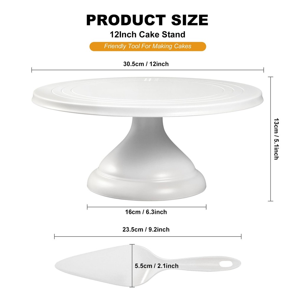 This 12 Inch White Round Cake Stand with Cake Spatula Perfect for 8 inch, 9 inch, 10 inch, 11 inch Cake,modern design and elegant in shape, it can use as a cake display, cupcake stand, dessert stand or serve candies, cookies and fruit, even Bbq outside etc, it is perfect for parties, showers, holiday gatherings, weddings, birthdays, Christmas and other events. The Stand is easy to assemble, sturdiness and easy to clean. đ°ăExpand SizeăLarge cake stand for kitchen is with diameter 11.8â,height of 5.23â, suitable for cake 8 inch, 9inch,10inch, 11inch in diameter, perfect cake tray for 10inch, 11inch cake, the cake Spatula utensil are Length 9.25â and Width 2.2â, This cake pedestal is also perfect for display or serving your cupcakes, macarons, candies, cookies, fruit, or other desserts đ°ăSafety MaterialăThe round cake stand sets are made of bamboo fiber, which is thicker and more textured than plastic. More resistant to falling than porcelain. A durable material that is BPA free, as well as top rack dishwasher safe, do not microwave, Phthalates free, Heavy Metal free, PP & PVC free. Food safety and environmental protection are our philosophy đ°ăElegant DesignăThe surface of the cake plate is flat and smooth,designed for easy slicing and serving cakes. Widening and weighted base design make the pedestal cake stand more stable on the table, even while holding two-tier wedding cakes. Seamless connection of threaded structure base is more solid and stable đ°ăColorăThe cake stand and cake spatula are same color classic black and same materials, they are modern and chic enough to be your first choice for cakes. The cake stand top tray can be use as a bbq plate and the stand leg also can use as a simply cup in outside đ°ăEasy to CleanăThe round cake stand set smooth and scratch-resistant, light and sturdy. The cake tray set won't easily get stained like many plastic products. They are easy to clean and can be safely used in dishwashers or by hand wash đ°ăUsage OccasionăGreat for Birthday Party, Weddings, Baby Showers, Anniversaries, Graduation,Ceremony, Christmas Holidays and many more. Our cake stand also make lovely presents for Friends' Birthdays, New Year's gifts or Housewarming gifts for all the family. Unique cake stand design makes your kitchen or dining room modern and well organized. It is a rare gift for anyone who likes making cake,any place any time