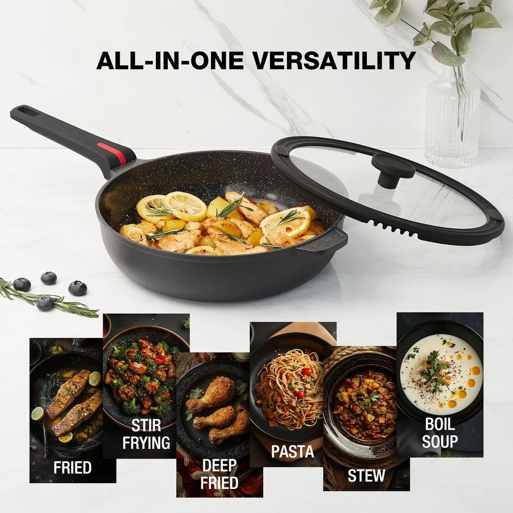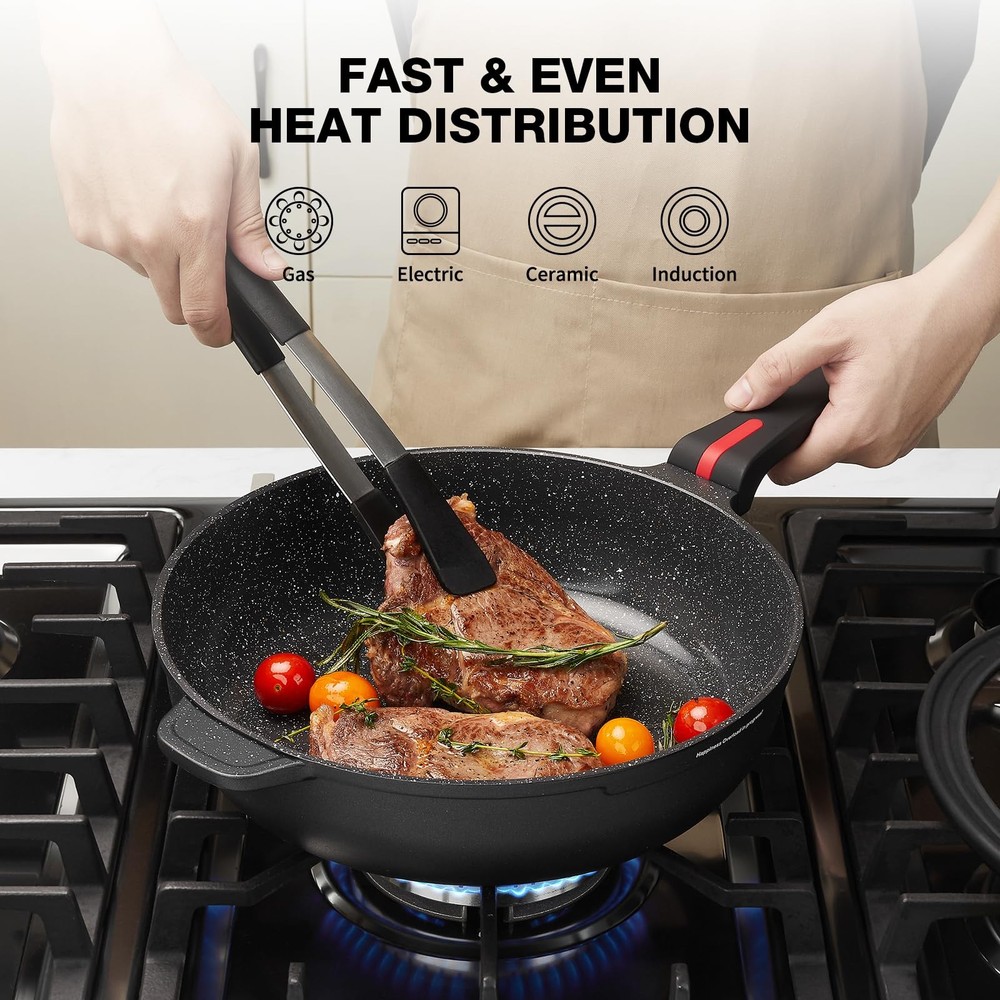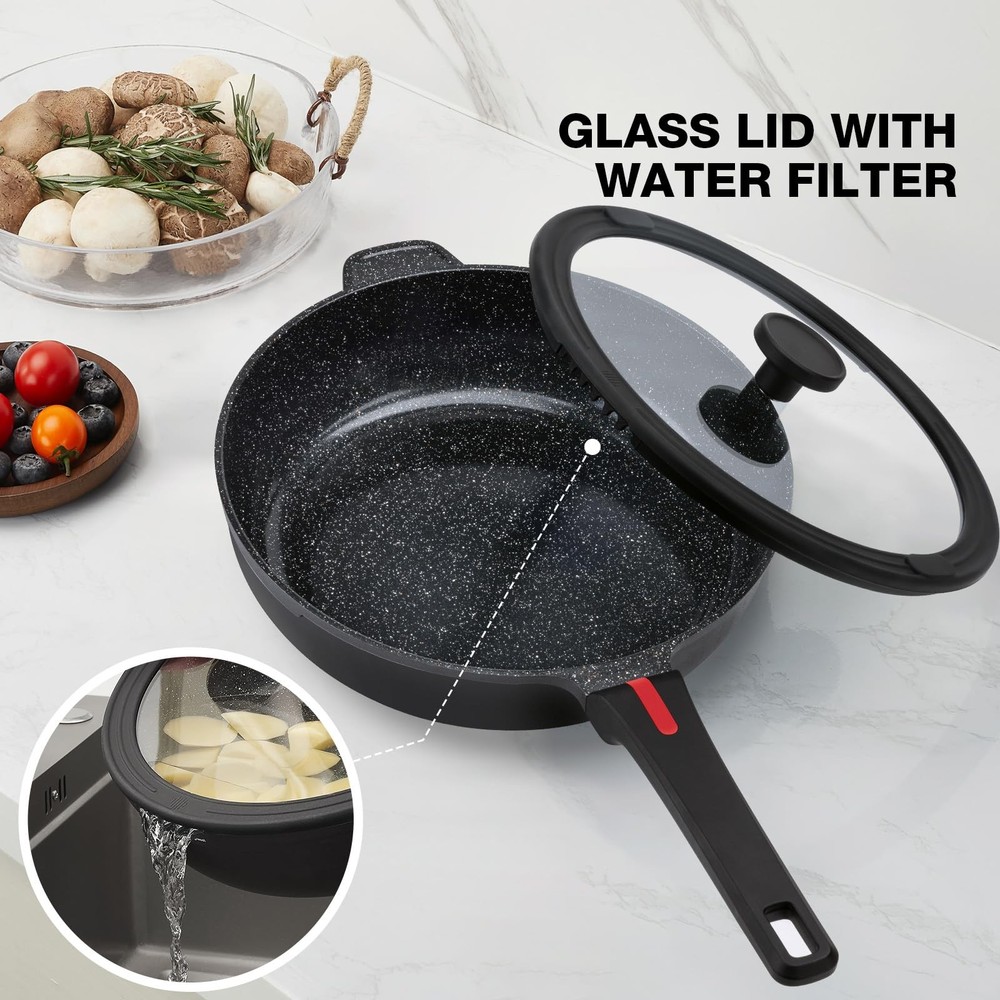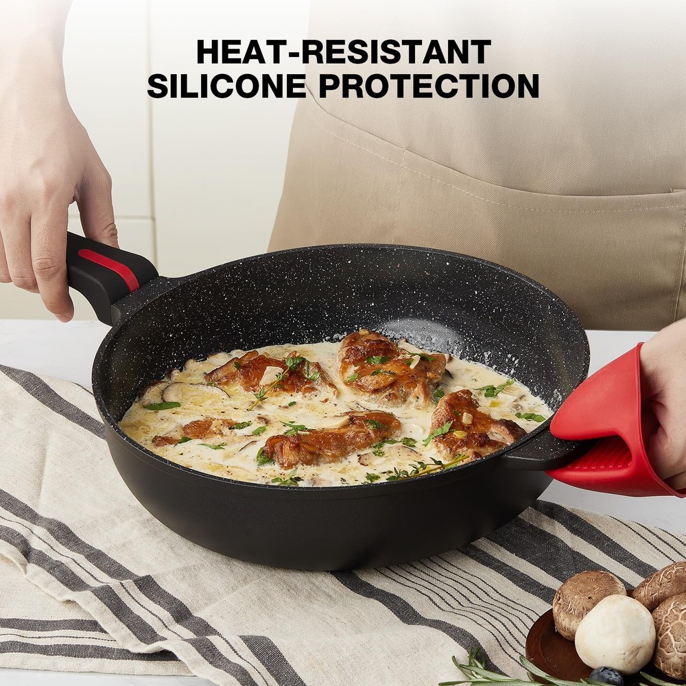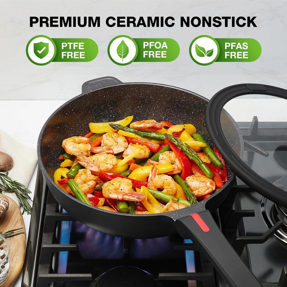 Eco-Friendly Double Non-Stick Ceramic Coating: Experience exceptional 5X nonstick performance with our advanced coating. Enjoy healthier cooking that’s 100% PTFE and PFOA-free, requiring less oil and making cleanup a breeze. All-In-One Versatility: The large frying pan combines lasting durability with a lightweight design, made possible by its die-cast construction. Perfect for a variety of cooking tasks, it excels at sautéing, poaching, braising, and deep frying. Heat-Resistant for Added Safety: The handle features heat-resistant silicone wrapping, an auxiliary grip, and includes a silicone oven mitt for excellent heat insulation and secure handling. Glass Lid with Built-In Strainer: The silicone-rimmed glass lid includes a built-in strainer for easy soup pouring and lets you monitor cooking progress without lifting the lid. Compatible with All Stovetops: Designed for gas, induction, electric, halogen, and ceramic stovetops, it heats quickly and evenly for versatile cooking.