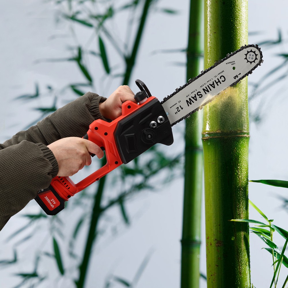 Specifications Style: Modern Model: 18D04 Color: Red, Black Battery Voltage: 21V Battery Capacity: 3000mAh Plug Standard: US Standard Power Source: Battery Powered Motor Type: Brushless Motor Assembly Required: Yes Guide Bar Length: 30.48cm/12 in Adapter Model: SRJ210100 Adapter Input: AC 100-240V, 50/60HZ, 0.8A Adapter Output: 21V 1.0A Gross Weight: 3.5kg/7.72 lbs Package Included 1* Chainsaw Mainframe 1* Guide Bar 1* Chain 1* Battery 1* Charger 1* Protective Baffle 1* Handel 1* Wrench 1* English Manual 12 Inch Electric Chainsaw Portable Handheld Cordless Chainsaw w/ Battery&Charger Welcome~ Description Using traditional axes to cut wood is inefficient and very tiring, so you can choose our mini cordless chainsaw for improving efficiency in pruning, wood cutting, and gardening. It boasts a high quality and provides a great cutting effect, all while featuring a lightweight and compact design. With a battery-powered power source, it can be conveniently used for outdoor operations, emergencies, and in locations without access to sockets. Having it will make your work easier and simpler! Key Features Sturdy and Durable: The product is made of high-quality materials, using exquisite craftsmanship, with high strength, wear resistance , and long service life. High Efficiency: Thanks to its premium motor, strong power, sharp chain, long guide plate (12 in), and fast chain speed, this item can achieve a large cutting diameter with less power consumption, allowing you to prune, saw, and log with less time and effort. Environment-friendly: Adopting rechargeable lithium batteries as the power source without plugging in wires, this chainsaw is more environmentally friendly compared to other gasoline-powered chain saws because it does not generate gas and emissions. Long-lasting Battery : The large-capacity (3000mAh) lithium battery can make the product work for long hours, so do not have to worry about frequent charging and power emergencies affecting the work. The equipped charger ensures timely charging for the battery. Thoughtful Design: The oil level window allows you to monitor changes in the oil level in real-time to facilitate timely refilling. Good Heat Dissipation Performance: The heat-sink holes on the machine ensure a good heat dissipation effect, which can effectively avoid excessive body temperature, thereby extending the service life of the machine. High Safety: The safety lock and on/off trigger provide a double safeguard against accidental activation and protect your use. Easy to Use: Easy to Use : With the lightweight (gross weight: 7.72 lbs ), compact design( 25.59 in total length), and a detailed English manual, you can easily operate the cordless chainsaw. Even the elderly and women can easily operate and control it, making cutting and trimming a pleasure. Customer Service: We aim to provide high-quality products and services. If you have any questions, please feel free to contact us. We will reply as soon as possible and solve the problem for you. Details Protective Baffle: It reduces workpiece debris splashing and protects you from injury during cutting. Ergonomic Handles: The ergonomic handle has textured skin, gives you a comfortable grip without slipping, absorbs shock, and reduces hand fatigue even in long-term use. The auxiliary handle is easy to control to achieve a good balance and high-cutting performance. Application It is widely used in gardens, parks, farms, ranches, pastures, orchards, greenhouses, forests, camping, etc., and can be used for forest harvesting, wood cutting, small branch pruning, bush pruning, gardening, home woodworking, bamboo sawing, logging, DIY crafts, and so on. Specifications Style: Modern Model: 18D04 Color: Red, Black Battery Voltage: 21V Battery Capacity: 3000mAh Plug Standard: US Standard Power Source: Battery Powered Motor Type: Brushless Motor Assembly Required: Yes Guide Bar Length: 30.48 cm/12 in Adapter Model: SRJ210100 Adapter Input: AC 100-240V, 50/60HZ, 0.8A Adapter Output: 21V 1.0A Gross Weight: 3.5kg/7.72 lbs Total Height(Battery Included): 65cm/25.59in Battery Size(L*H): 20*14cm/7.87*5.51in Package Size: 16*20.5*36cm/6.3*8.07*14.17 in Package Included 1* Chainsaw Mainframe 1* Guide Bar 1* Chain 1* Battery 1* Charger 1* Protective Baffle 1* Handel 1* Wrench 1* English Manual Notes Please note that gloves (not included) should be worn if necessary. Please keep the product out of reach of children to avoid injury. Please use this product to cut wood within the applicable size range. Please note that this product does not come with lubrication oil. Please read the English manual completely before use, and pay particular attention to the safety instructions included. Please fully charge it before your first use. Please confirm the direction and tightness of the chain before use. If it is not used for a long time, please remember to fully charge the battery first for a better experience the next time you use it. Please allow the slight color difference caused by the shooting light and 1-3cm error due to manual measurement, and make sure you do not mind before you order. tu1 Payment Delivery details Terms of sales About us Contact us Payment We accept ebay payment 。 Fees such as import duties, taxes are not included in the item price or shipping costs. These charges are the buyer's responsibility. Delivery details Shipping: 2-9 working days to: USA Terms of sales We maintain high standards of excellence and strive for hundred percent customer satisfaction. Feedback is very important to us. We hope that you contact us immediately before you give neutral or negative feedback, so that we can address your concerns. It is impossible to address issues if we do not know about them! About us Your satis faction is our ultimate goal. We work hard to earn your trust and future business. Our certified technicians have tested each item before shipping. The unit comes with 1 year limited warranty on all manufacturing defects. a) If you receive a d