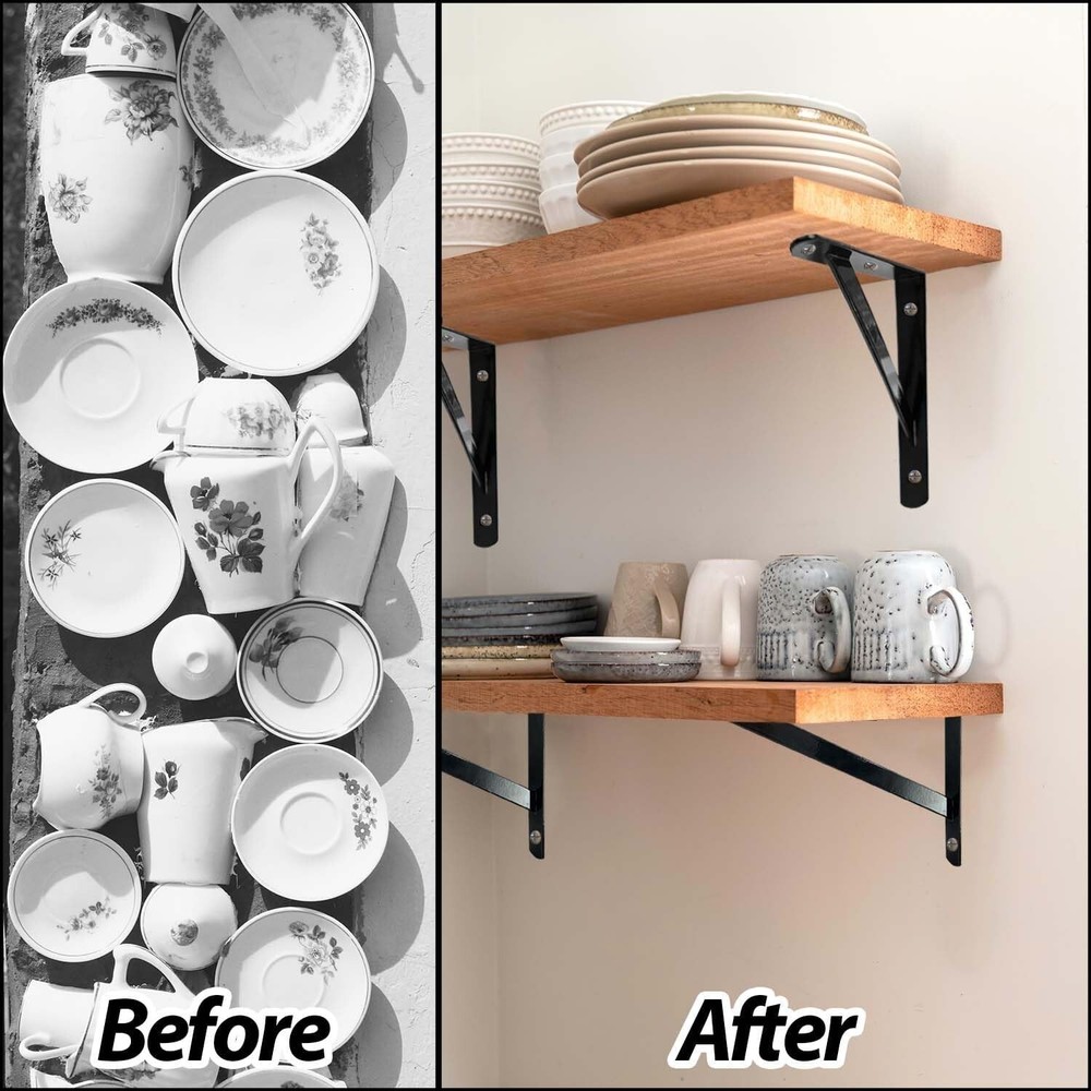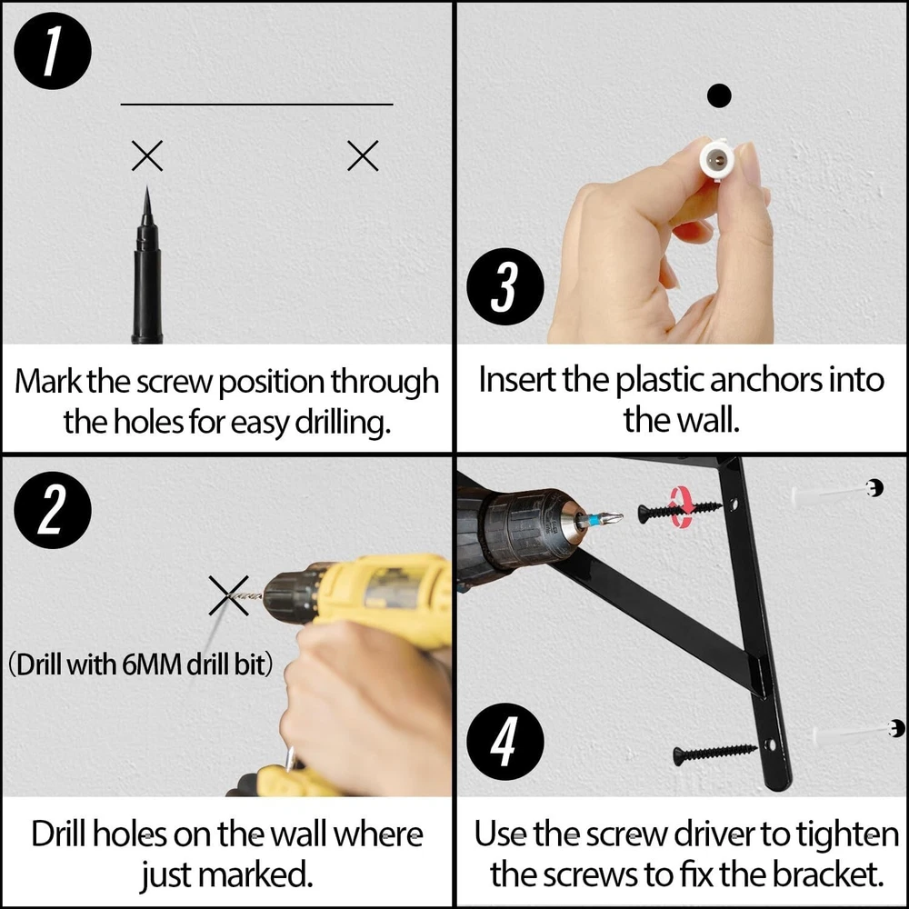 12" X 8" Heavy Duty Shelf Brackets with Screws Metal Shelves Supports Wall Mount Product Description: Package includes 12 x Brackets , 24 x Long Screws and Anchors, 36 x Short Screws. Made of high quality steel with black powder-coating finish, our brackets are durable, water and corrosion resistant. Pre-drilled fixing holes on each side and included screws are convenient for installation. Heavy duty design with max weight capacity per pair is up to 110lb/50kg. Perfect for DIY floating shelving for your home, office, garage and kitchen etc.