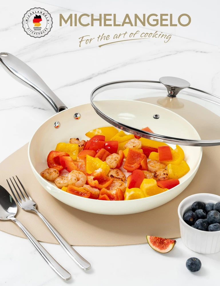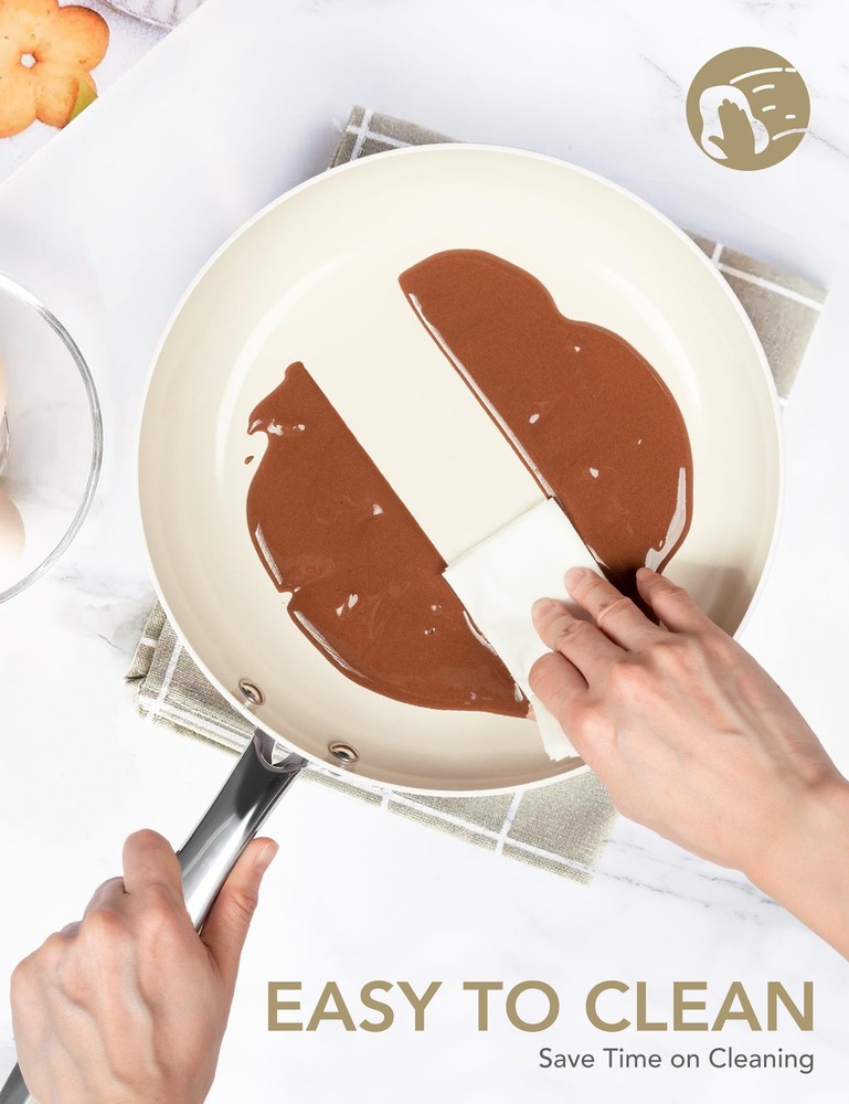 frying pan nonstick with lid - 12 inch, whiteThis 12 inch nonstick frying pan is designed to make your meals healthier, easier, and more enjoyable. The non-toxic ceramic coating ensures a chemical-free cooking experience, free of PTFE and PFOA. Enjoy effortless food release with minimal oil. Whether you're making eggs, stir-fries, or meats, the nonstick surface guarantees smooth cooking and quick cleanup. Made with high-quality aluminum, this 12 inch skillet is scratch-resistant and designed for long-lasting performance. The alloy base promotes fast, even heat distribution, allowing for quicker cooking and perfect results. Oven-safe up to 450℉ and equipped with a comfortable, heat-resistant ergonomic handle, this 12 inch ceramic frying pan is perfect for stovetop and oven cooking.Upgrade your cooking experience with this versatile 12 inch nonstick frying pan with lid, cook with confidence and enjoy perfectly cooked meals every time! Healthy Cooking - This nonstick frying pan features a non-toxic ceramic coating that allows you to cook without worrying about harmful chemicals like PTFE and PFOA, providing a safer and more natural way to prepare your favorite dishes. Superior Nonstick Performance - Enjoy the superior nonstick surface of this ceramic frying pan, which ensures easy food release. Whether you’re cooking eggs, sautéing vegetables, or preparing meats, this 12 inch frying pan allows smooth cooking with minimal oil. Cleanup is quick and easy—just wipe or toss it in the dishwasher. Durable Aluminum Body – Made from premium aluminum, this non stick frying pan is designed for daily use and long-lasting performance. The large frying pan resists scratches and wear, ensuring reliable cooking results even with frequent use. Even Heat & Versatile Stovetop Use - Featuring an alloy base, this ceramic nonstick frying pan provides fast and even heat distribution for quicker cooking. Compatible with gas, electric, and induction stovetops, this versatile skillet with lid is ideal for any kitchen. Oven Safe & Ergonomic Handle - This non-stick frying pan is oven-safe up to 450℉, making it perfect for recipes that require both stovetop and oven cooking. Equipped with an ergonomic stainless steel handle, this nonstick fry pan ensures a comfortable and secure grip during cooking.