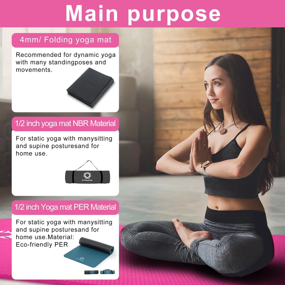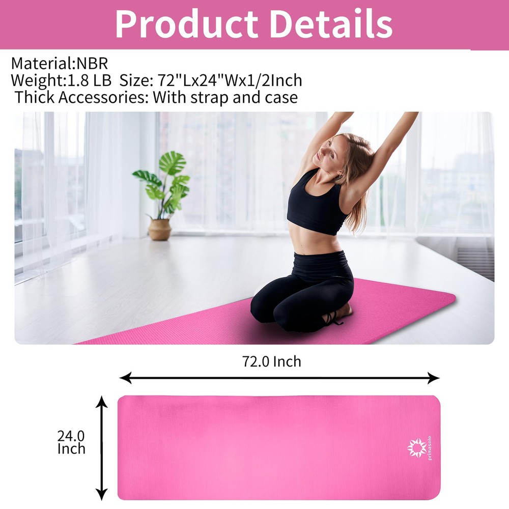 Extra-thick at 1/2 Inch, yoga mat provides excellent cushioning, and reduces pain during yoga sessions and various training. It makes various poses and exercises possible with its special horizontal-striped embossed pattern that prevents slipping. You can also wash it off after use, so it can always be maintained clean. Includes a strapped storage case that is easy to carry. Since it is made of NBR material, it is very light and easy to carry at just 1. 8 pounds, despite being very thick. 【TRUSTED BRAND 】is a fitness brand established in April 2019. We have a lineups of yoga mat, Exercise yoga ball, Balance disc, Foam Roller that helps you incorporate fitness into your daily life. 【SIZE & LIGHTWEIGHT】: Mats Size is 72 × 24 inches. Super light weight is only 1.8 lbs. ½ extra thick (10㎜) extra cushion provides comfort stability and Posing. Perfect mats for hard floor or carpet at home and gym. It is more suitable for people with sensitive or injured joints. NBR Material is a non-toxic synthetic rubber material and provide soft, cushioning. 72 inch is large enough to do most of exercises 【NON-SLIP, SECURE AND STABLE】: Embossed surface provides non slip, comfortable and ensures stability during all types of training. Ideal for core strength, posture, balance, and flexibility exercises. Perfect for hot yoga, ab crunches, or Pilates as well as yoga floor and standing poses. 【CHOICE OF FOUR COLORS】: Coordinate with any mood, style, or preference. NBR Foam Material resists peeling, fading, or tearing and wipes clean for easy everyday use and cleaning. Mat comes in variety of colors for women, men, or kids Color comes Pink, Gray, Orenge and Bule 【CARRYING CASE AND STRAP】: Both case and strap are including. Easy to carry and you can chose case for gym, travel, beach, and outdoor.