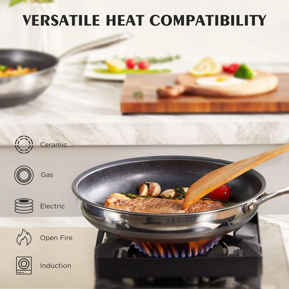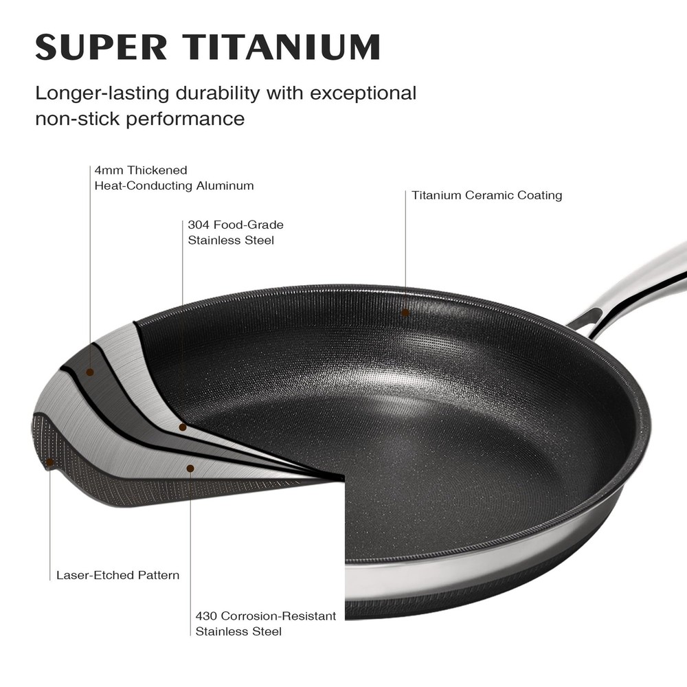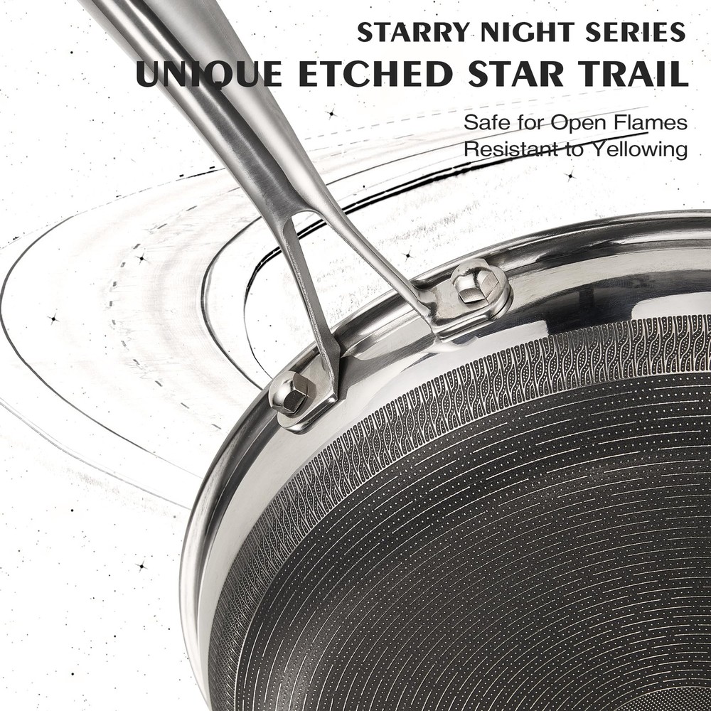 Titanium Ceramic Coating : The titanium ceramic nonstick frying pan set features a healthy, stable, and safe coating free from PTFE, PFOA, PFAS, lead, and cadmium. This nonstick surface ensures that no harmful substances leach into your food. Infused with titanium, it guarantees long-lasting nonstick performance and enhanced durability. Under the light, the unique coating sparkles like a starlit night, adding a beautiful visual delight to your cooking experience. Star-Shaped Raised Texture : The interior of this Skillet Set features star-shaped raised particles that, combined with the titanium ceramic coating, provide exceptional nonstick performance for healthier cooking with less oil. The infusion of titanium ensures long-lasting durability and dual nonstick properties. These star-shaped elements symbolize the stars scattered across vast galaxies, making every cooking experience feel cosmic and extraordinary. 5-Layer Structure : The stainless steel frying pan features a nonstick titanium ceramic interior, a 4mm extra-thick aluminum core, and a dual-layer 403 stainless steel design, ensuring rapid and even heat distribution along with outstanding durability. The outer star-trail etched layer prevents yellowing caused by flames and stains. Its five-layer structure locks in heat, preserving flavors and textures for an exceptional cooking experience. Exceptional Compatibility : Compatible with gas, induction, and electric stoves, this stainless steel pan set is oven safe up to 450°F. Perfect for baking, frying, or sautéing, it offers versatile cooking options. Plus, it’s dishwasher safe for easy cleaning, making it a convenient addition to any kitchen. Stay-Cool Handle:This stainless steel nonstick frying pan with lid features an extended, ergonomic handle that stays cool during cooking. Designed for a secure, comfortable grip, it offers effortless control across all dishes and cooking methods, becoming a seamless extension of your hand.