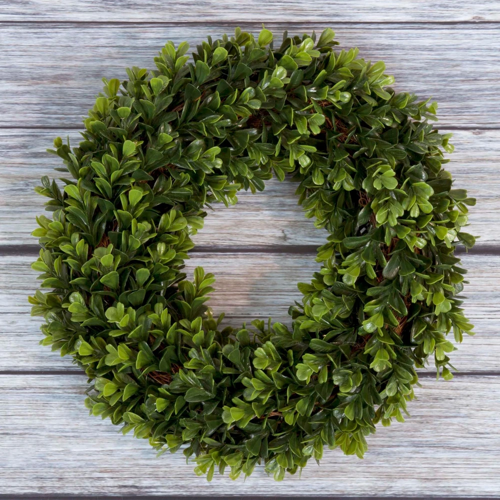 12-INCH WREATH - The faux boxwood door wreath is UV-protected to resist fading in sunny conditions, so it maintains a vibrant hue over time. These versatile all-season wreaths are perfect for summer, fall, winter, or spring door décor. LIFELIKE DESIGN - The vivid greenery of the front door wreath is full of natural-looking color variations and enhanced with embedded faux twigs to give the boxwood wreath a lush and lifelike appearance to your kitchen, living room, or front door décor. ALL-SEASON USE - Add some colorful berries to transform it into a holiday wreath or create fall and spring inspiration with a welcoming classroom door decoration by attaching golden-hued artificial leaves or flowers to the rich green faux foliage. LOW MAINTENANCE - This outdoor wreath needs no special care to keep it looking fresh and clean. Simply dust the wreaths for front door occasionally or wipe the leaves with a soft cloth to keep them looking great for year-round use indoors and out. PRODUCT DETAILS - Materials: UV-Resistant Plastic. Dimensions: (L) 12" x (W) 12". Color: Green.