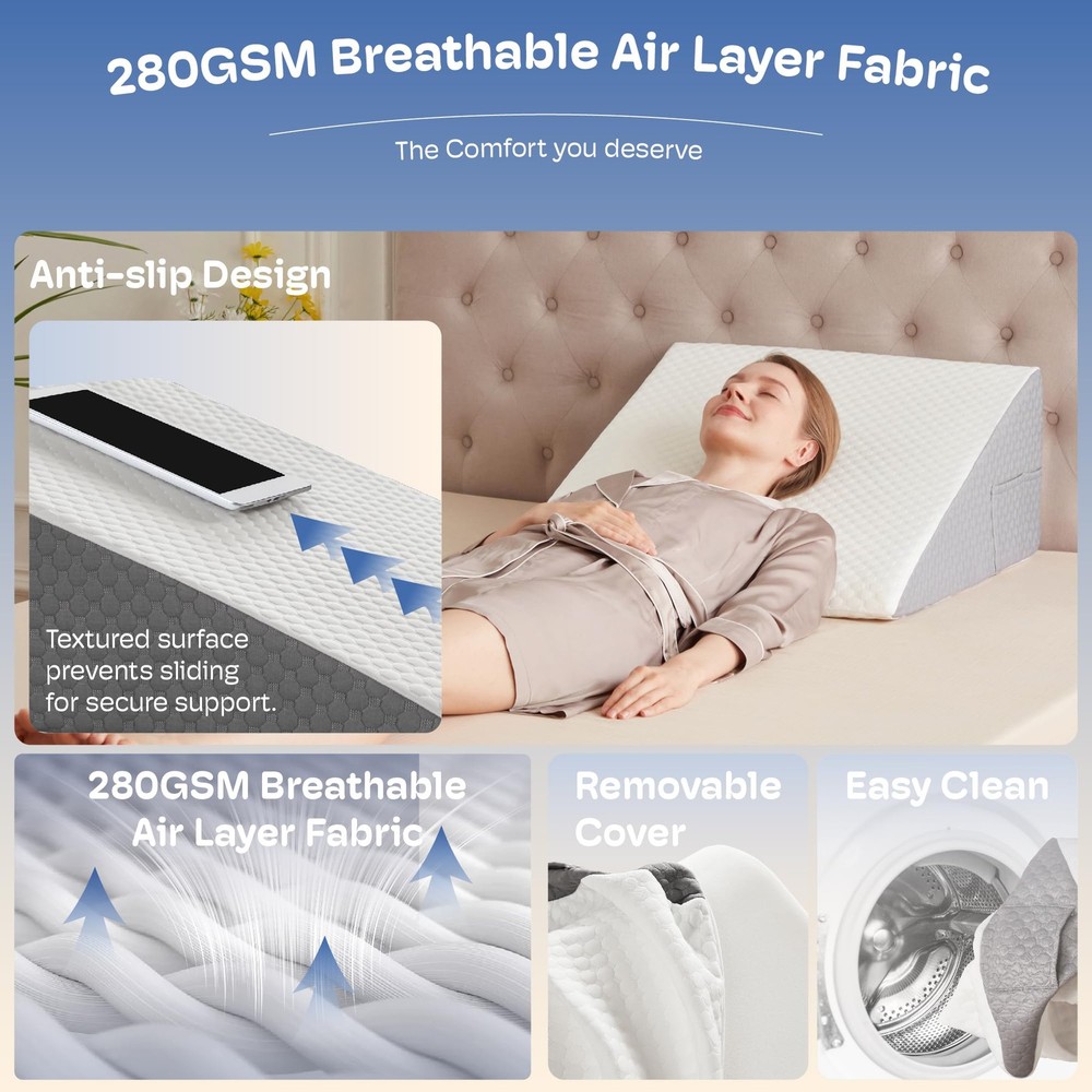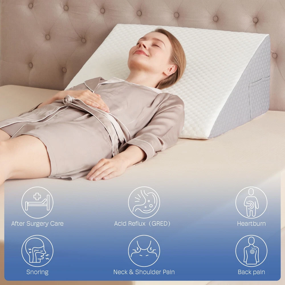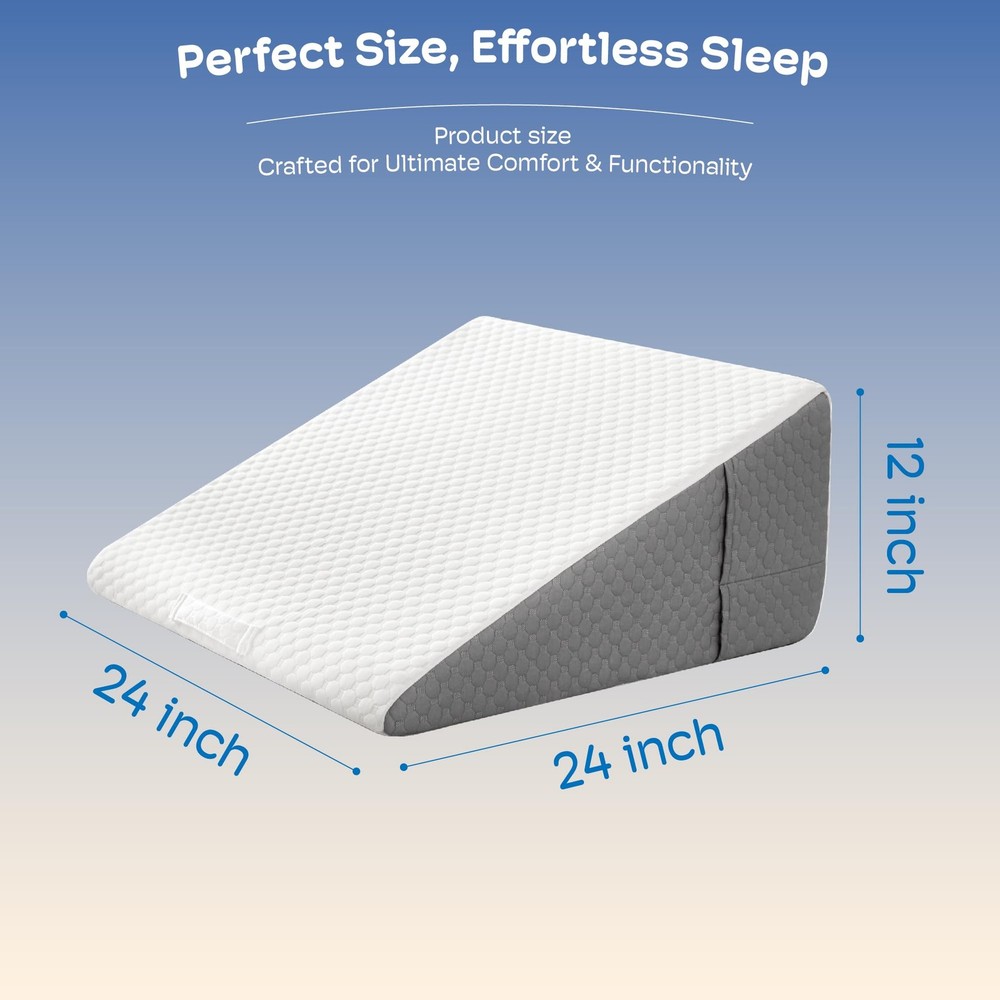triangle wedge pillow bed gap filler queen king incline sleeping headboard sitting up post after surgery acid reflux memory foam wedge adults mastectomy orthopedic reading neck shoulder pain knee leg ankle elevation SUPER COMFORTABLE WEDGE PILLOW: Features 45D cooling gel-infused memory foam on top, offering a soft and slow rebound that ensures every inch of your skin fits snugly against the wedge pillow headboard. It also includes 25D high-density premium foam for reliable support. Available in 7.5-inch and 12-inch heights to meet your different needs (24 x 24 x 12). PORTABLE WEDGE PILLOW FOR BACK PAIN RELIEF: Portable carry handle for easy repositioning. Dual side pockets are designed to hold your glasses, remote control, mobile phone, and other belongings, so you don't have to worry about waking up and not being able to find them. MULTIPLE EFFECTS FOR ALL DISCOMFORTS: Are you still tired because you can't sleep well at night? This bed wedge pillow for sleeping also suitable for acid reflux relief (GRED), post-operative recovery, snoring, and heartburn. Additionally, it can help alleviate headaches, shoulder and neck pain, back pain, as well as leg and knee pain. Its mission is to make you more comfortable while resting or sleeping. MULTIPLE USAGE SCENARIOS: It's not just a bed wedge, but also a back pillow for bed sitting up or on the couch. It is the perfect companion for reading, using your phone, working, watching TV, or simply relaxing. QUALITY PILLOWCASE: The 280gsm Polyester fiber air layer pillow cover, combined with cooling gel-infused memory foam, keeps you dry and clean even on hot summer days. The anti-slip particle design ensures stability. Featuring a silky smooth zipper, the pillowcase can be easily removed and washed in the machine, making it simple to clean. Sleeping soundly throughout the night is the secret to staying energised the next day.